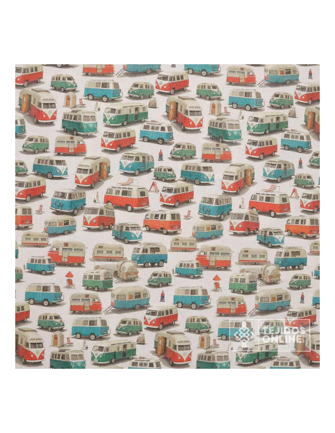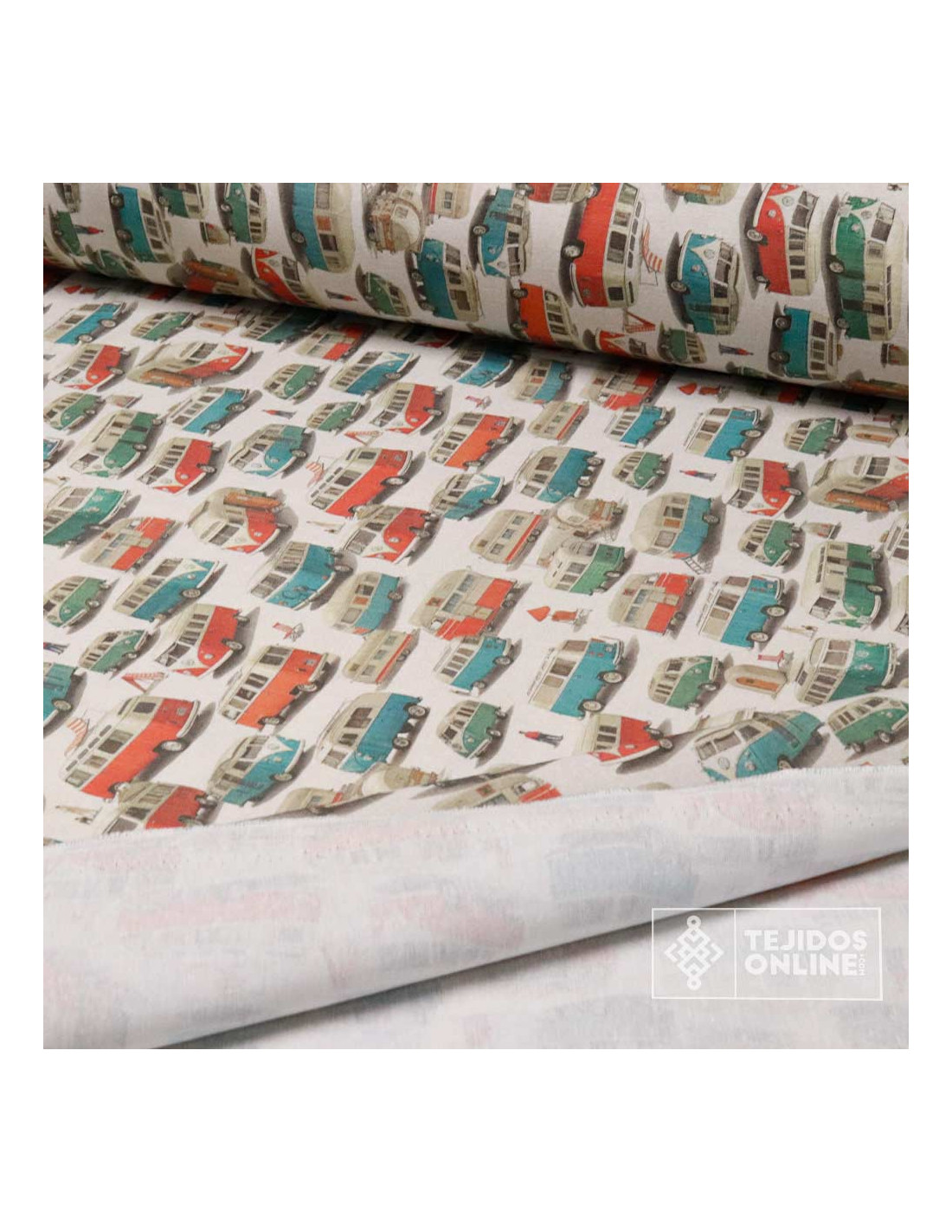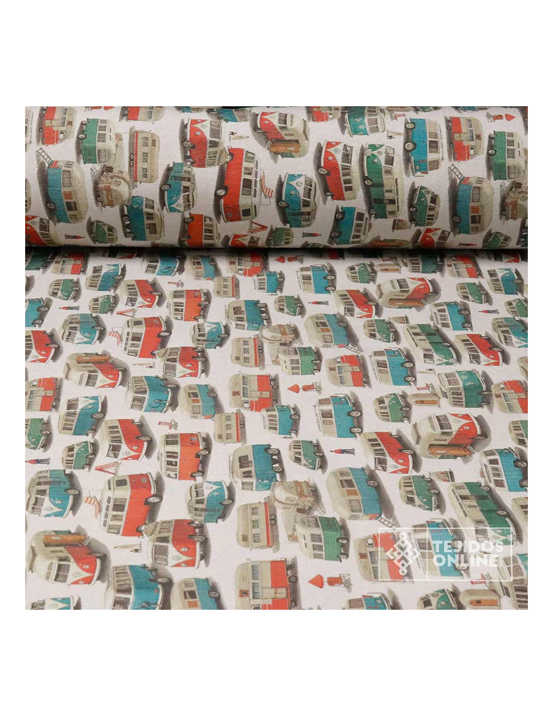 Esta loneta estampada digital tiene un diseño muy original de furgonetas camper estilo vintage, perfecta para los amantes de los viajes, la libertad y el aire retro. Es una tela alegre, con mucho color y un estampado que no pasa desapercibido. Está fabricada en 50% poliéster y 50% algodón, lo que le aporta resistencia y buen cuerpo, ideal para proyectos de costura que necesitan consistencia. Tiene un alto de 1,40 metros y un peso aproximado de 225 gr/m².