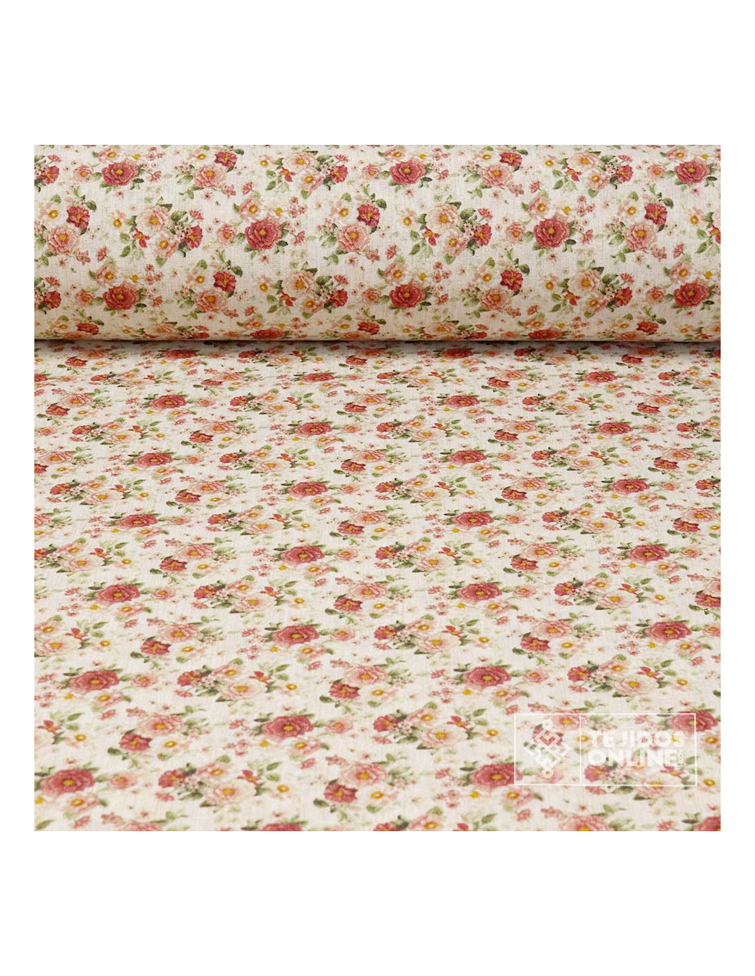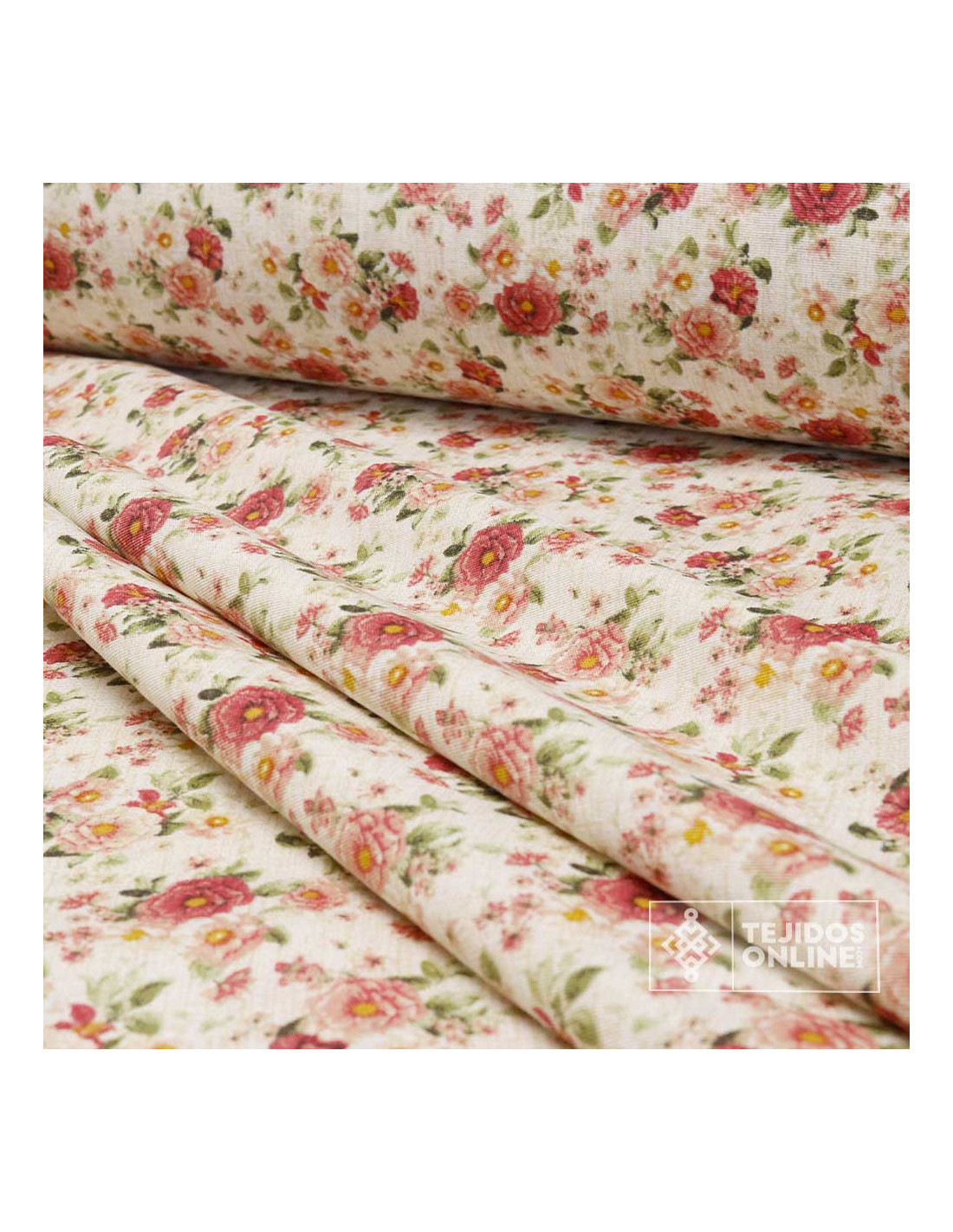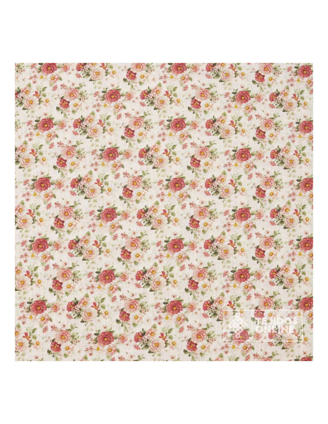 Tela de Flores Estampadas. La Loneta de Flores ,es un tejido con cuerpo, con cierta finura y resistente con un estampado floral clásico y romántico, con pequeñas flores en tonos rojos y azules segun la opción que elijas sobre un fondo beige claro.