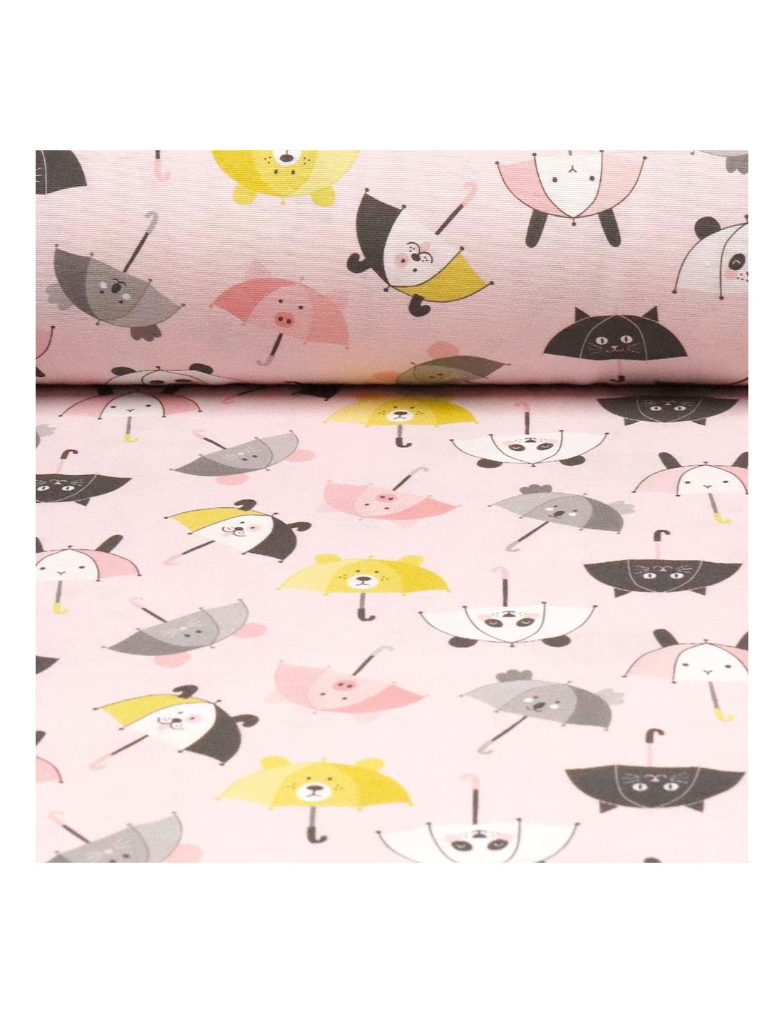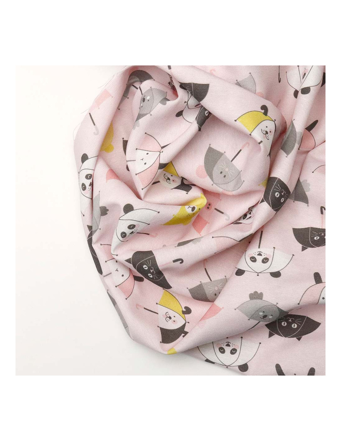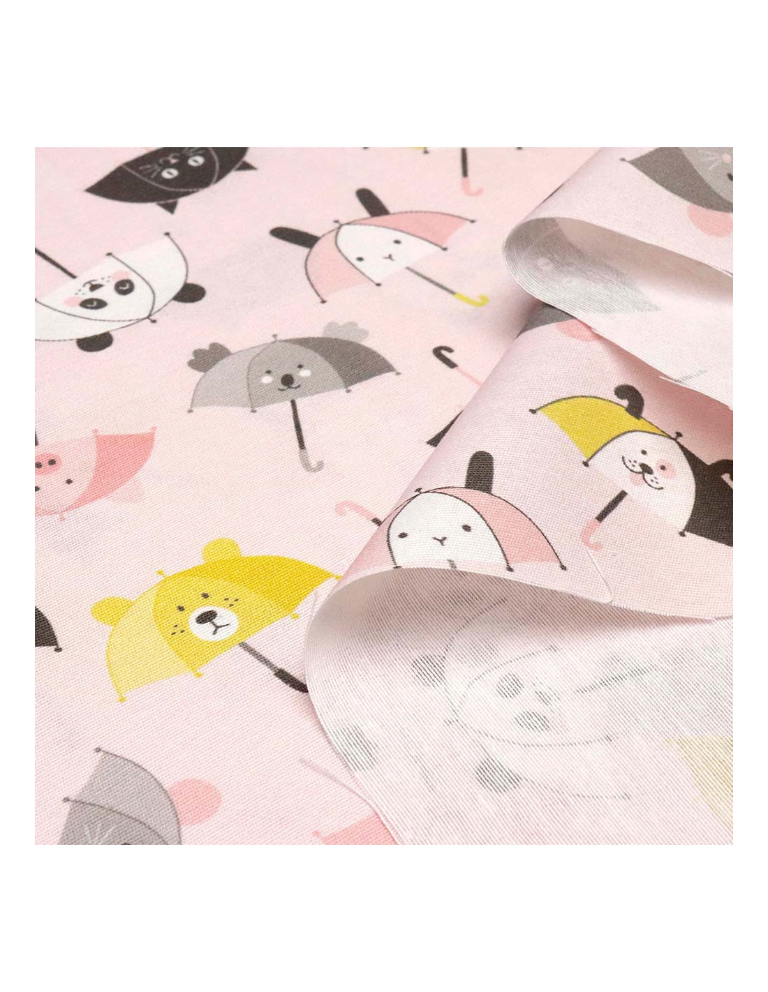 Tela de Loneta estampada de Paraguas con estampados infantiles de animales. Tela en fondo rosa o fondo gris, ideal para todo tipos de proyectos de hogar; cortinas, cojines, tapizados, etc... La Loneta es un tejido con cuerpo, con cierta finura y resistente. A tener en cuenta, tejido con estampación asimétrica, es decir, tejido con varias direcciones. Tejido utilizado para todo tipos de confecciones como; manualidades, vestidos, proyectos infantiles, etc.