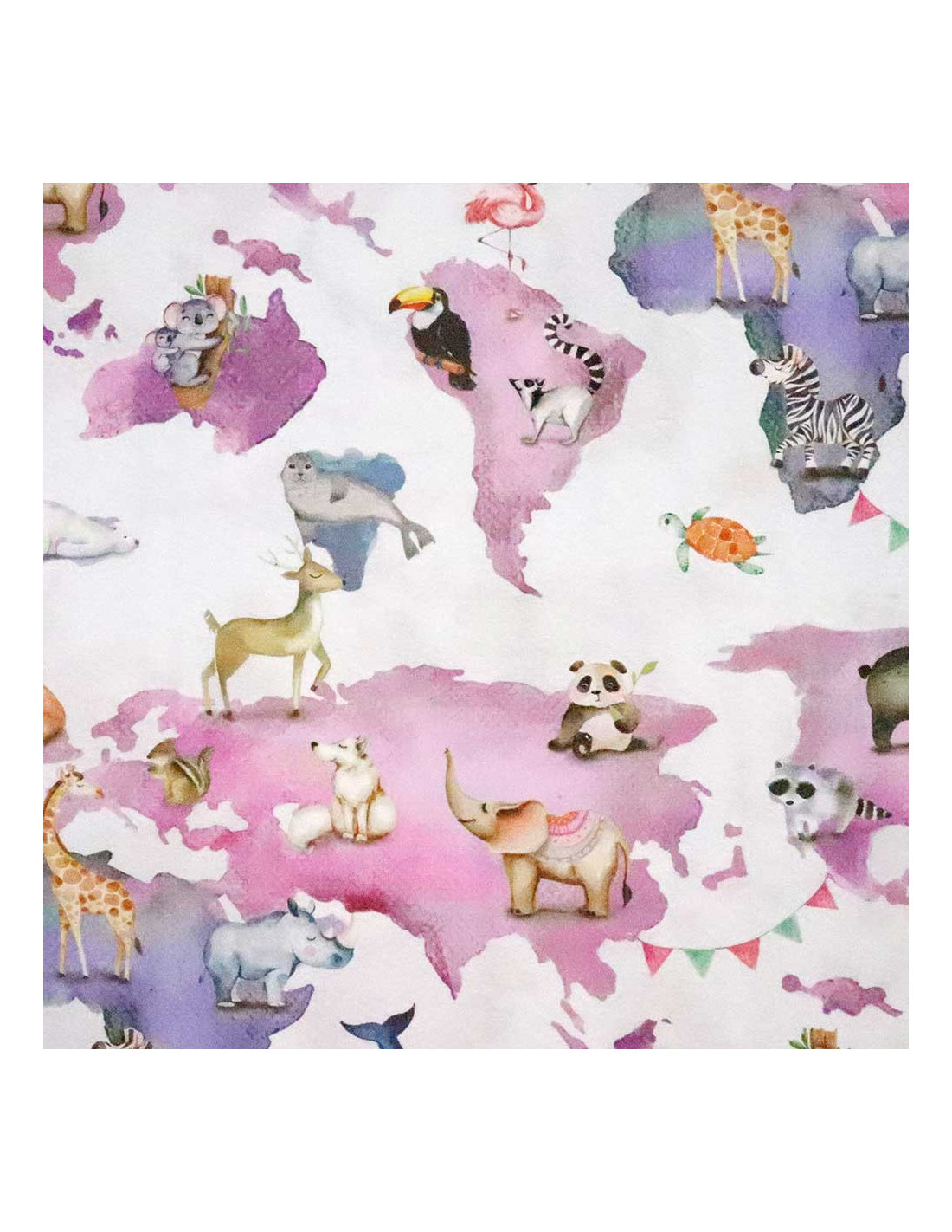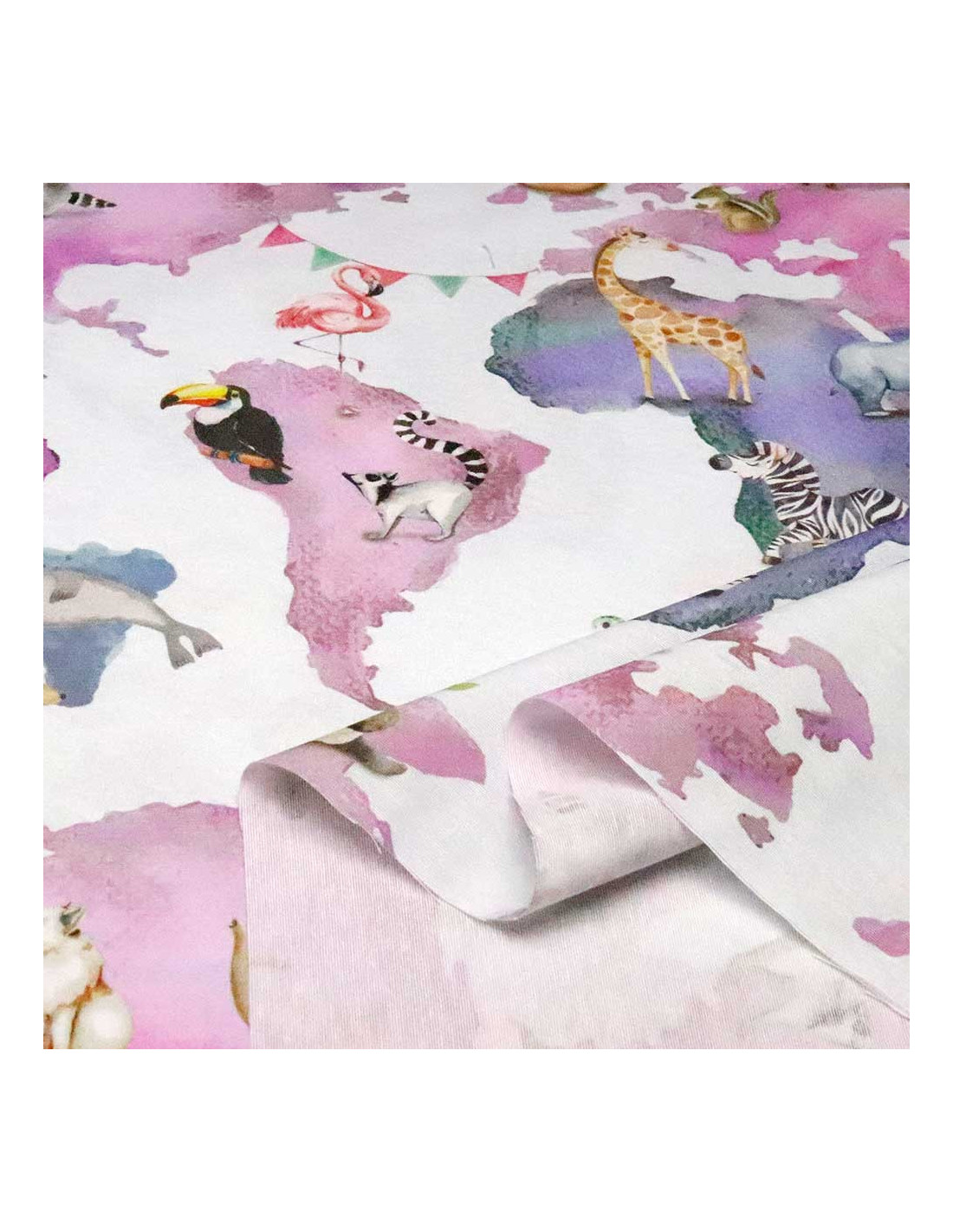 Estampaciones Fantásticas: El tejido de Loneta Zoo Lucia presenta un despliegue de estampaciones de animales fascinantes. Desde jirafas majestuosas hasta ballenas misteriosas, cada animal cobra vida sobre un fondo difuminado celeste que realza su presencia en su continente de origen.