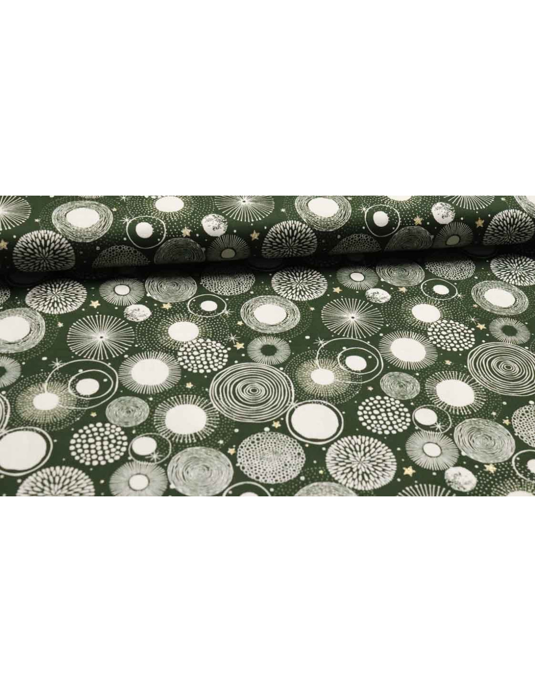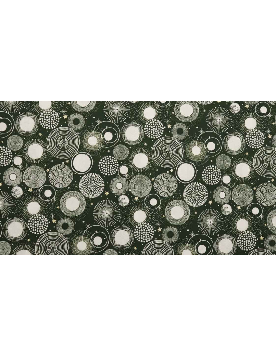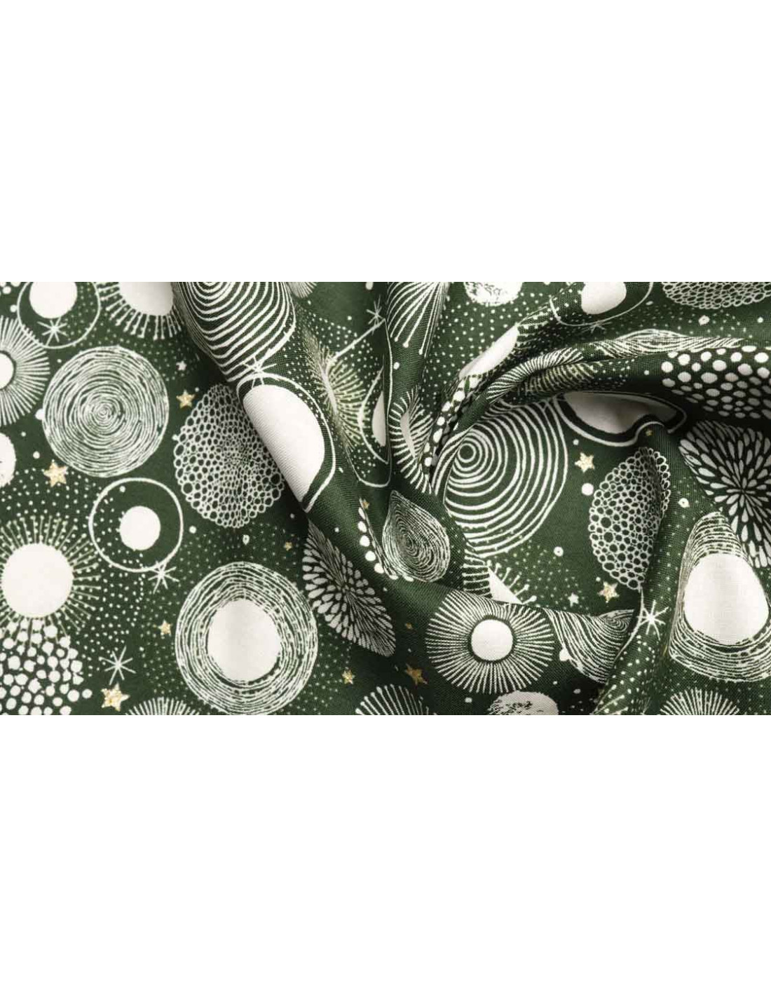 Navidad PatchWork Eclipses Lurex, es un tejido con cierto cuerpo, con cierta finura y suave. Tejido con estampación de círculos navideñas en color blanco destacando estrellas en dorado (lurex), y donde hace del tejido una verdadera maravilla sobre un fondo verde botella. A tener en cuenta, tejido con estampación asimétrica, es decir, tejido que podemos colocar en varias direcciones. Tejido utilizado para todo tipos de confecciones como; (manualidades, servilletas, manteles, fundas, etc…).