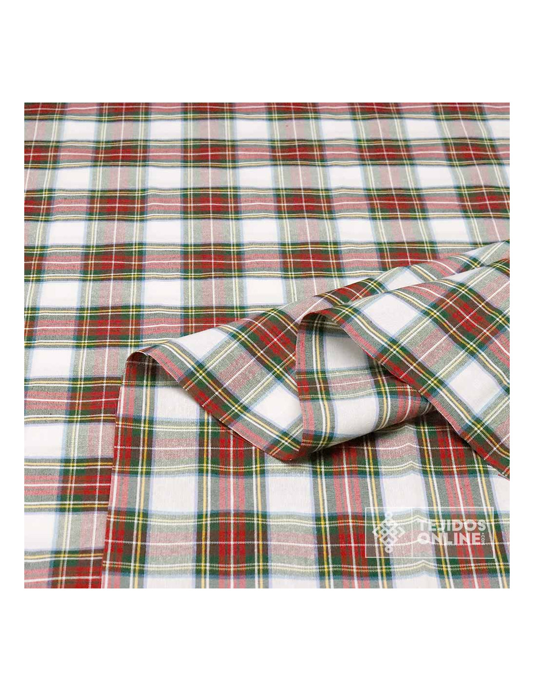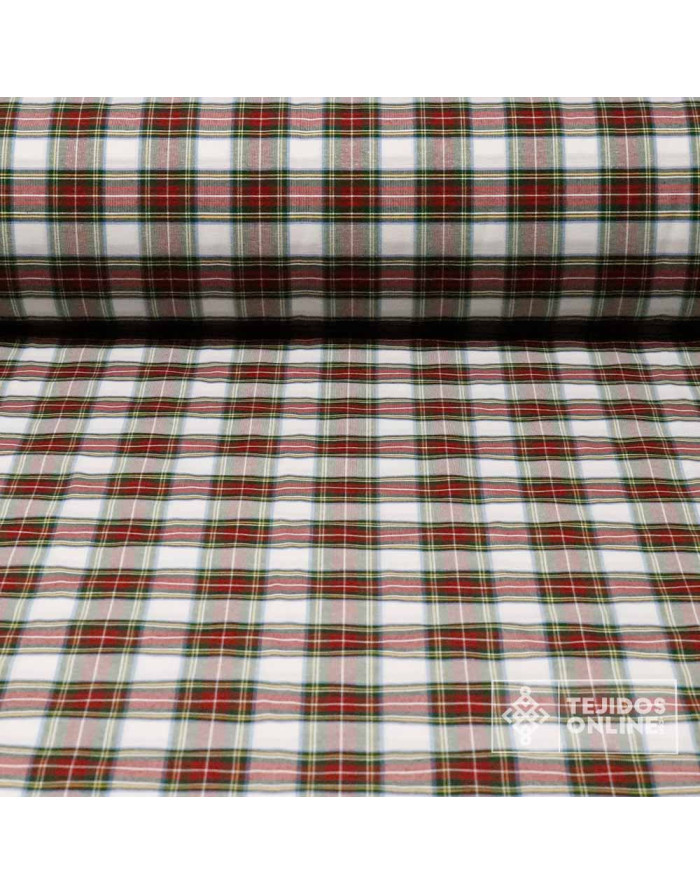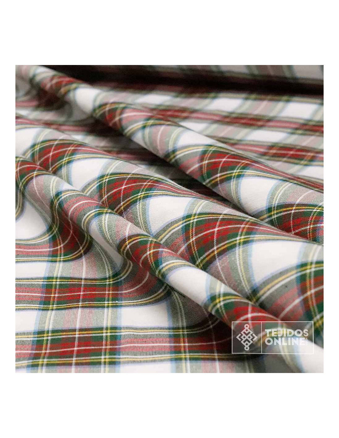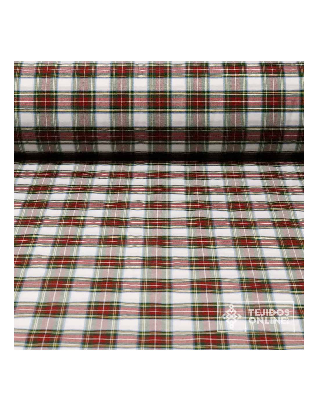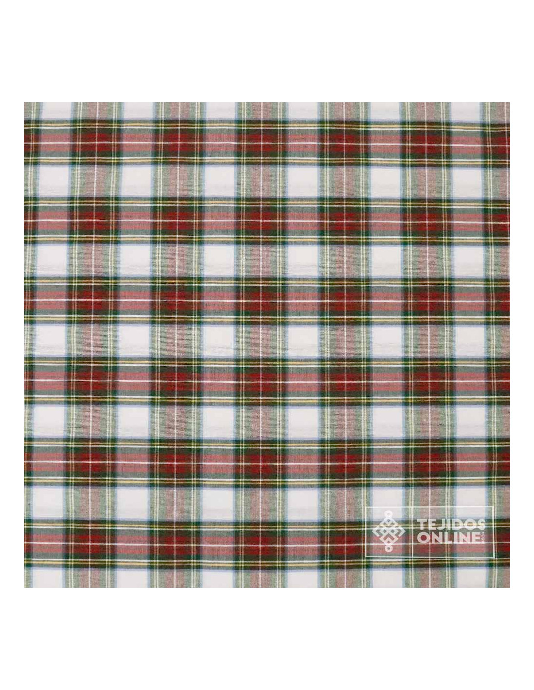 La Loneta Cuadro Escoces blanco es un tejido con cuerpo, con cierta finura y resistente. Tejido fondo blanco con estampaciones de rayas en color rojo y verde las más predominantes formando entre sí el típo cuadro escoces. Es un tejido con 1.40 metros de ancho lo cual se considera doble de ancho, es suave al tacto y resistente gracias a su composición en 50% Poliéster y 50% Algodón.
