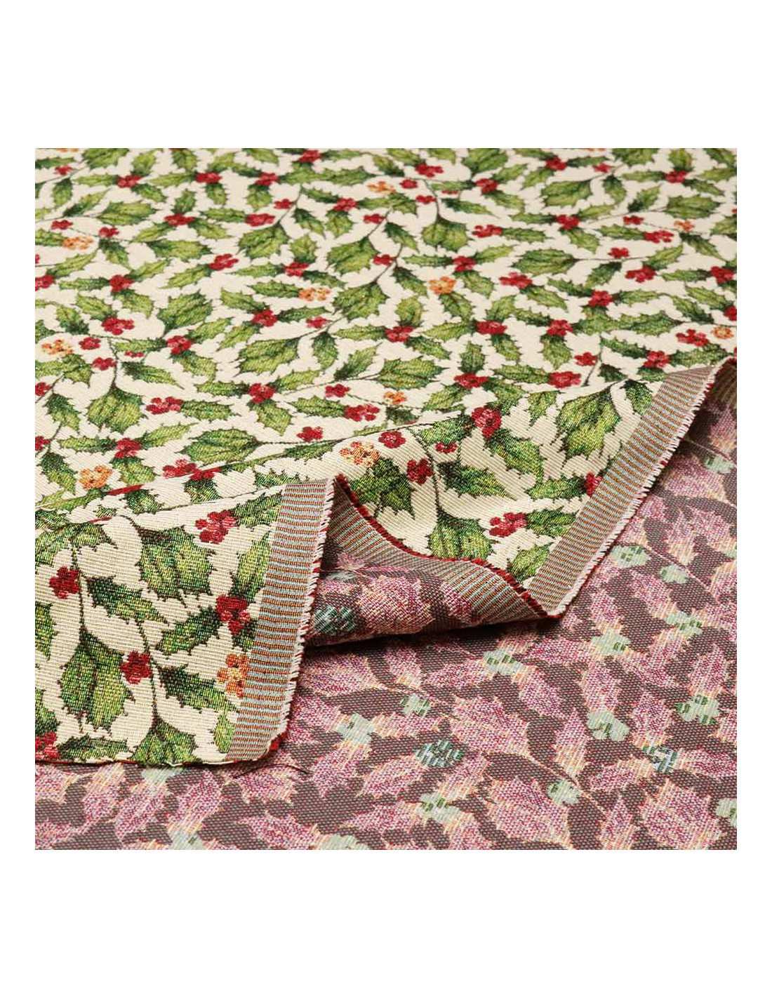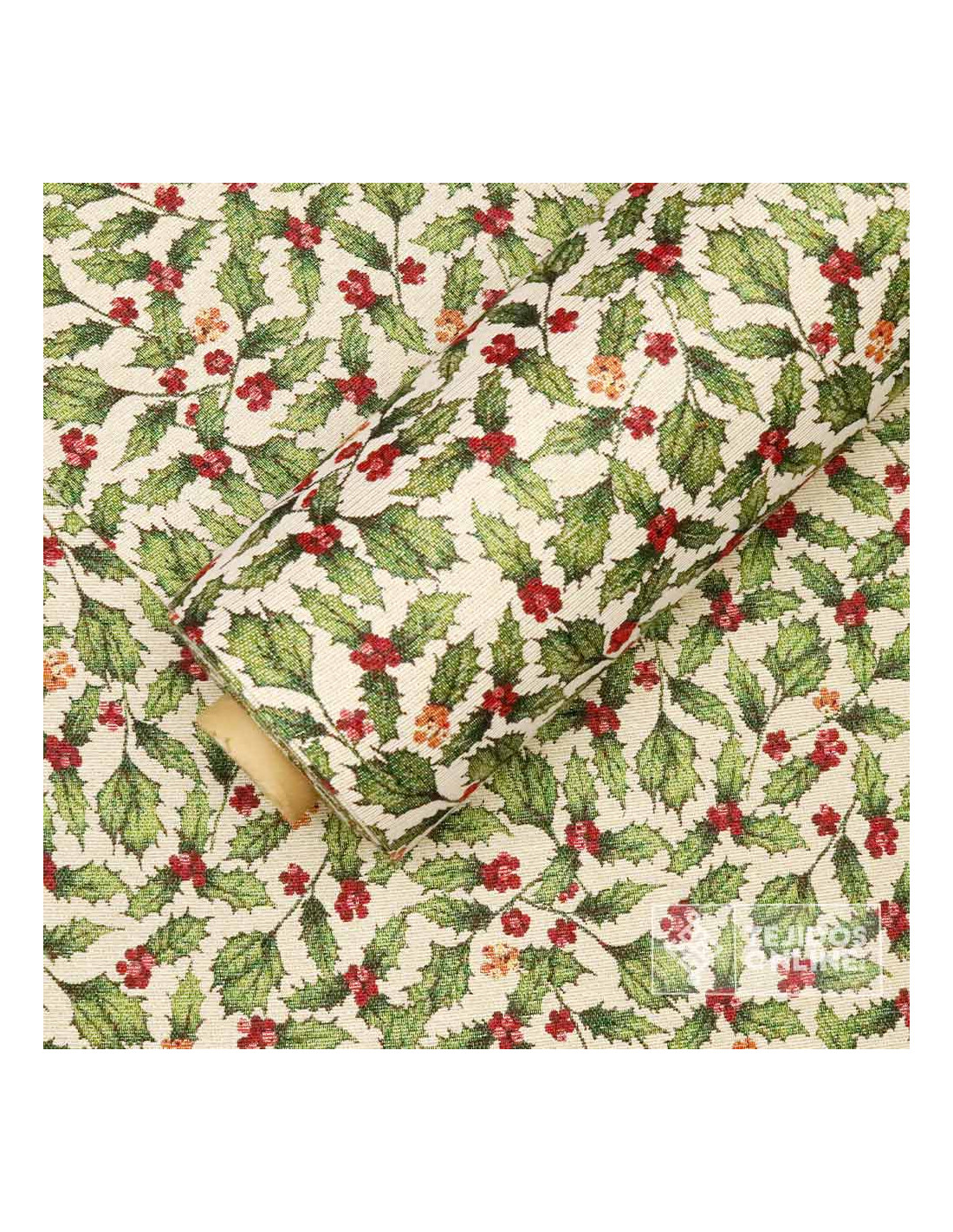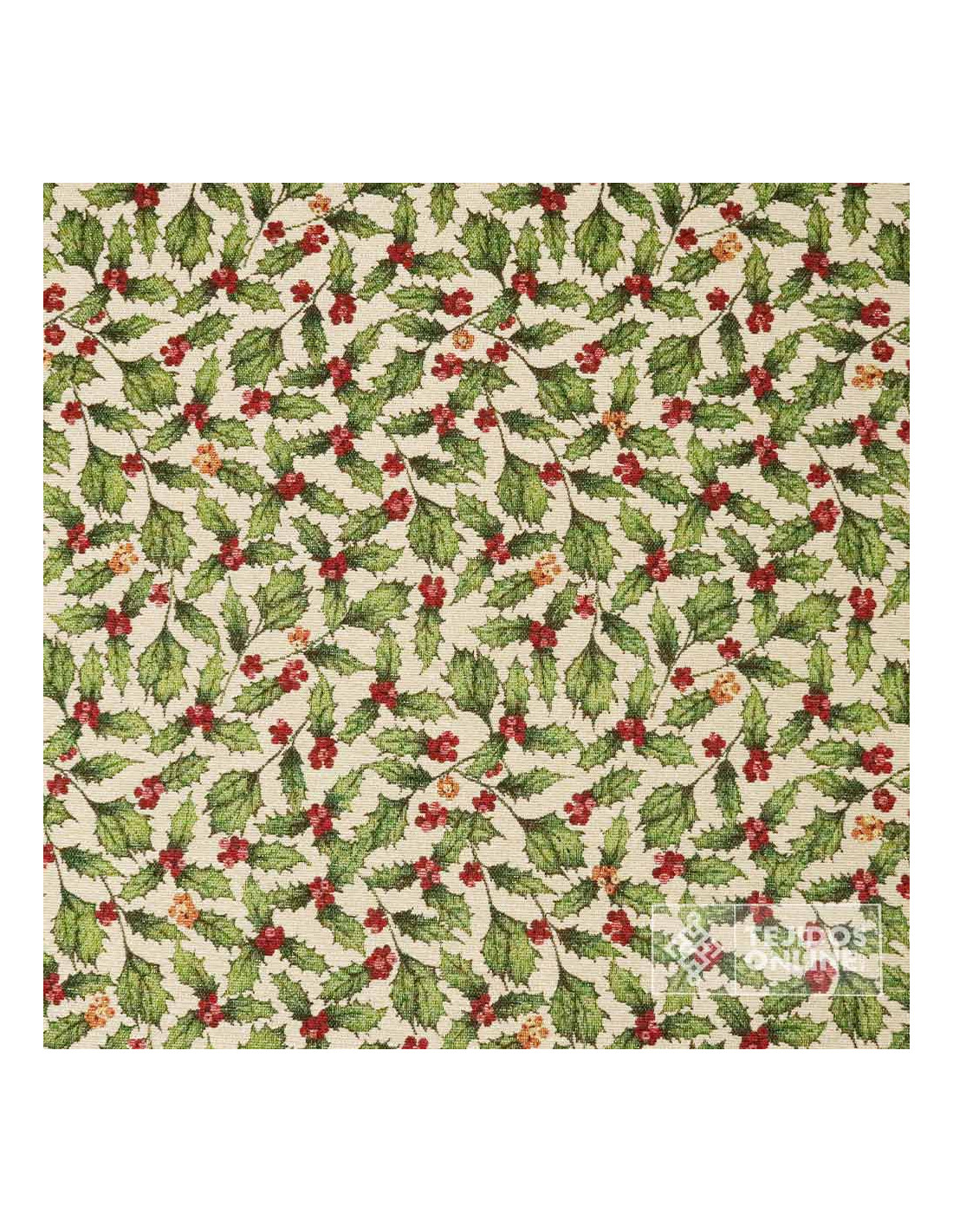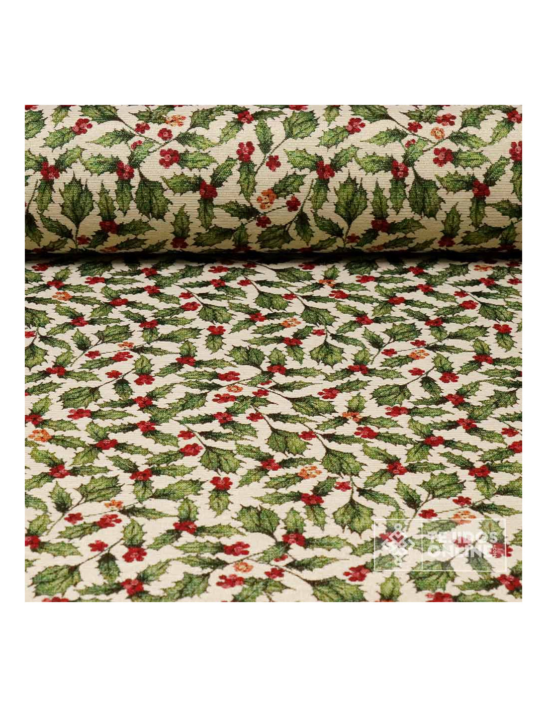 Tela Navidad Tapicería Beige con Hojas y Bayas
