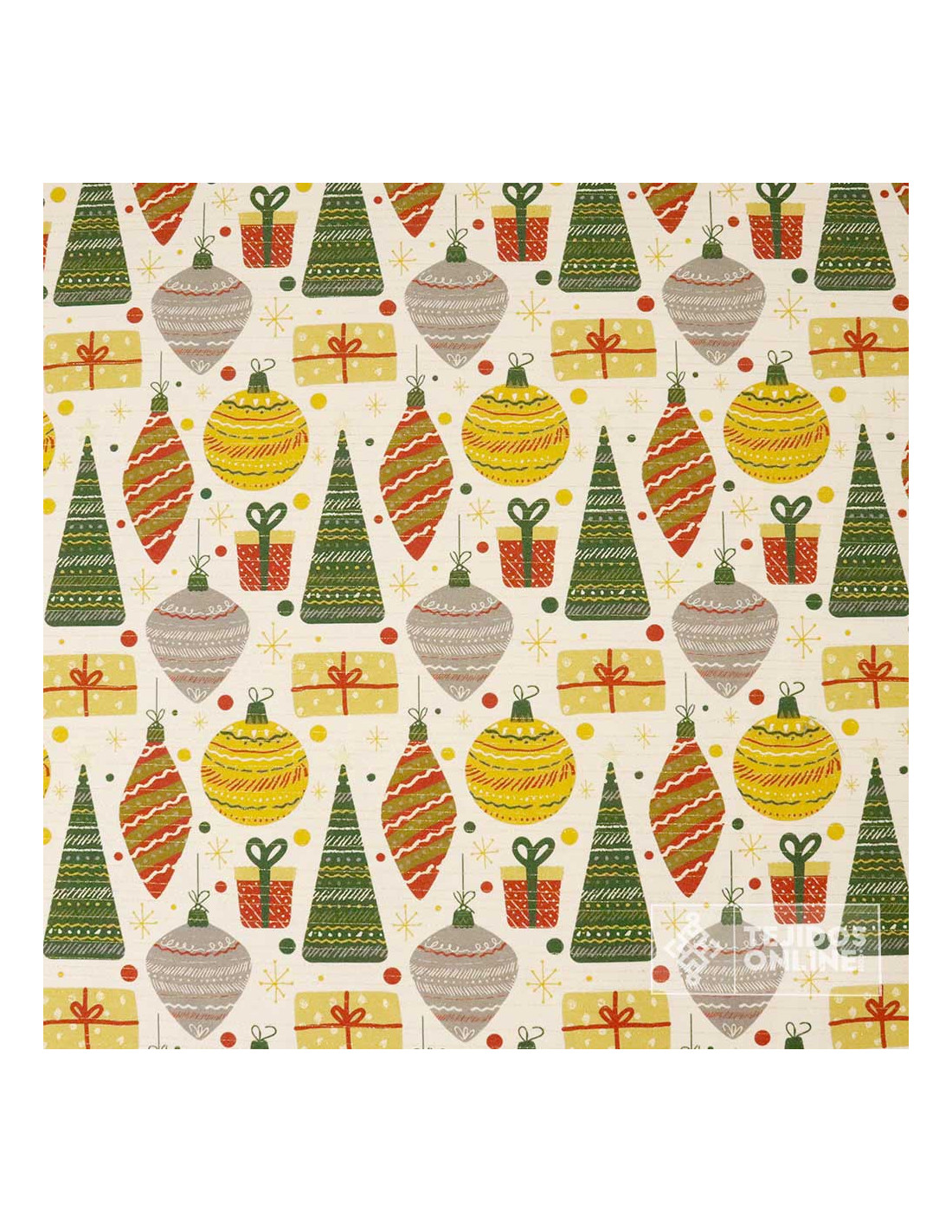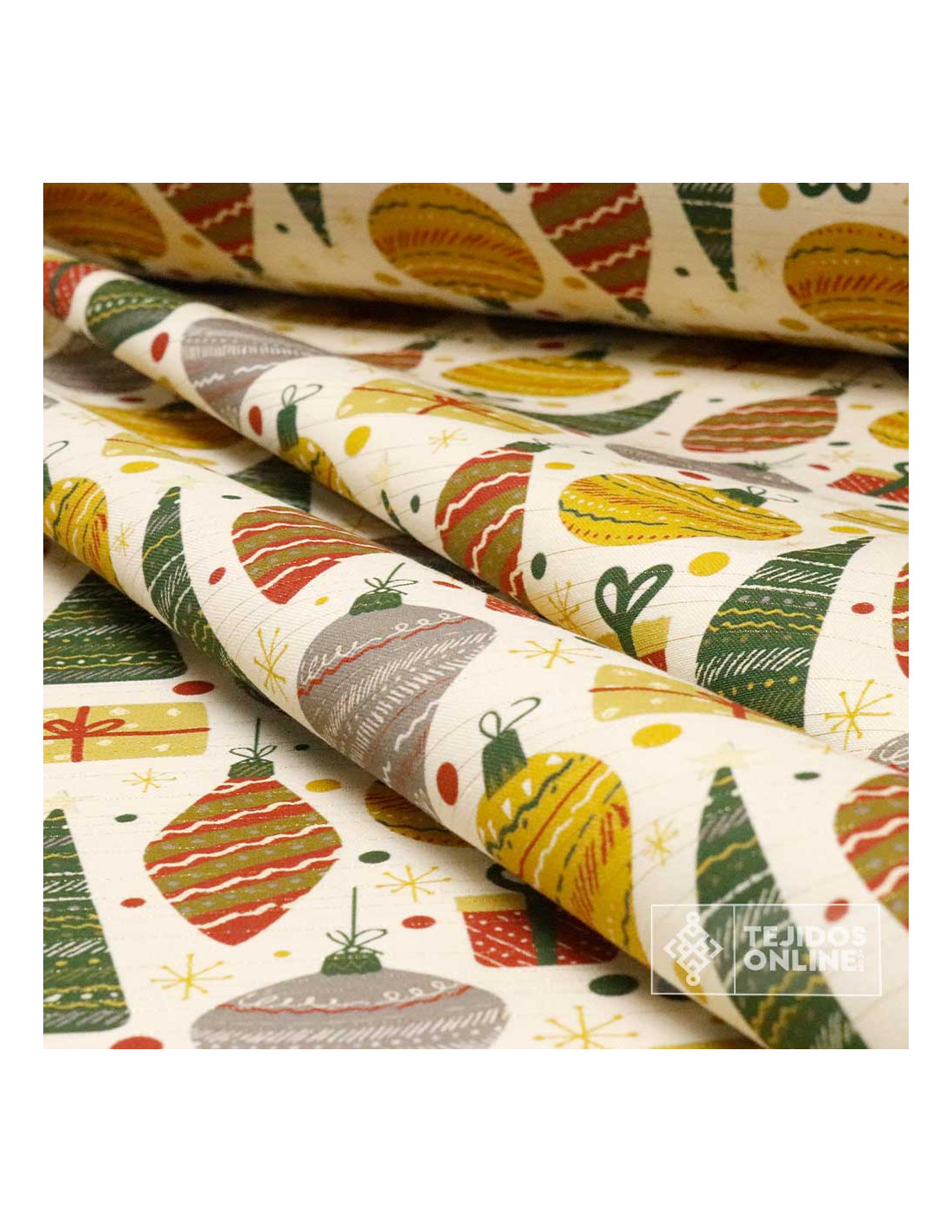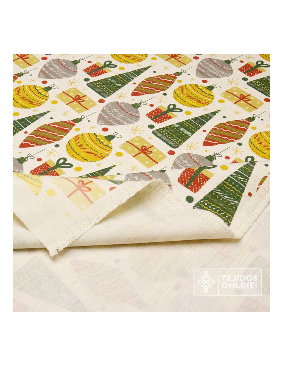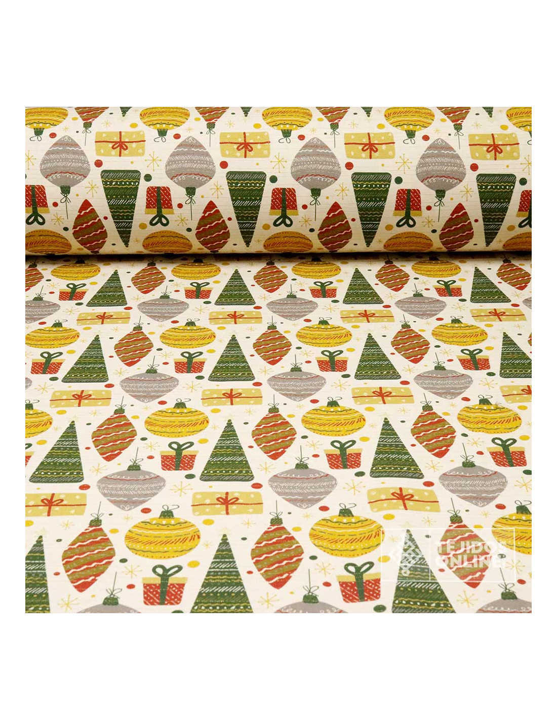 La Tela de Panamá Estampada Árboles y Regalos es un tejido alegre y versátil que captura todo el espíritu navideño. Con un fondo beige y un estampado de árboles de Navidad, bolas decorativas y regalos en tonos dorados, verdes y rojos, esta tela resulta perfecta para confecciones festivas llenas de color. Su composición de 78% poliéster, 18% algodón y 4% lurex le aporta un tacto suave, buena caída y un ligero brillo que realza cada detalle. Con un ancho de 1,40 metros, peso de 125 g/m² y dibujos de árboles de unos 13 cm de alto, es ideal tanto para proyectos de decoración como de costura creativa.