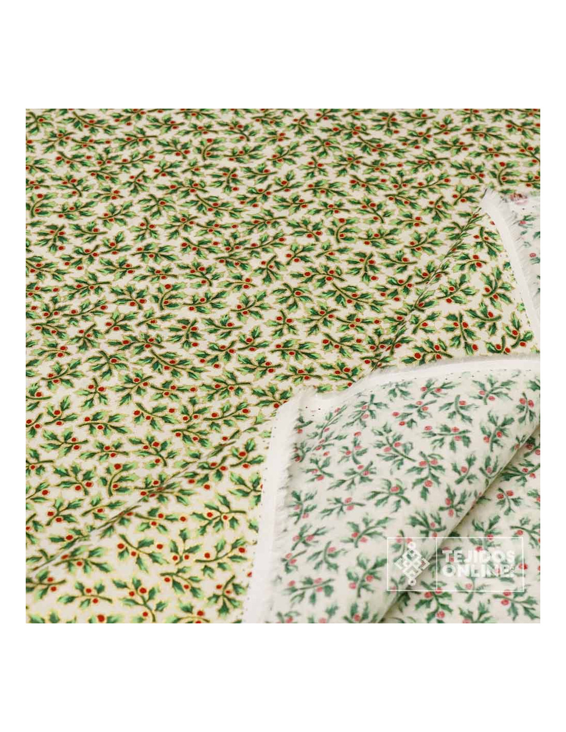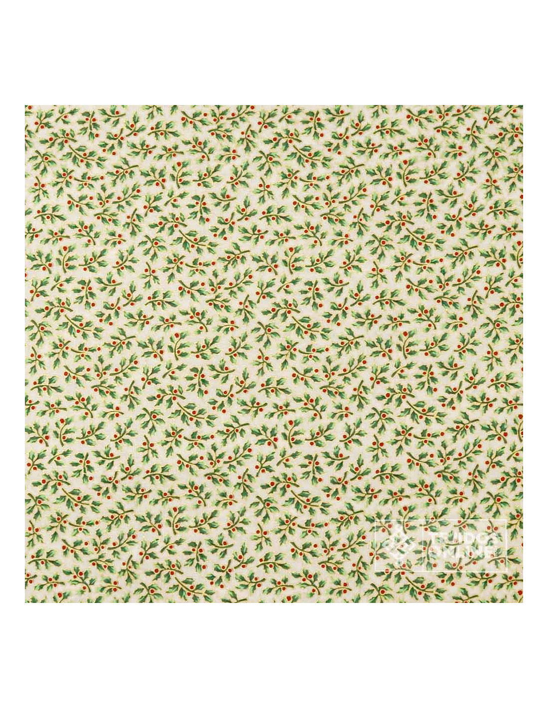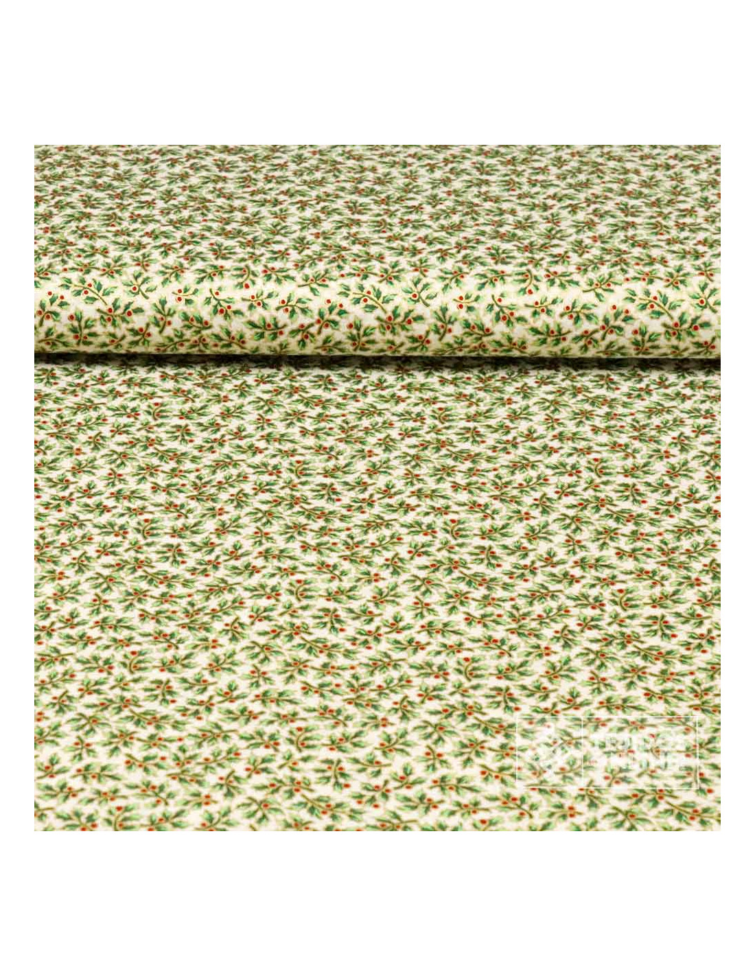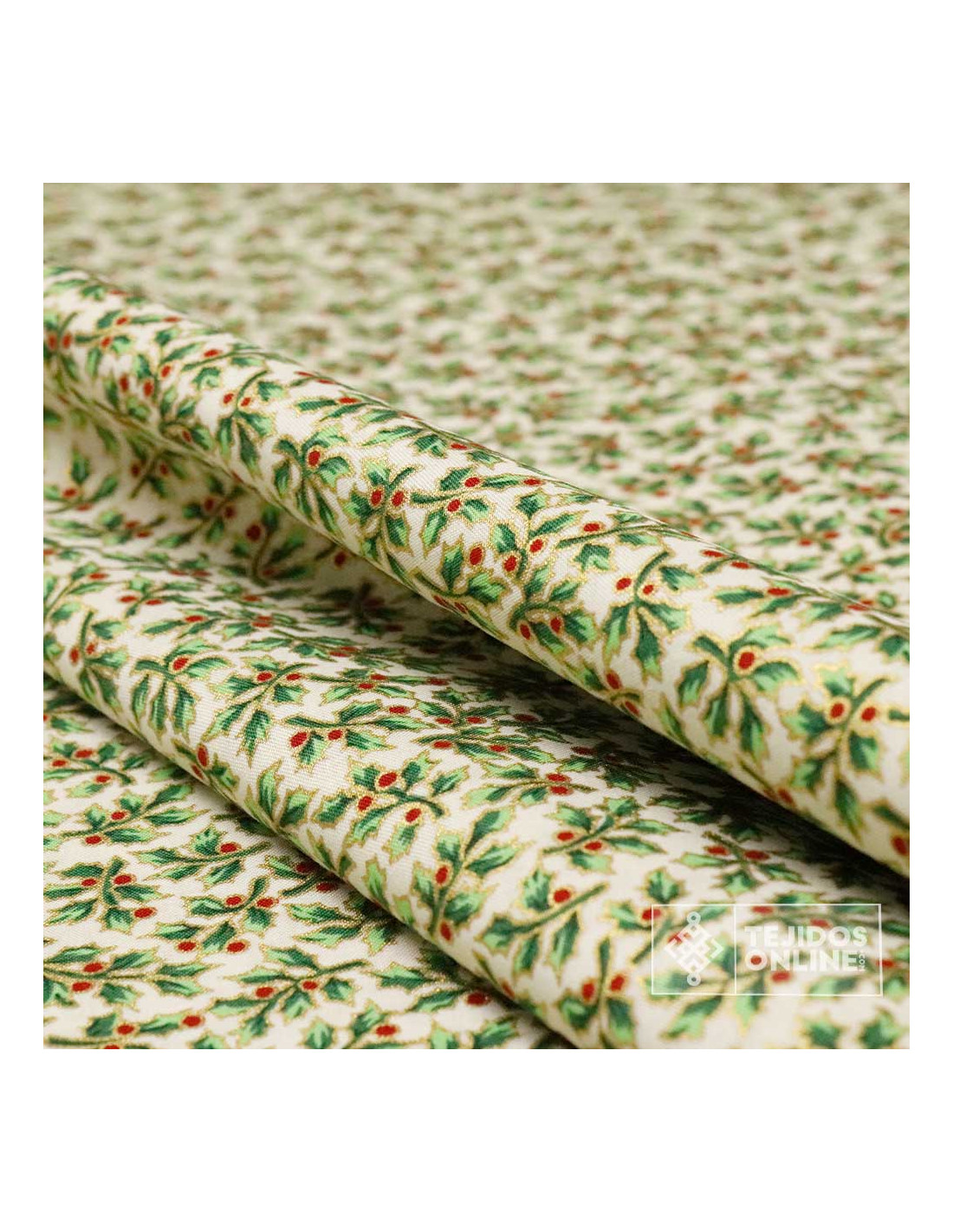 La Tela de Algodón Navidad con Hojas y Bayas Doradas es un tejido suave, natural y encantador, ideal para confecciones navideñas llenas de calidez. Está elaborada en 100% algodón y cuenta con un delicado toque de lurex dorado que aporta un brillo sutil a su diseño. Su fondo beige combina a la perfección con el estampado de ramas verdes y bayas rojas, evocando el espíritu clásico de la Navidad. Con un ancho de 1,40 metros, peso de 125 g/m² y dibujos de aproximadamente 2 cm, es una tela ligera pero con cuerpo, perfecta tanto para costura decorativa como para manualidades.