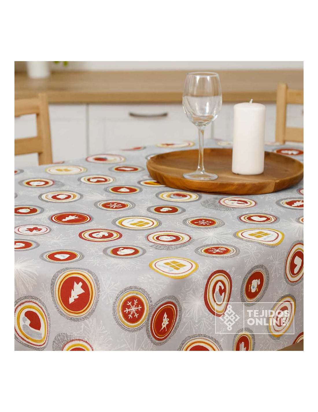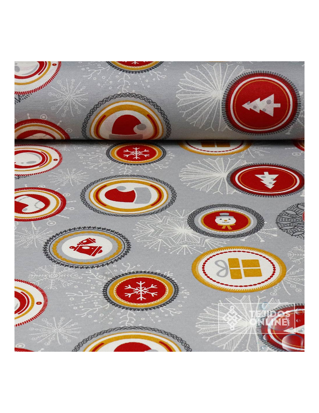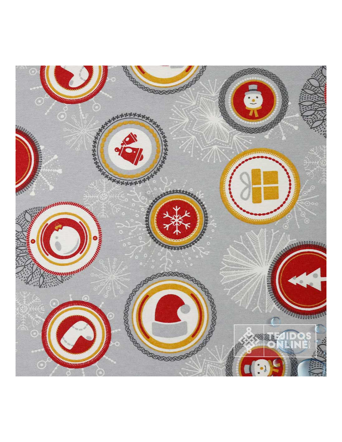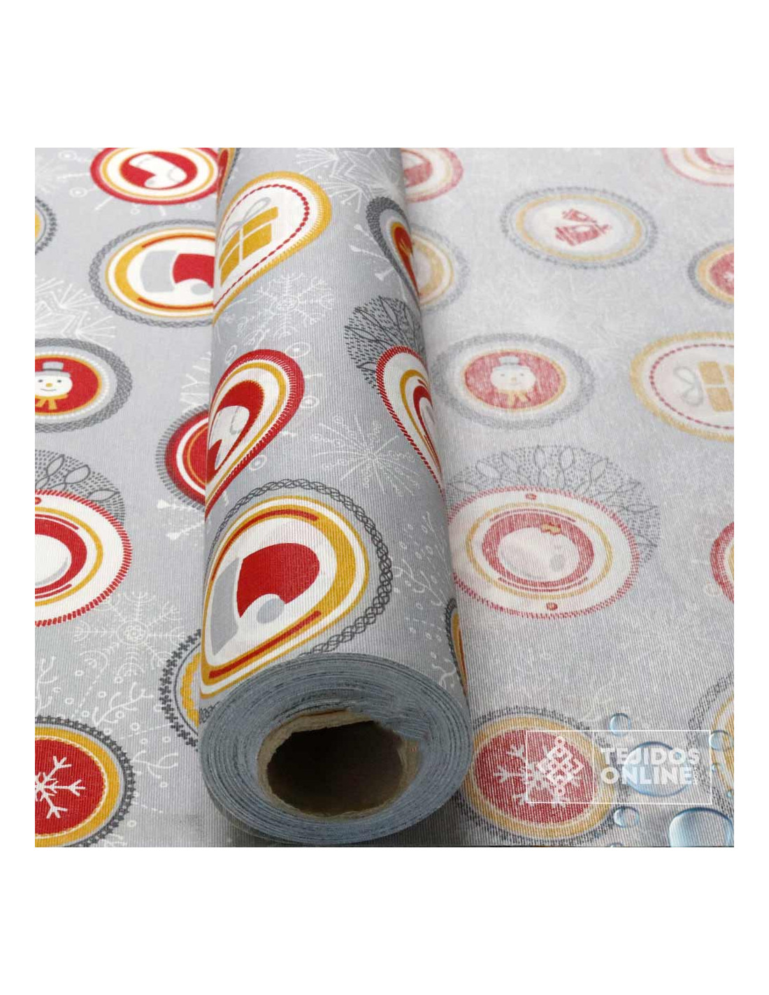 La Tela Resinado Navidad Gris es un tejido práctico, resistente y decorativo, ideal para el hogar durante las fiestas. Su composición de 100% poliéster con recubrimiento resinado la hace impermeable y fácil de limpiar, perfecta para uso diario o decoraciones navideñas con estilo. Presenta un fondo gris con divertidos motivos circulares de gorros de Papá Noel, copos de nieve, árboles, regalos y muñecos de nieve en tonos rojos, dorados y blancos, creando un ambiente alegre y festivo. Con un ancho de 1,40 metros, peso de 125 g/m² y dibujos de unos 9,5 cm, esta tela combina funcionalidad y encanto.