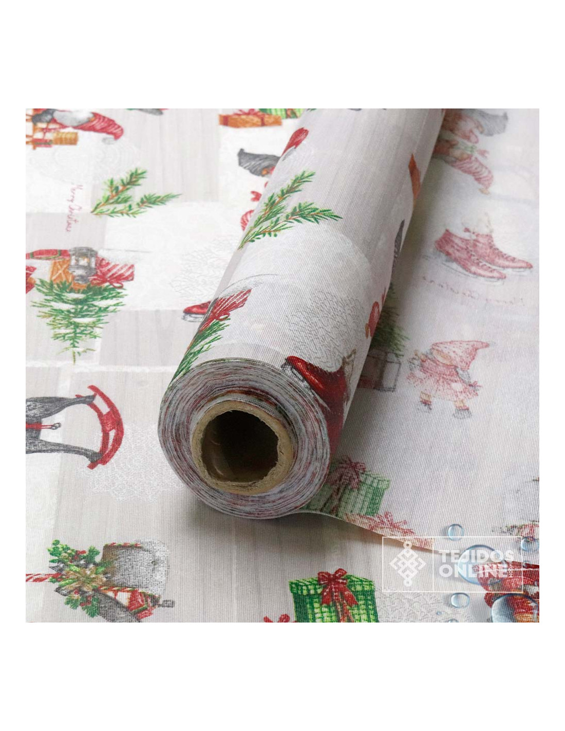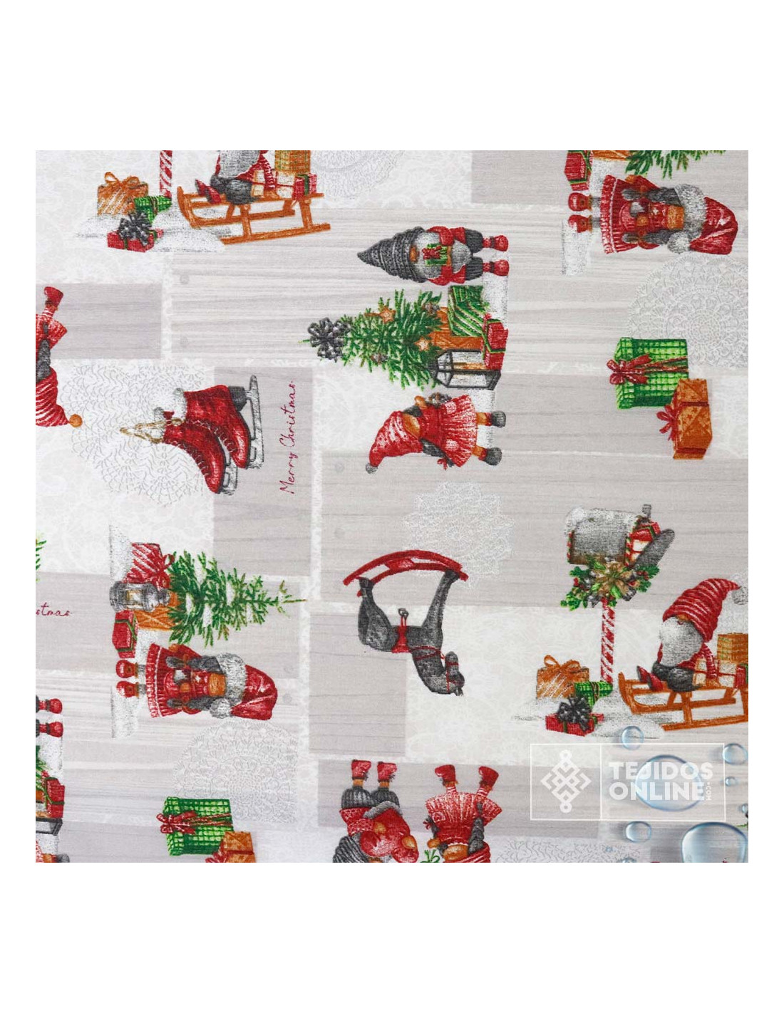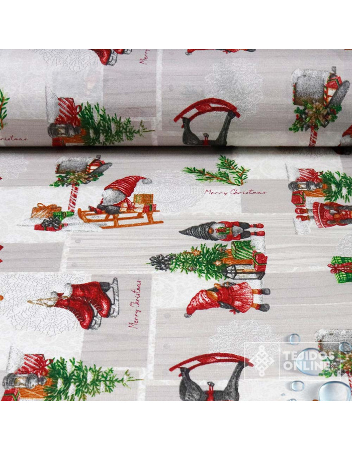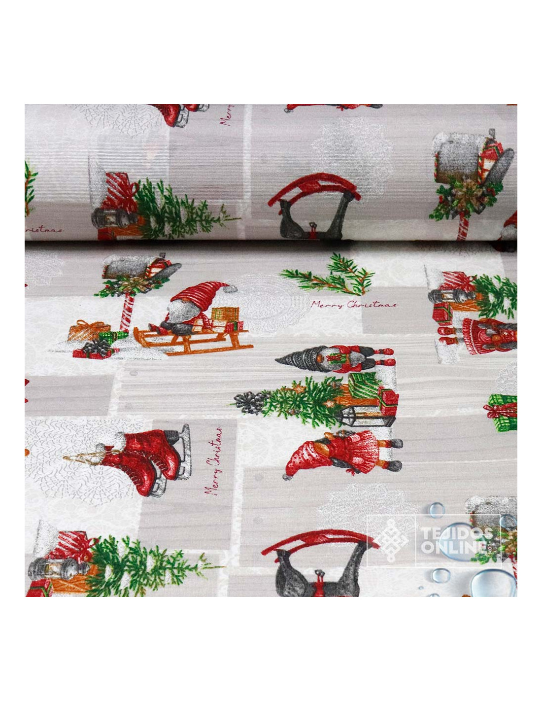 Tela Loneta Resinada Navidad Gnomos y Trineos