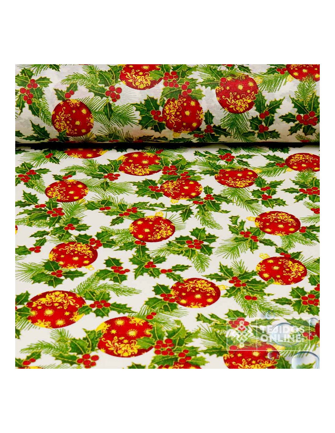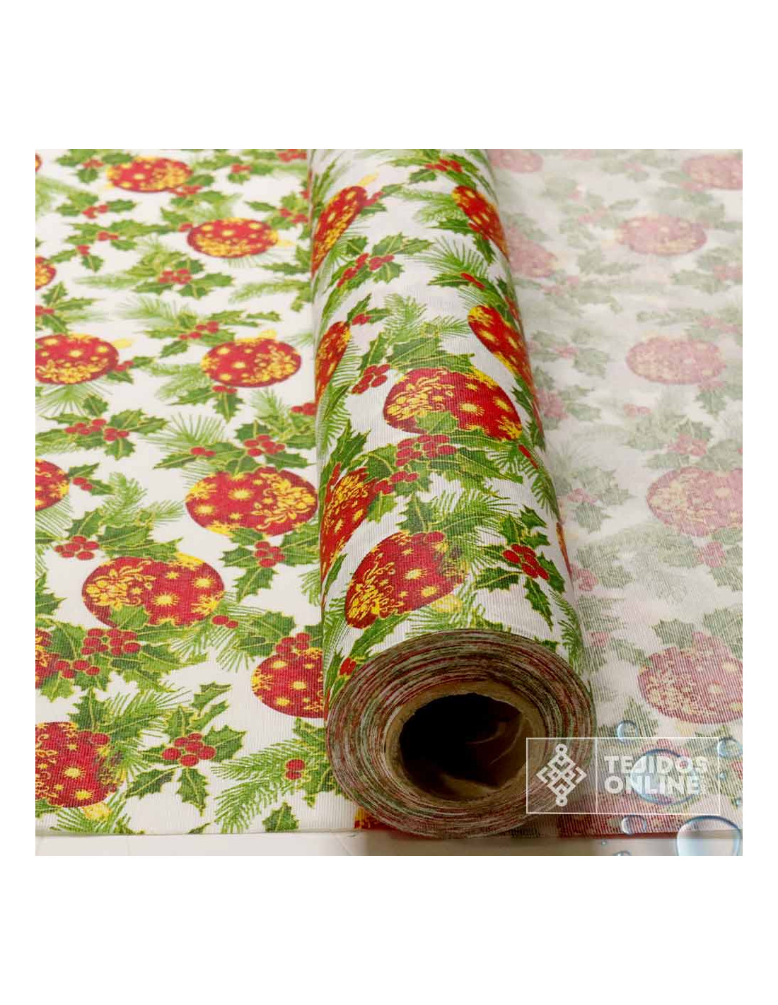 Una de su gran ventaja de este tejido es que se pueden lavar cómodamente en la lavadora siendo bastante resistentes al desgaste. La Tela Loneta Resinada Navidad Fondo Beige con Bolas y Acebo aporta un toque tradicional y alegre, combinando funcionalidad y diseño para crear espacios llenos de encanto.