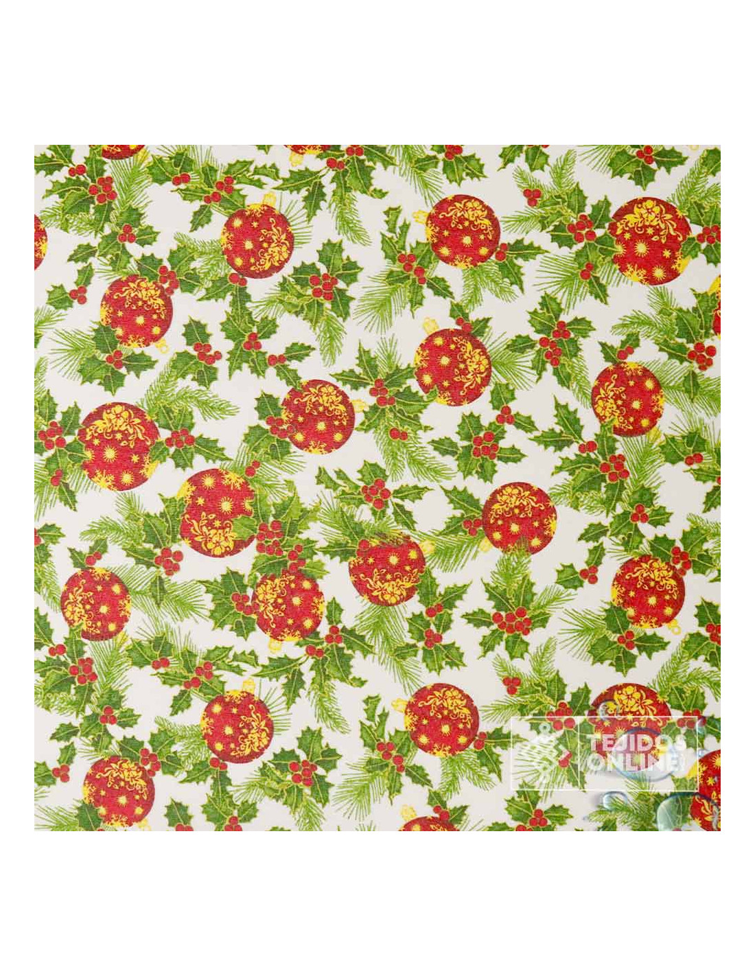La Tela Loneta Resinada Navidad Fondo crema con Bolas y Acebo es un tejido clásico y encantador, ideal para llenar tu hogar del espíritu navideño. Fabricada en 100% poliéster con acabado resinado, cuenta con una superficie impermeable, resistente y fácil de mantener. Su diseño combina bolas rojas con detalles dorados de 5 cm de diámetro junto a ramas de acebo en tonos verdes y rojos sobre un fondo beige cálido, creando una composición elegante y festiva. Con un ancho de 1,40 metros y un peso aproximado de 125 g/m², es una tela perfecta para la decoración navideña del hogar.