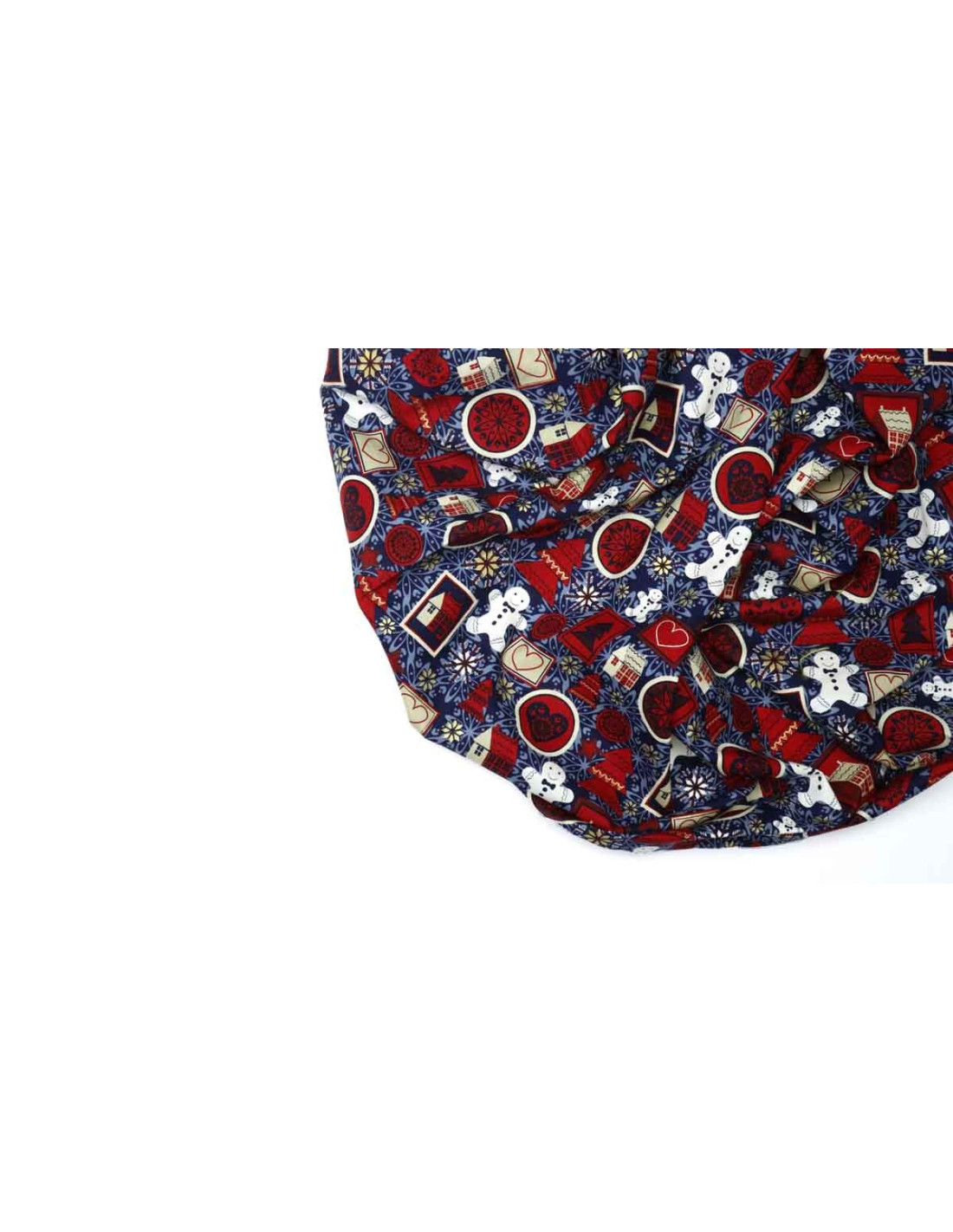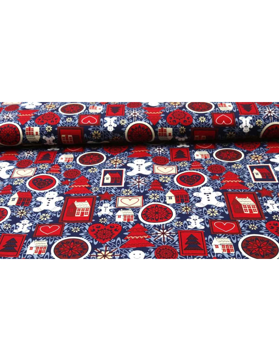 Navidad PatchWork Azul Bolas, tejido de gran suavidad, cierta finura y de algodón. Tejido con estampados de motivos navideños, predominando unas bolas rojas, corazones, cuadros, y un muñeco de nieve , sobre un fondo azul oscuro estampado de copos de nieve. Tejido acompañado de unas flores pequeñas resaltadas por un brillo dorado. Este tejido es una tela fácil de coser ya que no ofrece resistencia al corte. Tejido utilizado para proyectos de manualidades, proyectos de decoración, tapizados, etc.