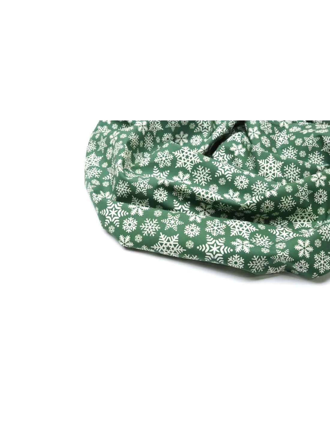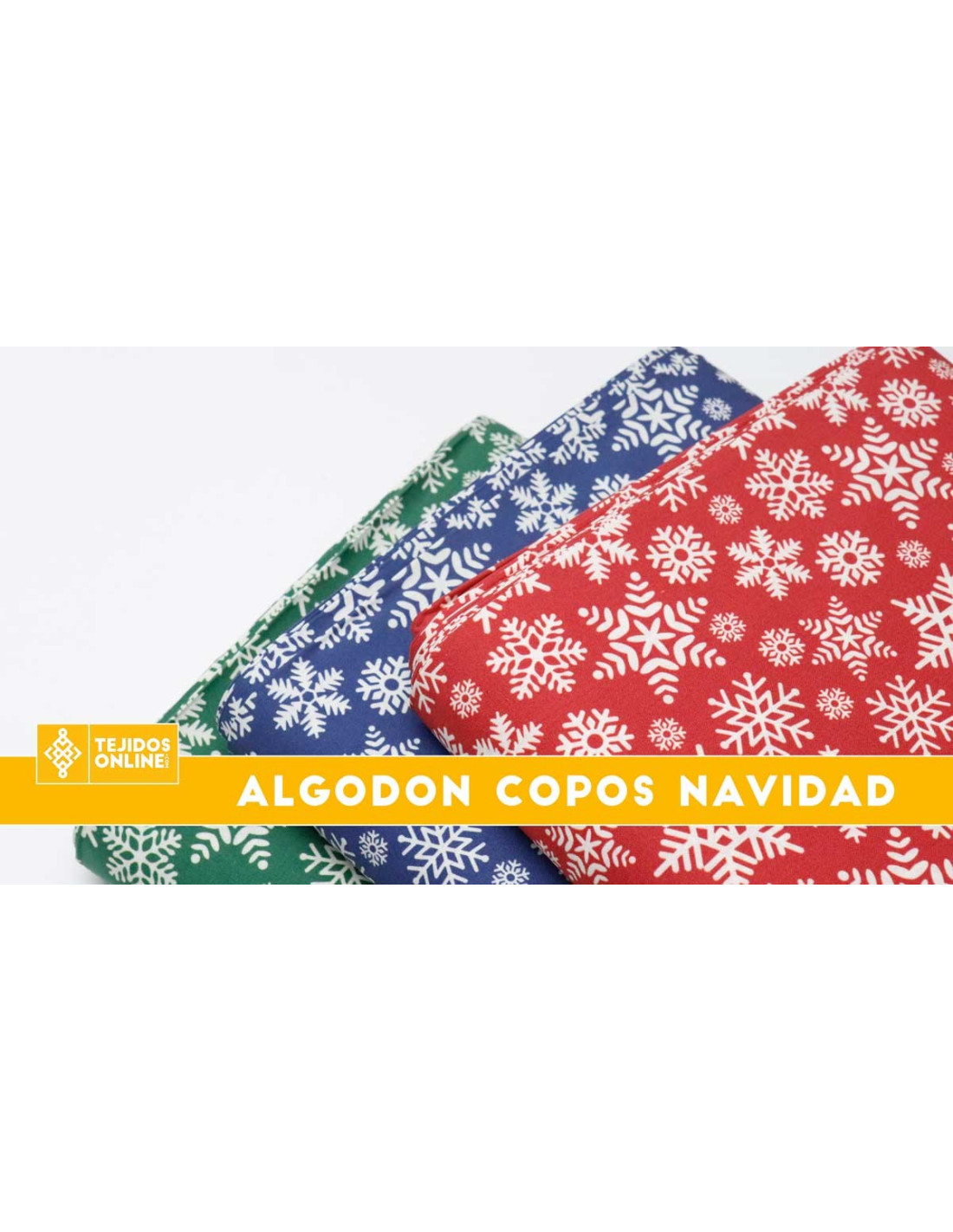 Algodón Copos Navideños, tejido con cierta finura y suavidad . Tejido con estampados de copos de nieve en color blanco dando un toque navideño al tejido, sobre un fondo azul, fondo rojo o fondo verde. Este tejido, es una tela fácil de coser ya que no ofrece resistencia. Es utilizado para todo tipos de confecciones como; manualidades, mantelería, proyectos de decoración, etc..