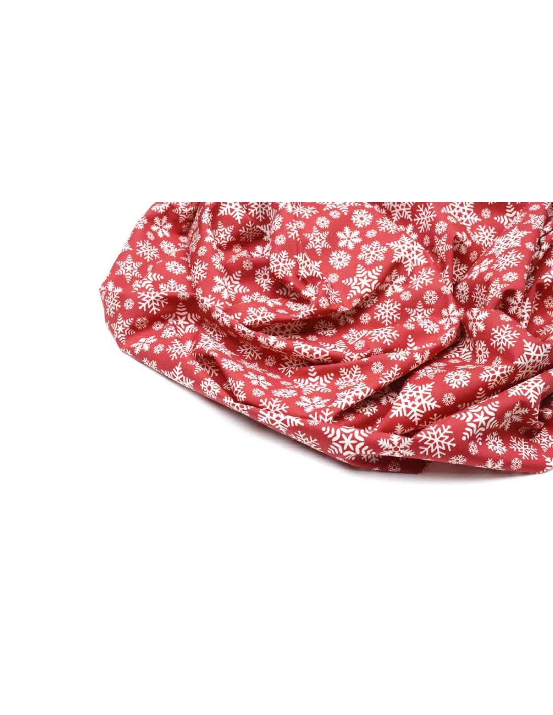 Algodón Copos Navideños, tejido con cierta finura y suavidad . Tejido con estampados de copos de nieve en color blanco dando un toque navideño al tejido, sobre un fondo azul, fondo rojo o fondo verde. Este tejido, es una tela fácil de coser ya que no ofrece resistencia. Es utilizado para todo tipos de confecciones como; manualidades, mantelería, proyectos de decoración, etc..