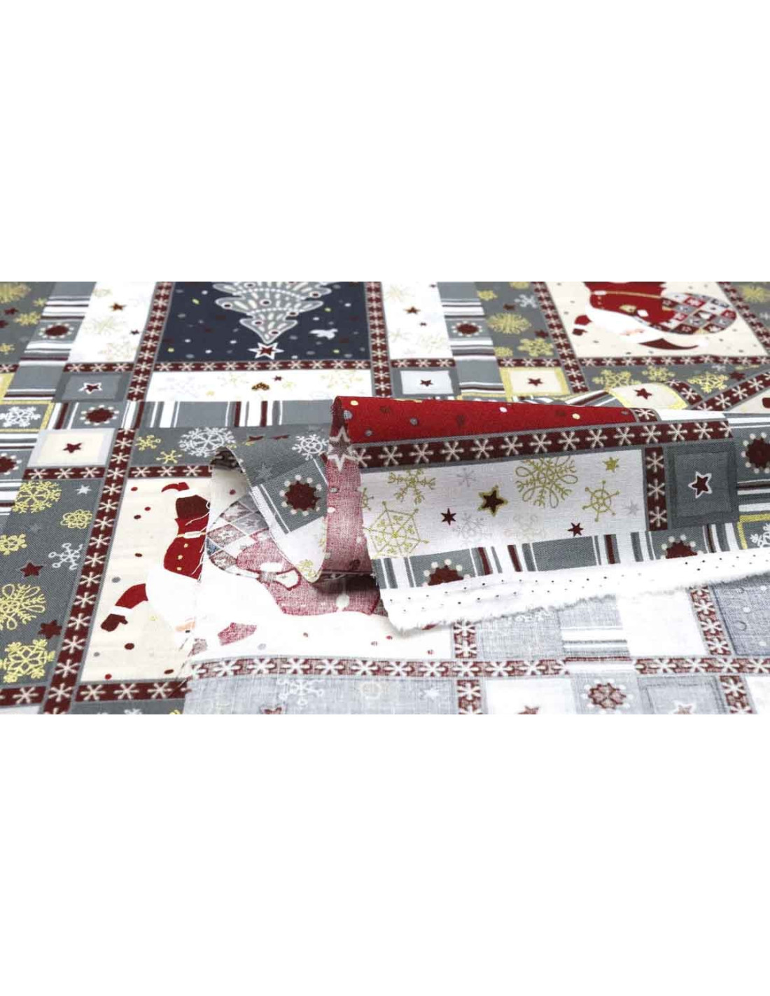 Navidad PatchWork Gris Noel, tejido con cierta finura y suavidad . Tejido de fondo gris con estampados navideños, en forma de cuadros, predominando un Papa Noel rojo, y árbol de navidad en color gris. Hay que predominar de este tejido, sus brillos en color dorado. Este tejido, es una tela fácil de coser ya que no ofrece resistencia. Tejido en Algodón 100%, ideal para confecciones como; manualidades, decoración, cortinas, mantelería, etc.