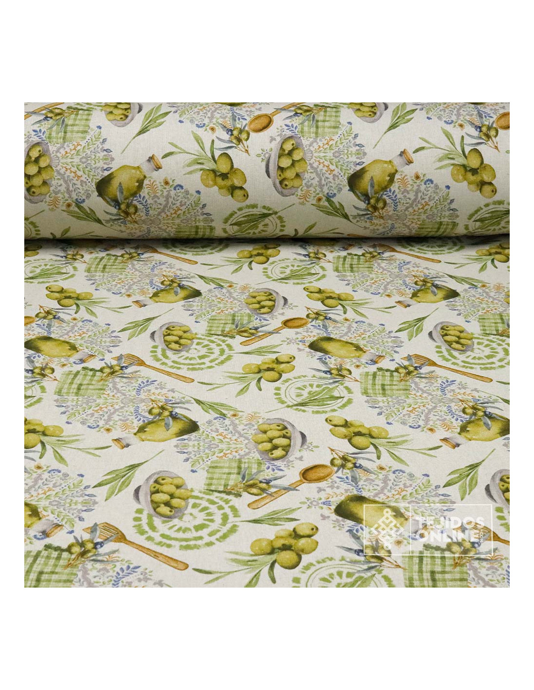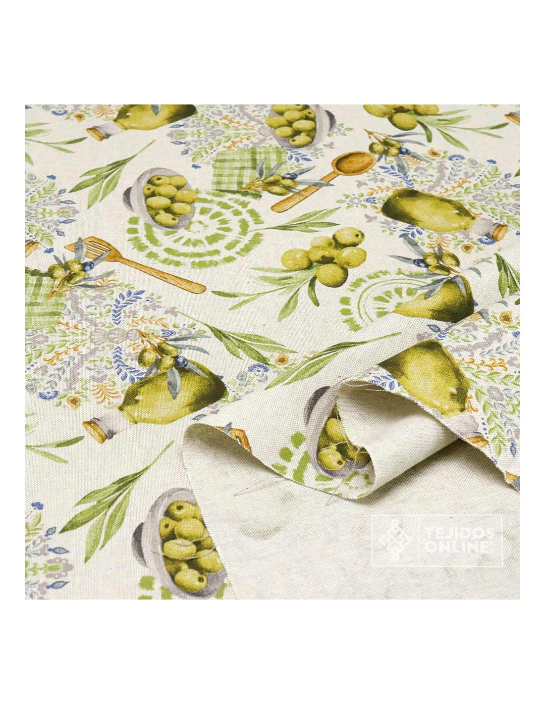 Esta tela tipo panamá presenta un encantador diseño rústico con elementos inspirados en el campo y la cocina mediterránea: botellas de aceite de oliva, ramas con aceitunas, cucharas de madera y detalles vegetales sobre un fondo en tono camel. El racimo de aceitunas mide aproximadamente 10 cm y se repite a lo largo del tejido en una disposición fluida y decorativa. Es una tela sin elasticidad, de gramaje medio (220 gr/m²) y tacto suave.