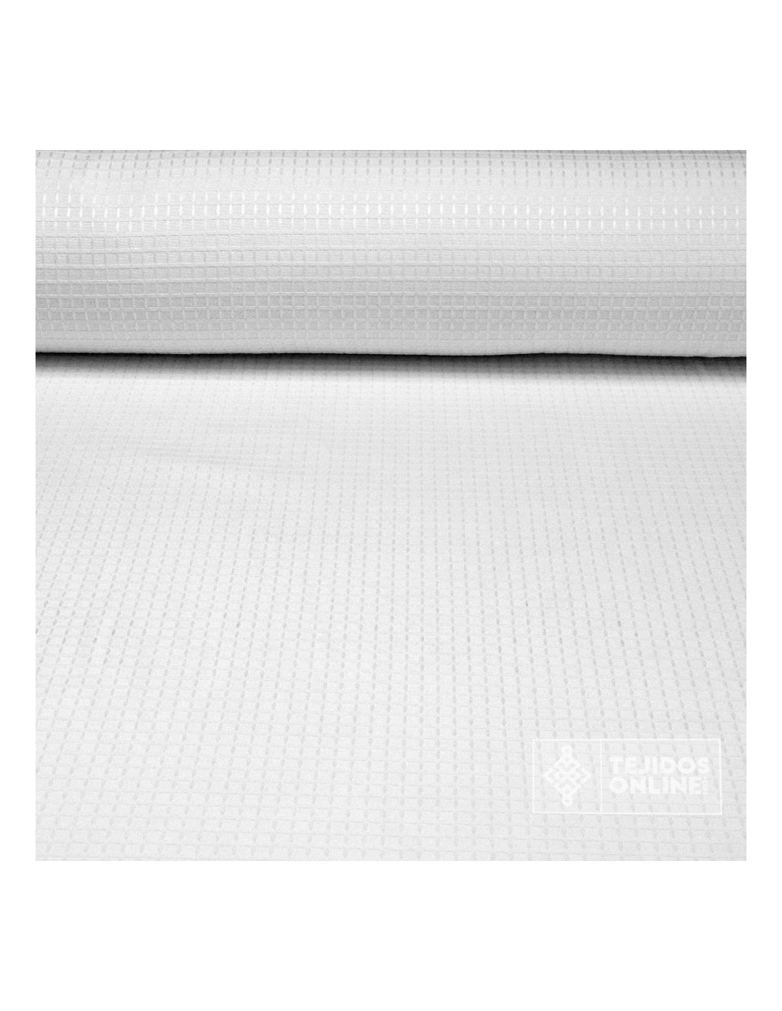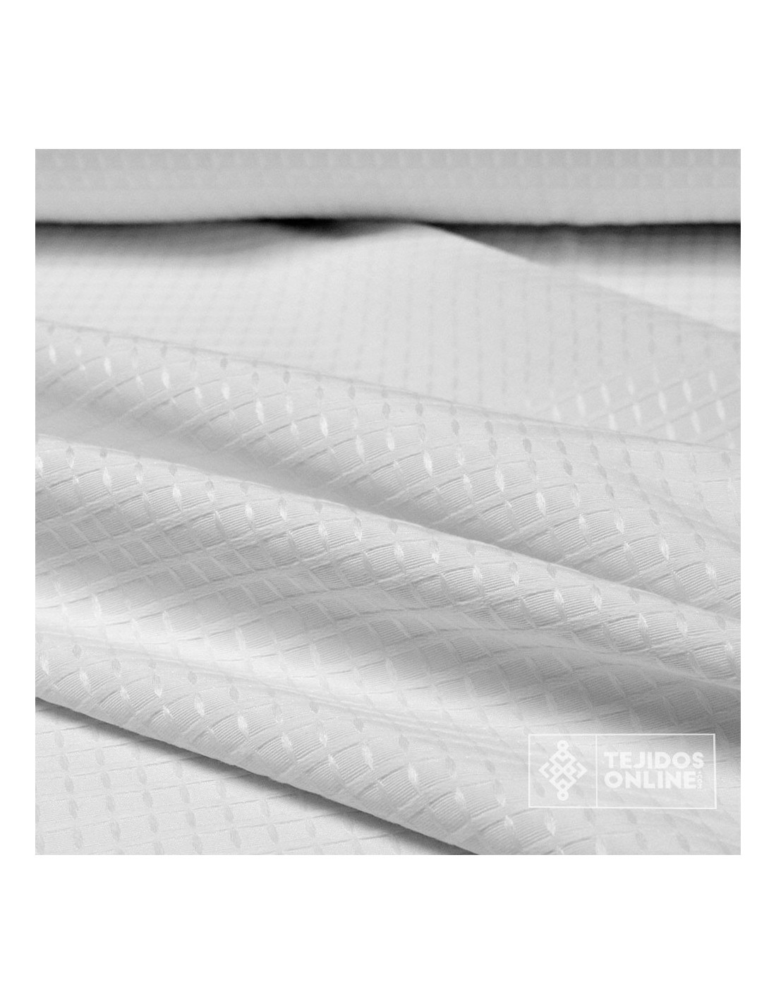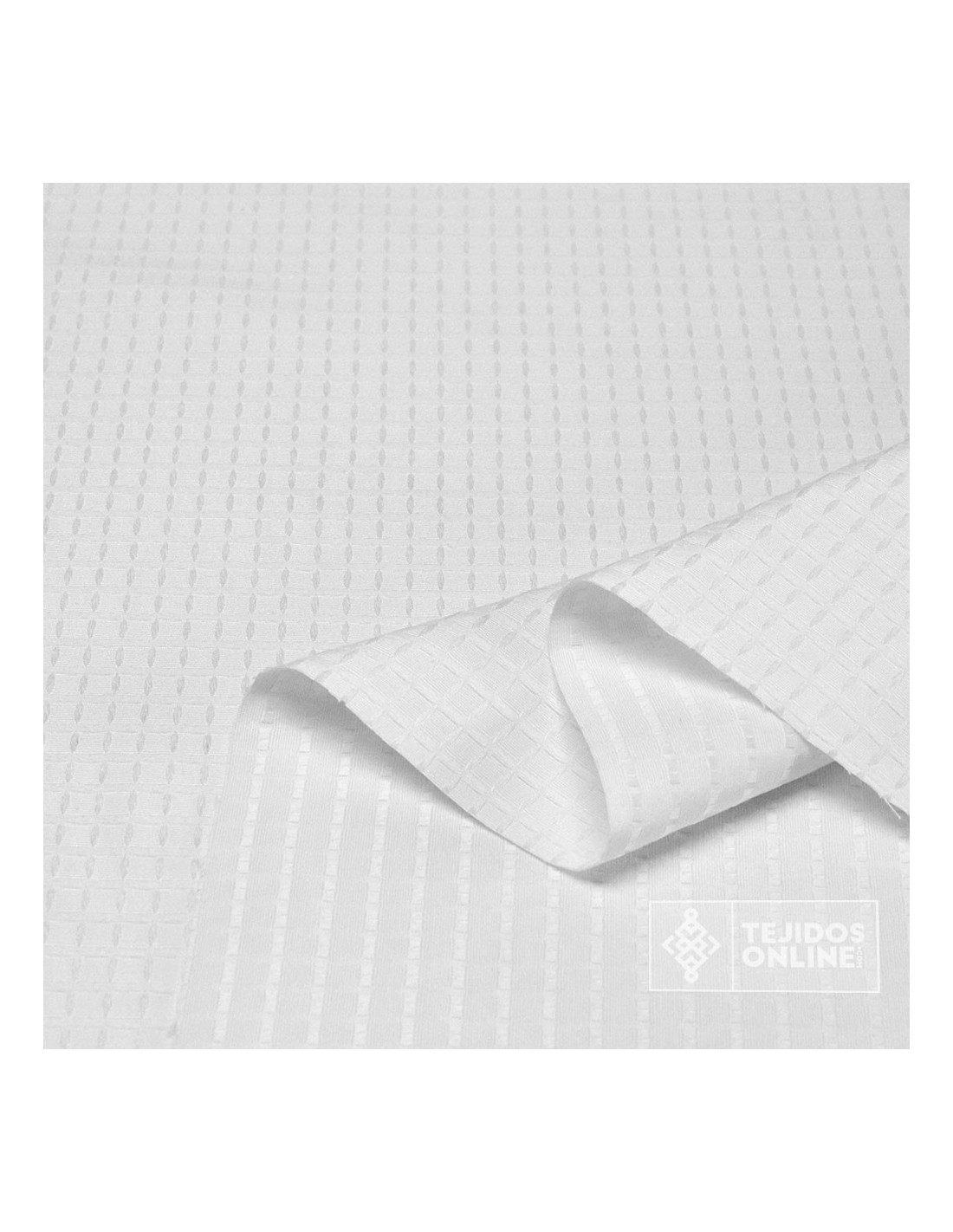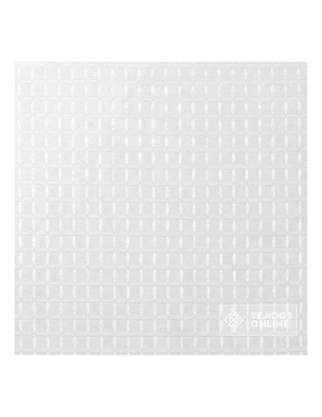 Este tejido tipo otomán doble ancho destaca por su elegancia discreta y su versatilidad. Con un diseño de cuadros bordados de 1x1 cm en hilo blanco sobre una base del mismo tono, aporta textura y refinamiento a cualquier ambiente.