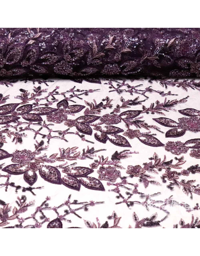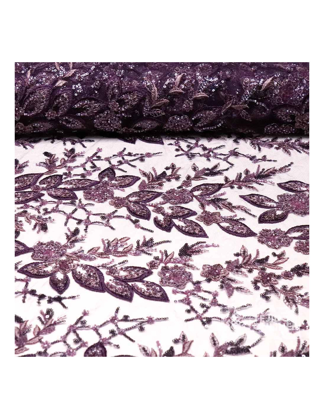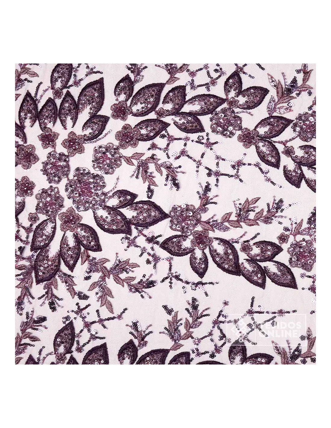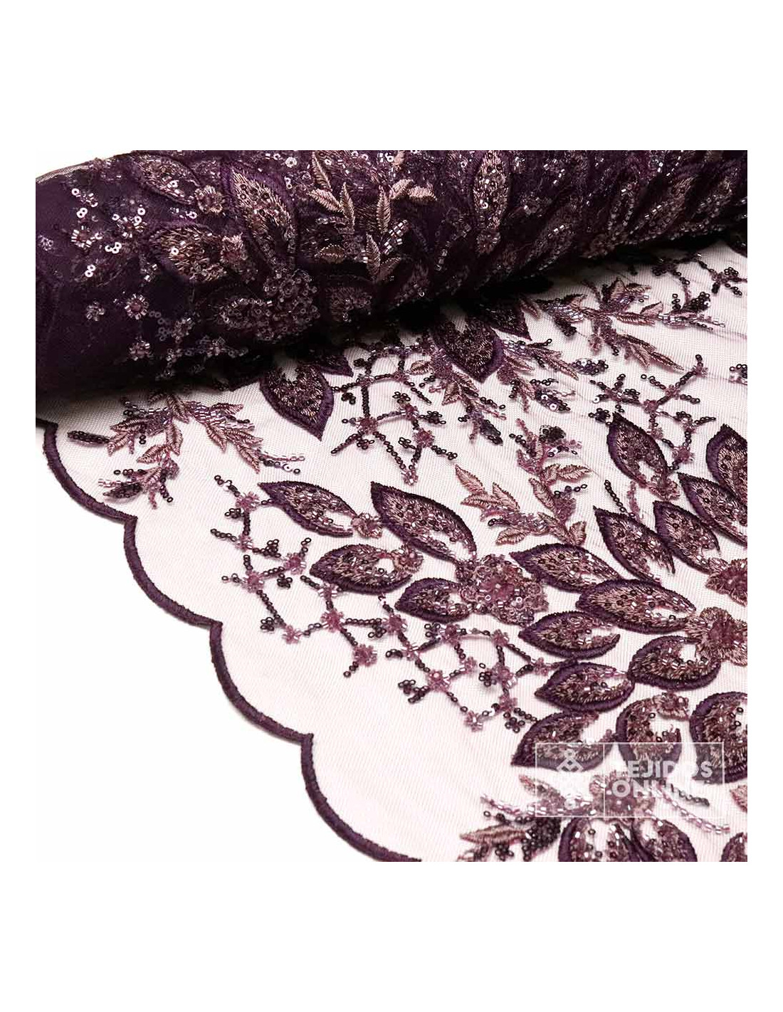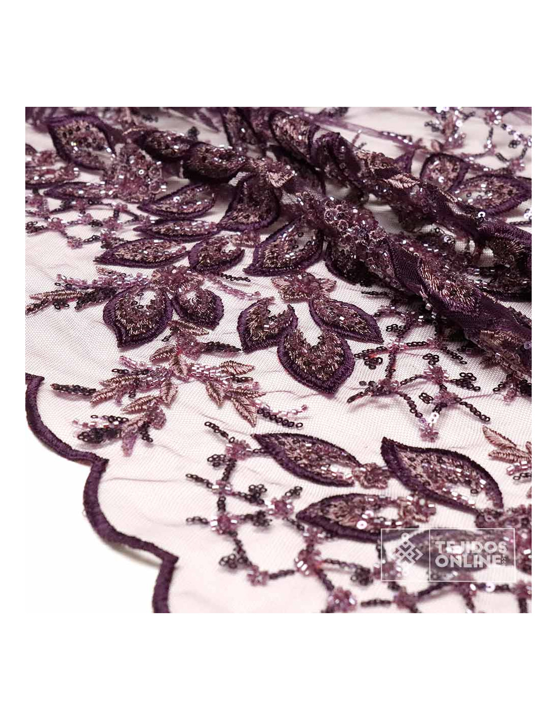 Nuestro tul con pedrería color berenjena luce un bordado floral con hojas y ramilletes salpicados de lentejuelas y canutillos que aportan brillo elegante. El fondo es un tul suave y flexible (100% poliéster), con acabado en puntas en ambos orillos para crear bajos, puños y velos sin rematar. Presenta caída ligera y tacto agradable, perfecto para prendas que se mueven contigo.