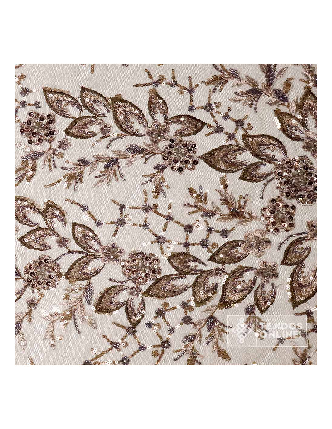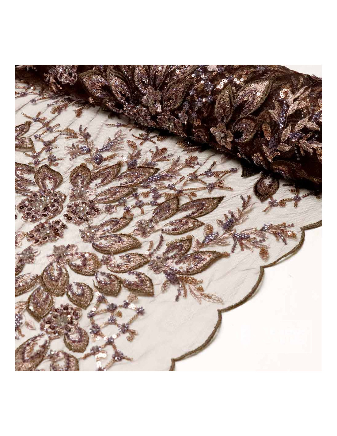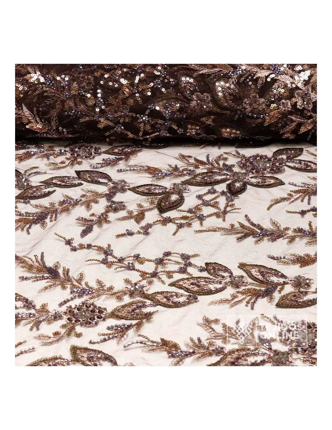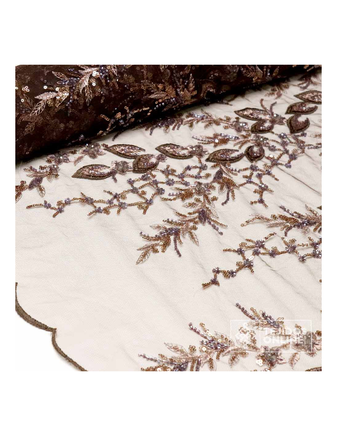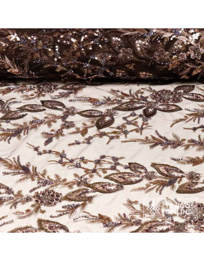 Nuestro tul con pedrería color marrón y lentejuelas cobres luce un bordado floral con hojas y ramilletes salpicados de lentejuelas y canutillos que aportan brillo elegante. El fondo es un tul marrón suave y flexible (100% poliéster), con acabado en puntas en ambos orillos para crear bajos, puños y velos sin rematar. Presenta caída ligera y tacto agradable, perfecto para prendas que se mueven contigo.