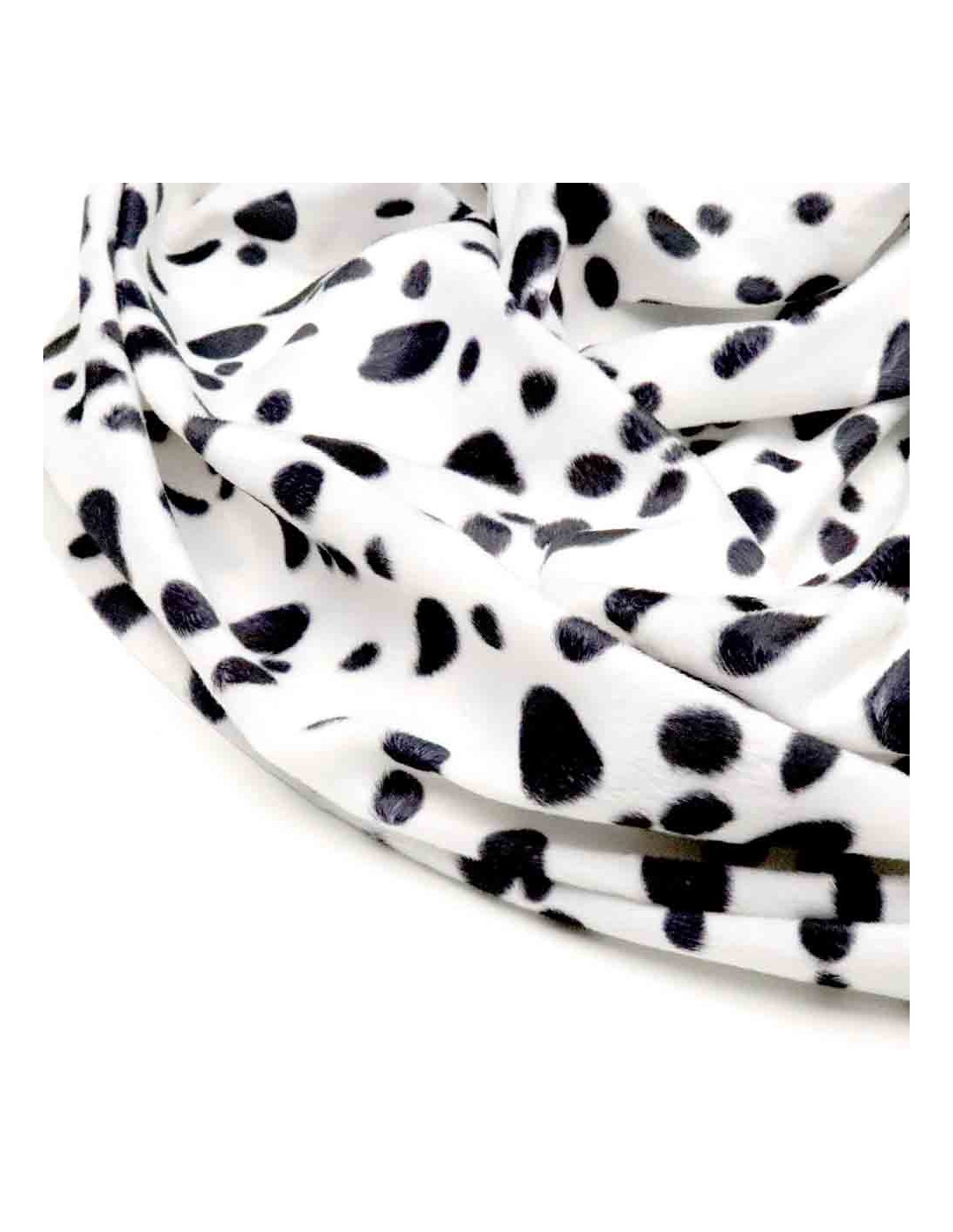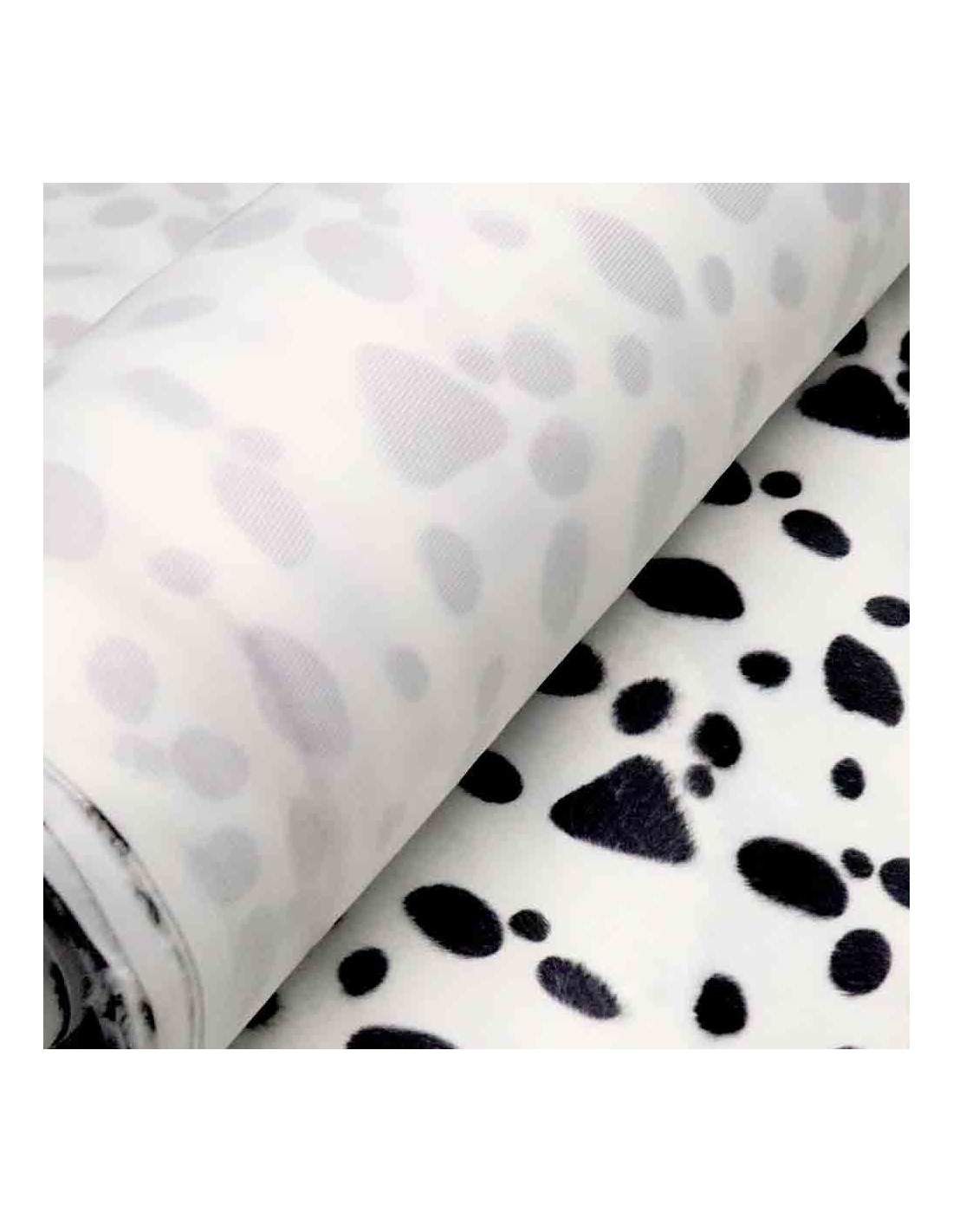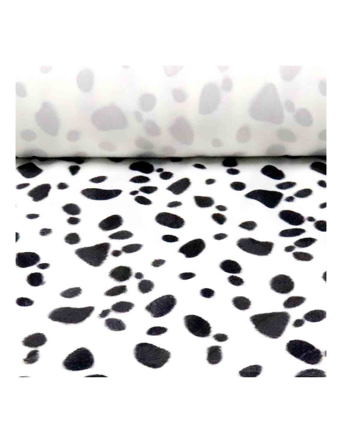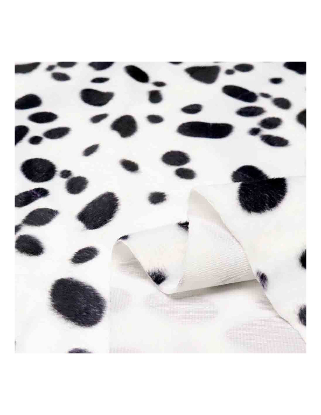 Tela de Pelo Estampado de piel de dálmata. Tela Pelo Dálmata es un tejido con caída, poco peso, poco grosor y muy suave. Tejido de pelo en blanco y negro. Las características del pelo dálmata son principal mente su suavidad, su corta largura y su forma formando unas ondas de unos 5.5 cm de ancho en el tejido destacando sus manchas de forma circular en color negro. Tejido utilizado para todo tipos de confecciones como; proyectos de carnaval, manualidades, para peluches, etc... En galería os mostramos una imagen con el revés del tejido para que podáis observar mejor la calidad.