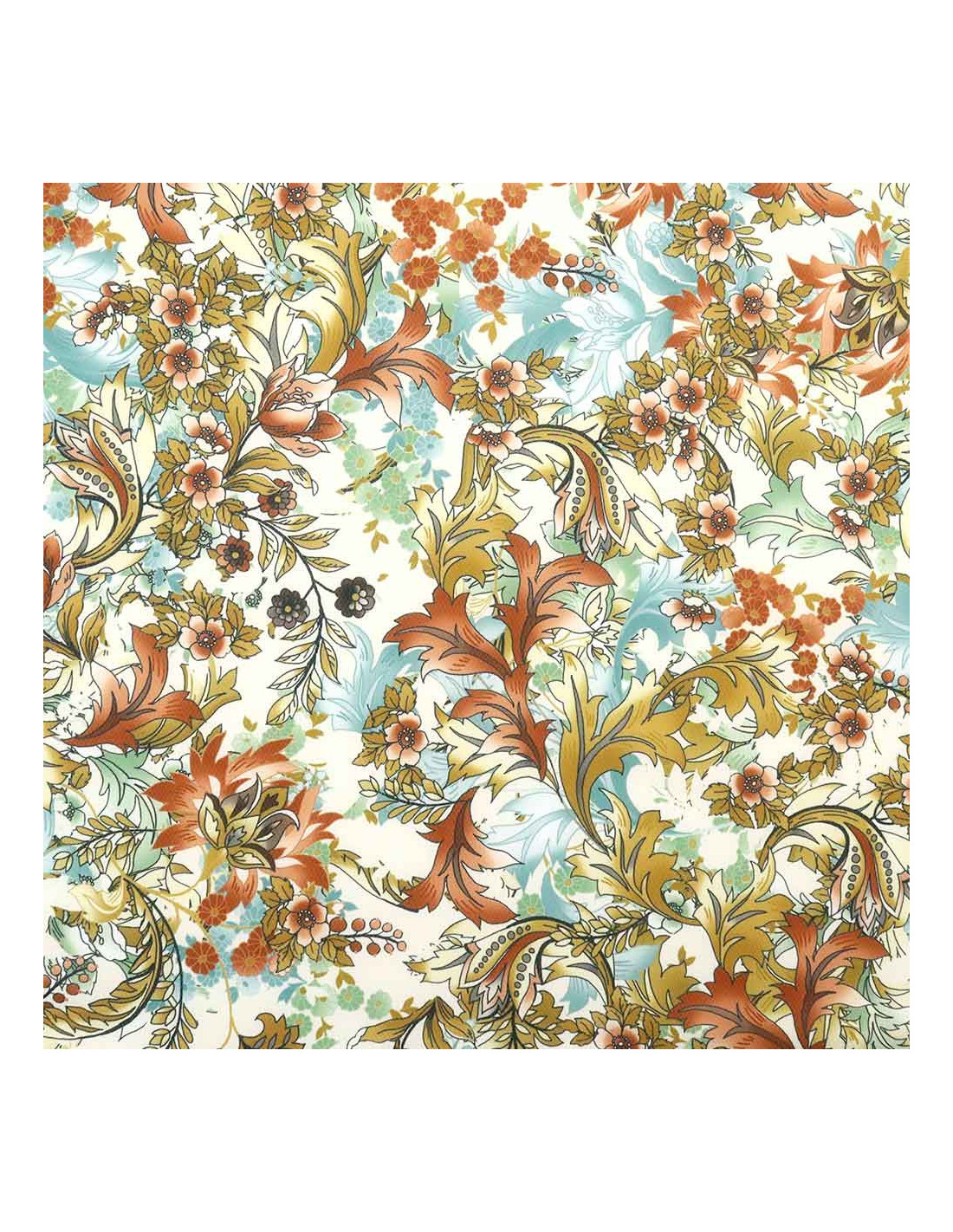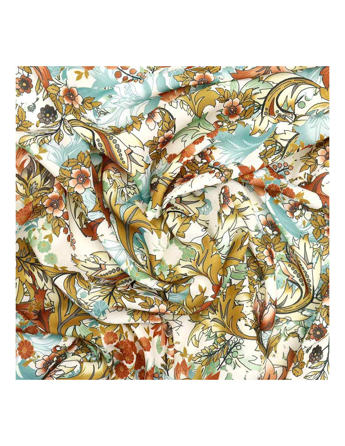 Crep Poliéster Estampado Cata, tejido de cierta finura, suavidad, con gran caída y de textura "sedosa". Tejido con estampaciones de flores predominando las tonalidades camels y aguamarinas, sobre un fondo claro. Tela que no ofrece resistencia al corte, tejido utilizado principalmente para confecciones como; (blusas, camisas, faldas, vestidos, monos, etc…) y todo proyecto que busque caída, frescor y movimiento.