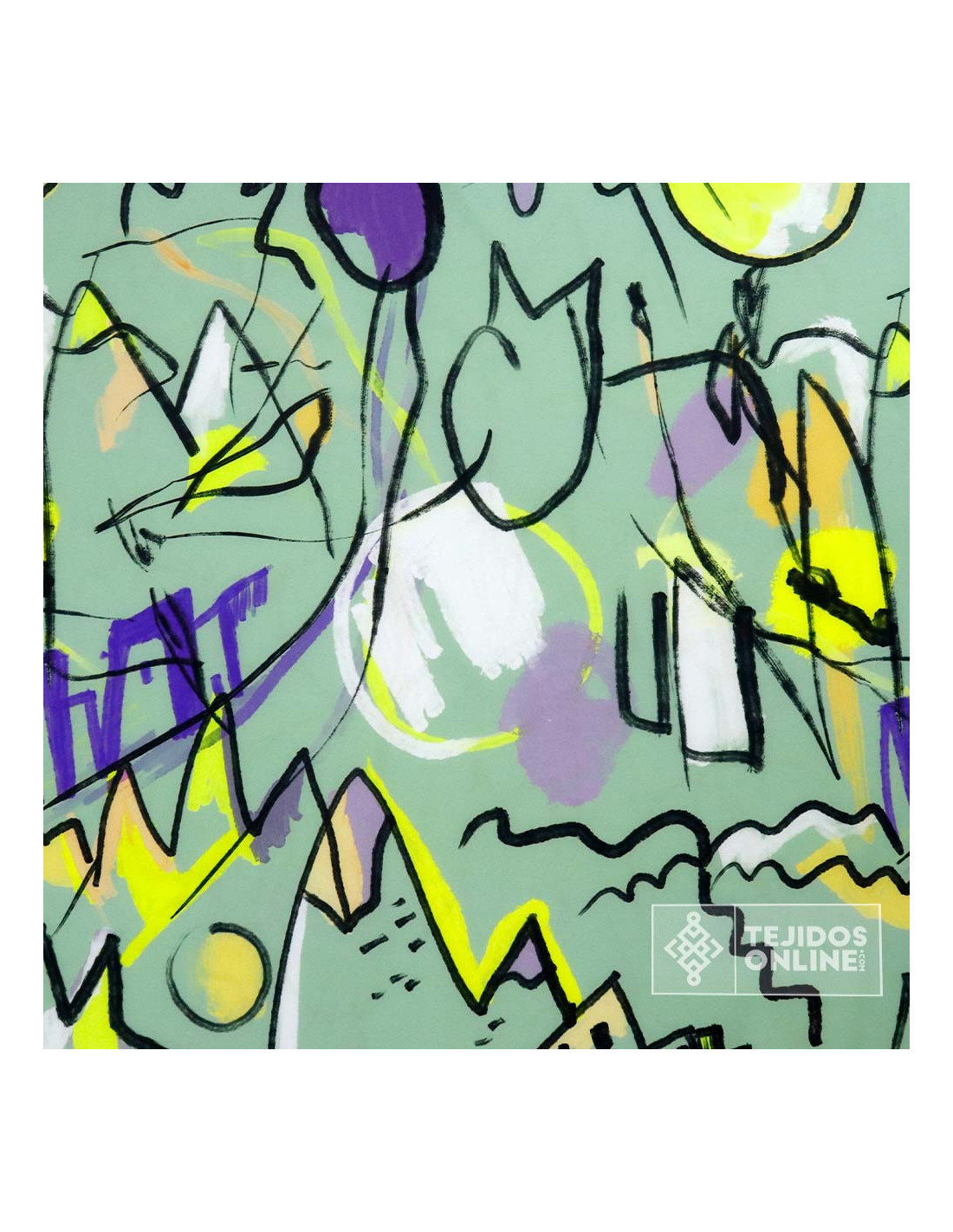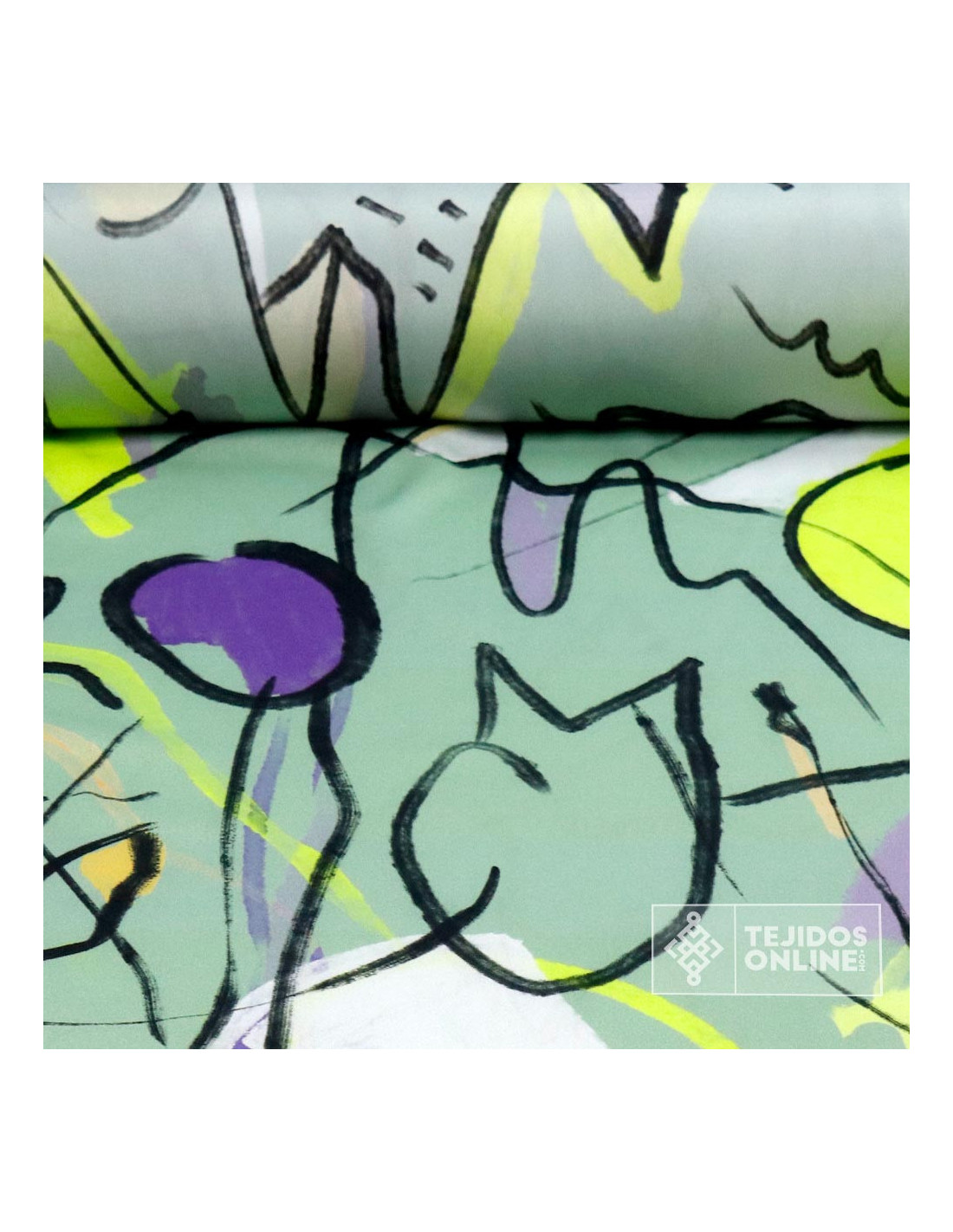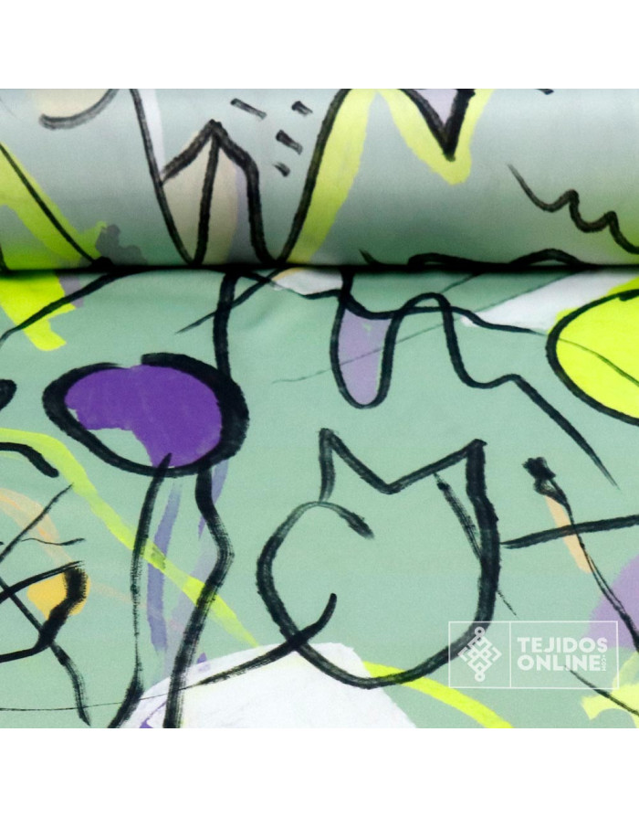 Tela estampada de forma aleatoria con dibujos o pinturas de un estilo abstractos dando a simular un cuadro de arte en este caso de "picasso". El Crep estampado es un tejido con caída, de tacto suave y agradable. Tejido en fondo verde agua con estampados de pinturas de color negro, lima, morado, etc...