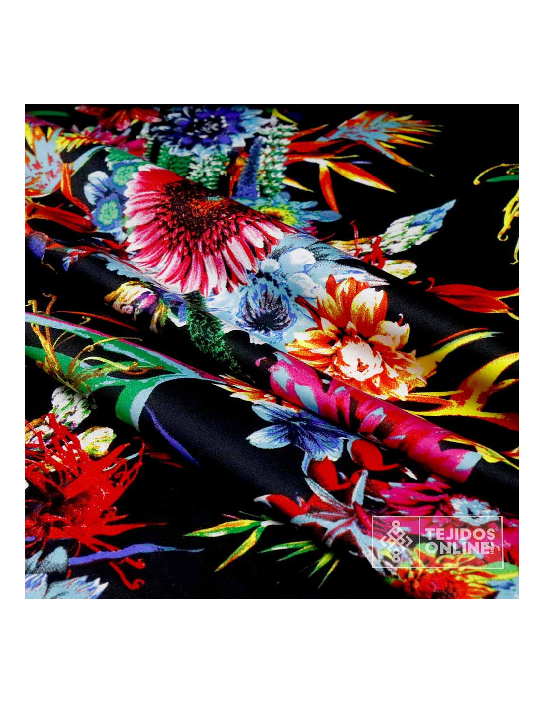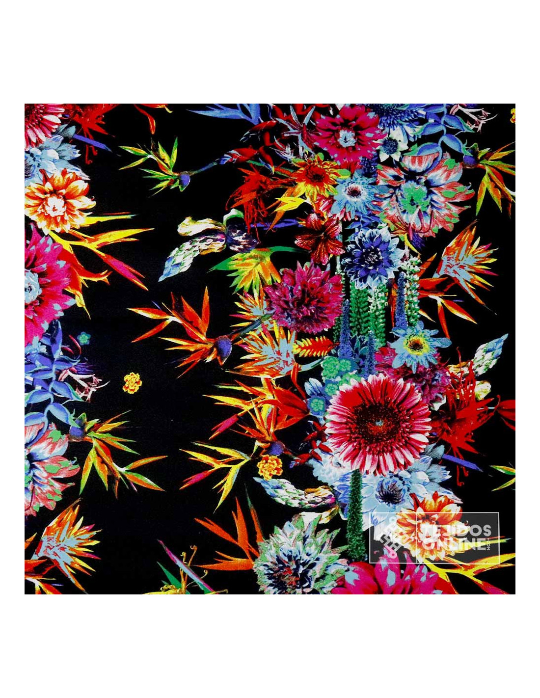 Este tejido compuesto en algodón, poliéster y elastano denominado un tejido de Satén del cual combina una base en color negro intenso con un estampado multicolor floral en forma de franjas de unos 30cm de ancho. Es una tela suave, con elasticidad y buena recuperación, perfecta para prendas que se ajusten al cuerpo sin perder comodidad.