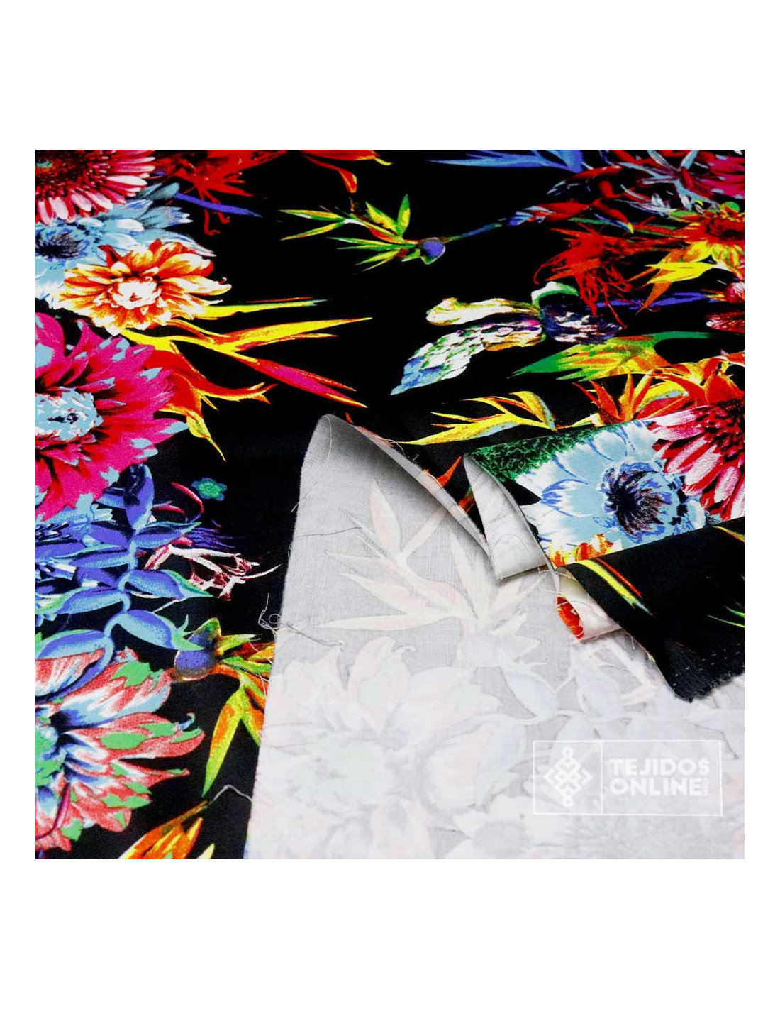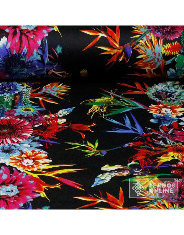 Tela Negra Flores Multicolor Estampadas con Lycra