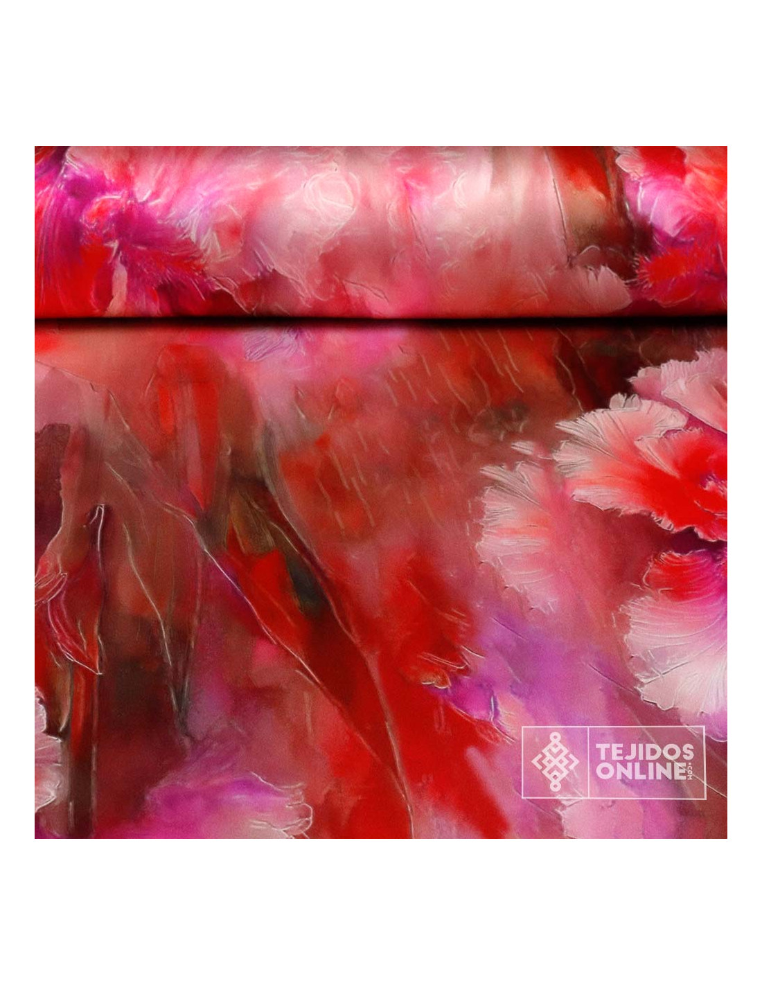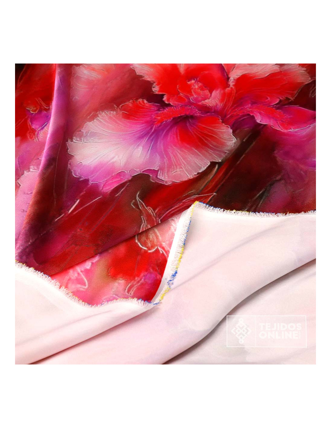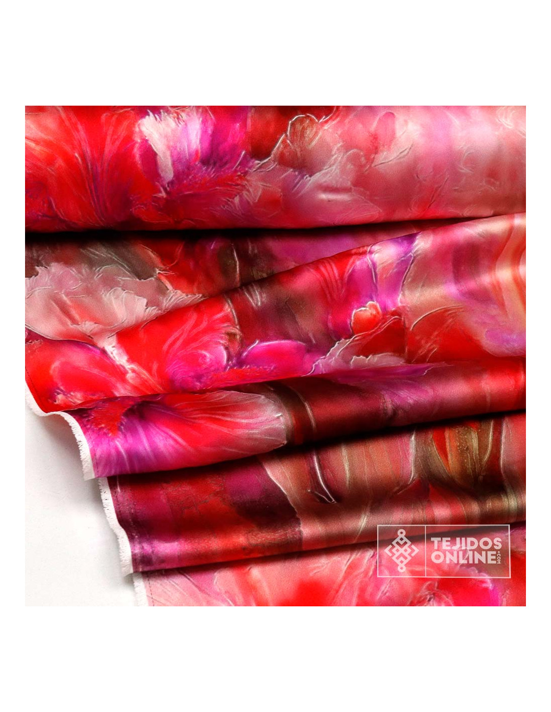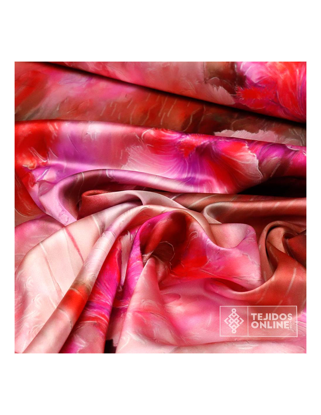 Tela Difuminado Fucsia con Flor una tela que combina la suavidad y brillo del satén. Este tejido estampado de forma floral al estilo acuerela donde destaca una flor de gran tamaño sobre una base de seda raso, tiene una caída fluida y brillo suave. Las flores, pintadas con estilo acuarela, destacan por tonos naturales como fucsias que se difuminan entre si.