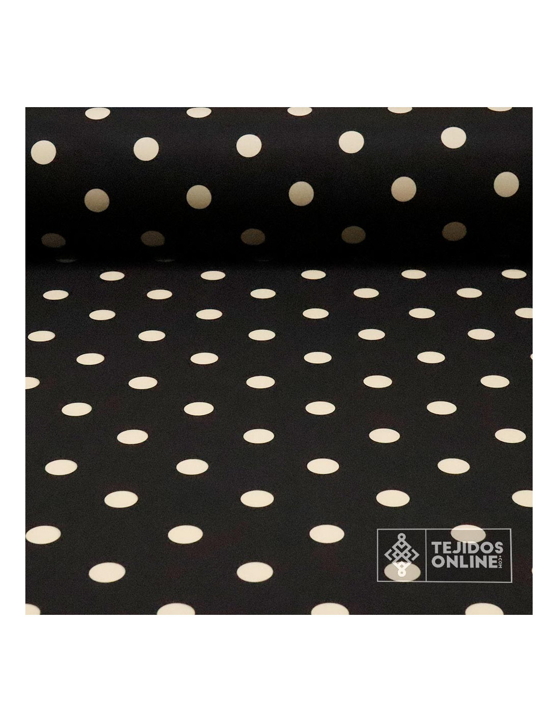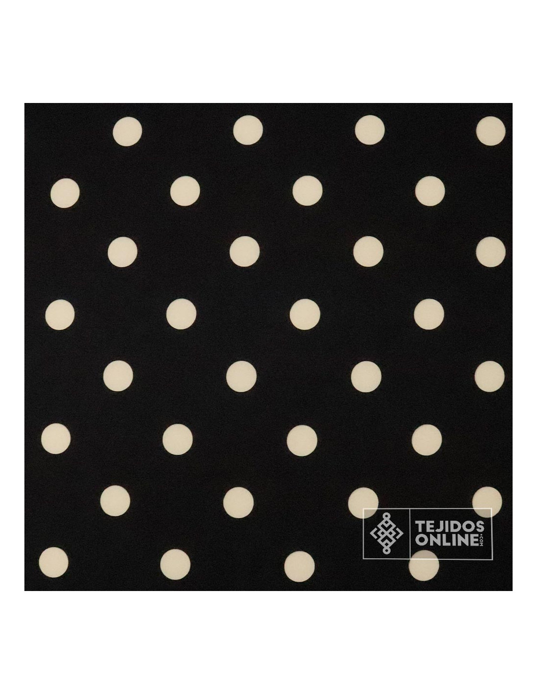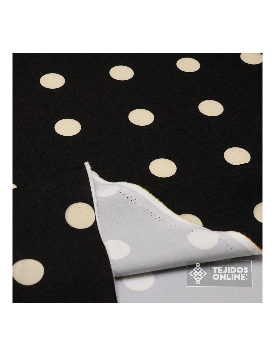 Tela de color negro con estampados de lunares de color camel (café con leche) de un tamaño 2.8 cm de diámetro. Esta tela es un tejido conocido como tela de stretch o también conocida como tela de plana, con un ancho de 1.50 metros se caracteriza por ser un tejido con caída, vuelo y cierto cuerpo siendo así una tela fácil de coser ya que no ofrece resistencia. Tejido que no necesita planchado ni se arruga siendo un tejido con gran movimiento y doble de ancho.