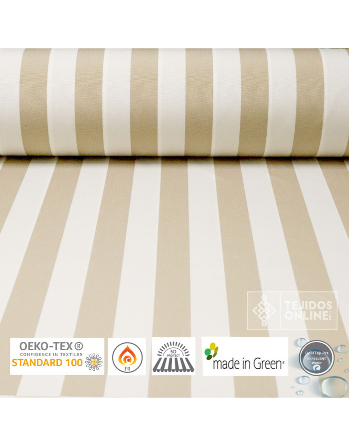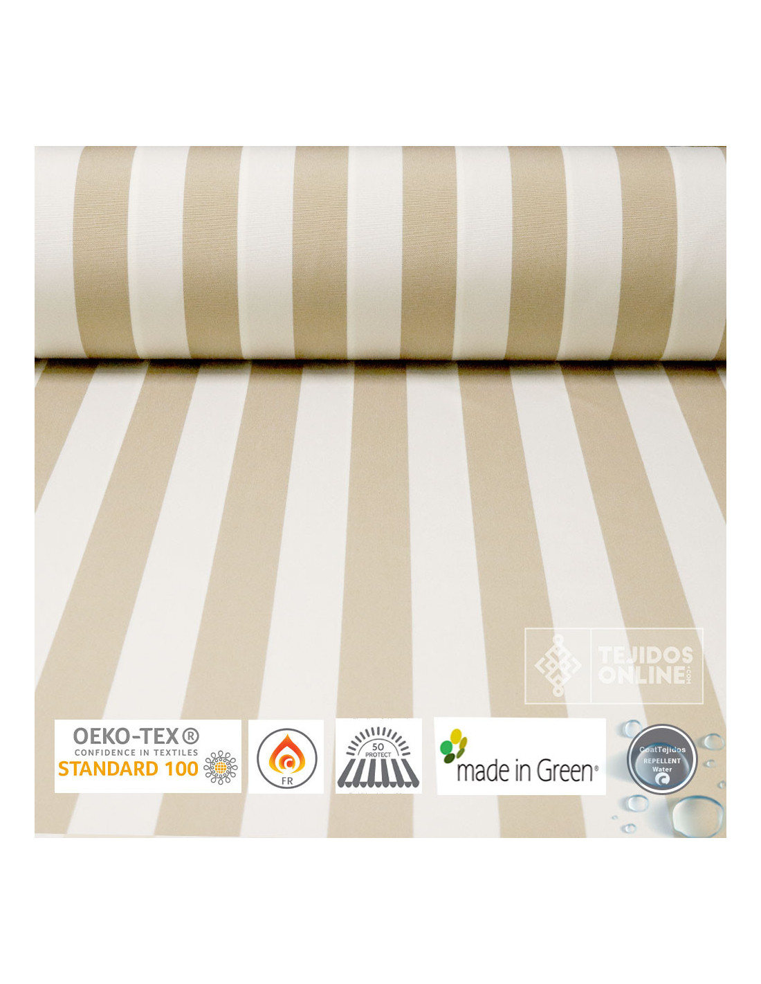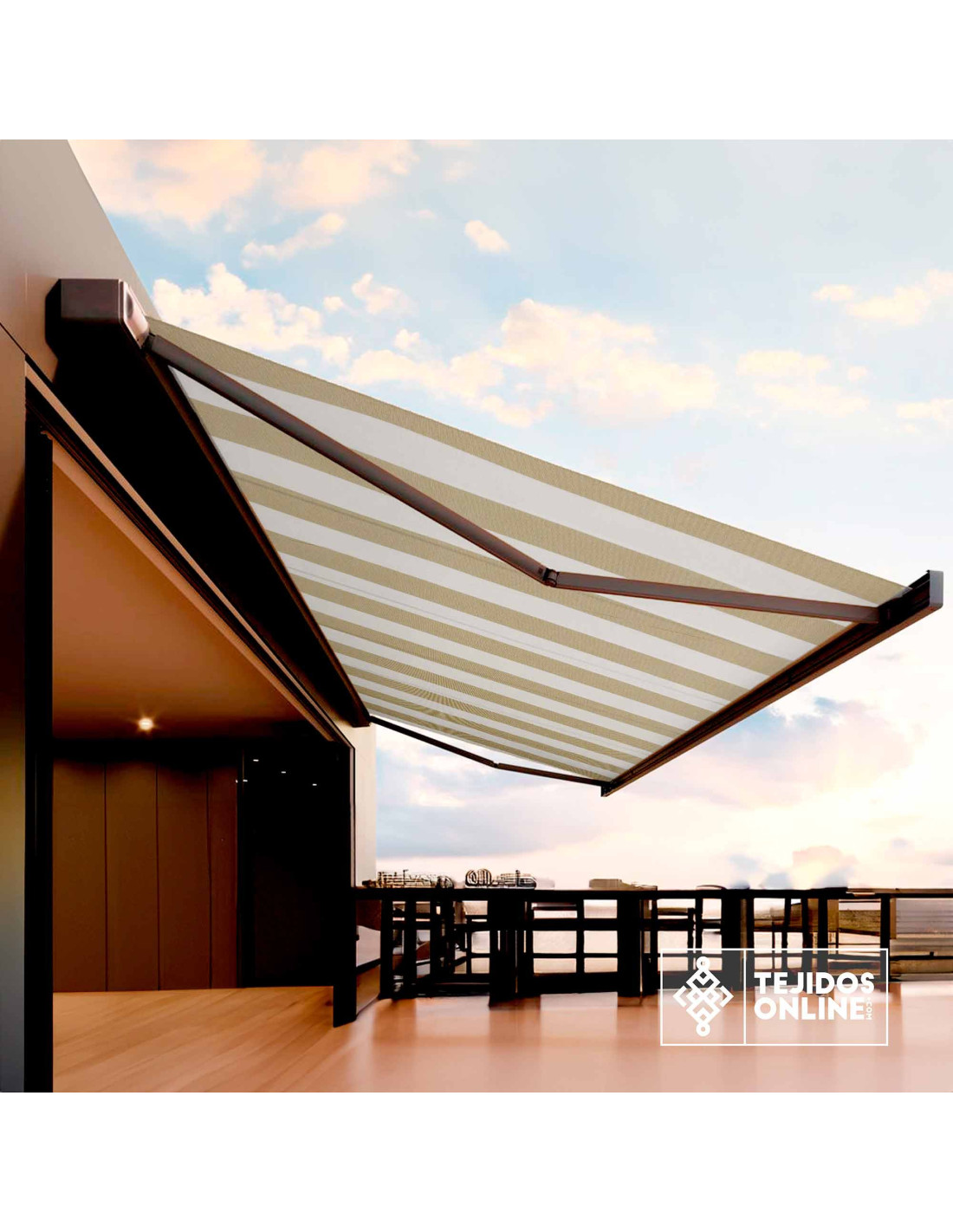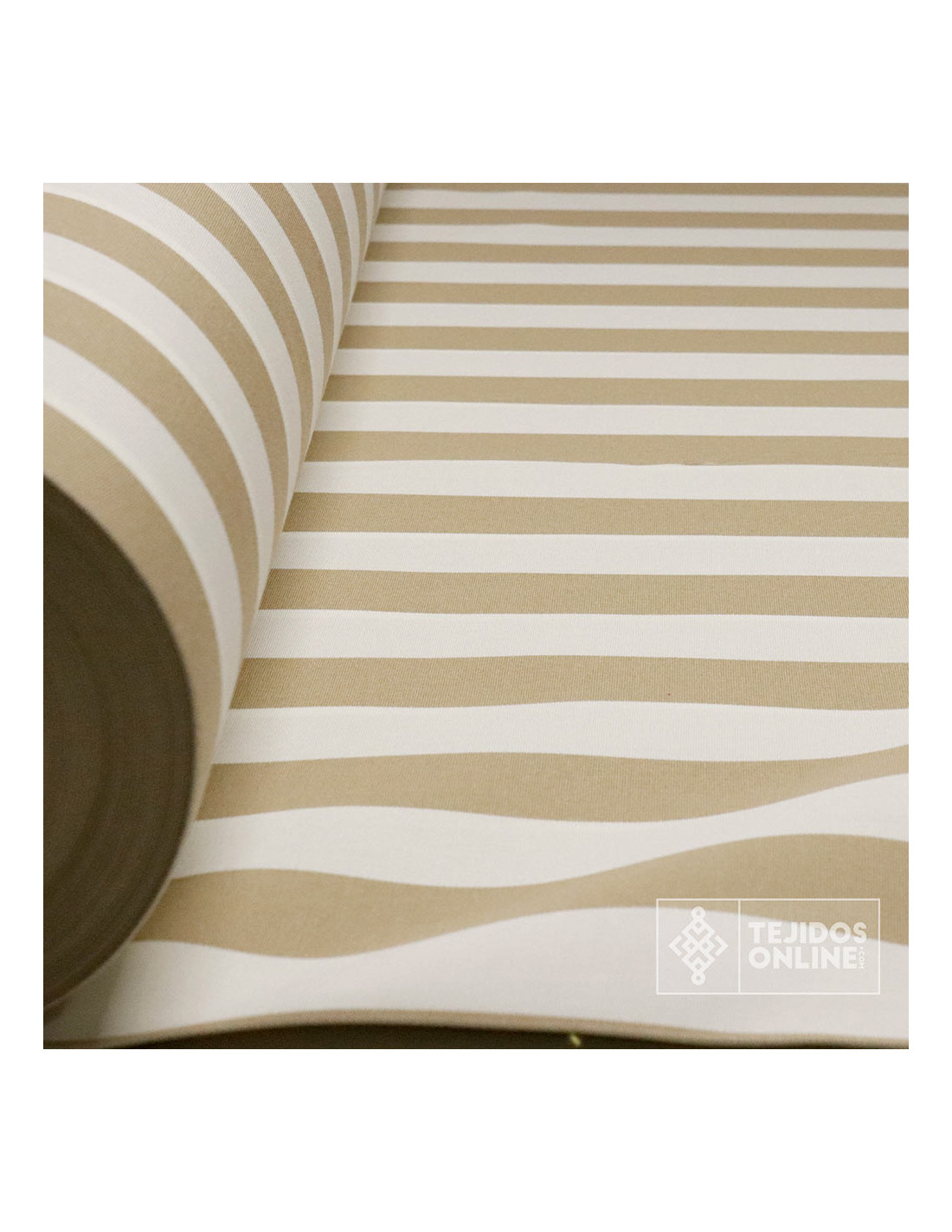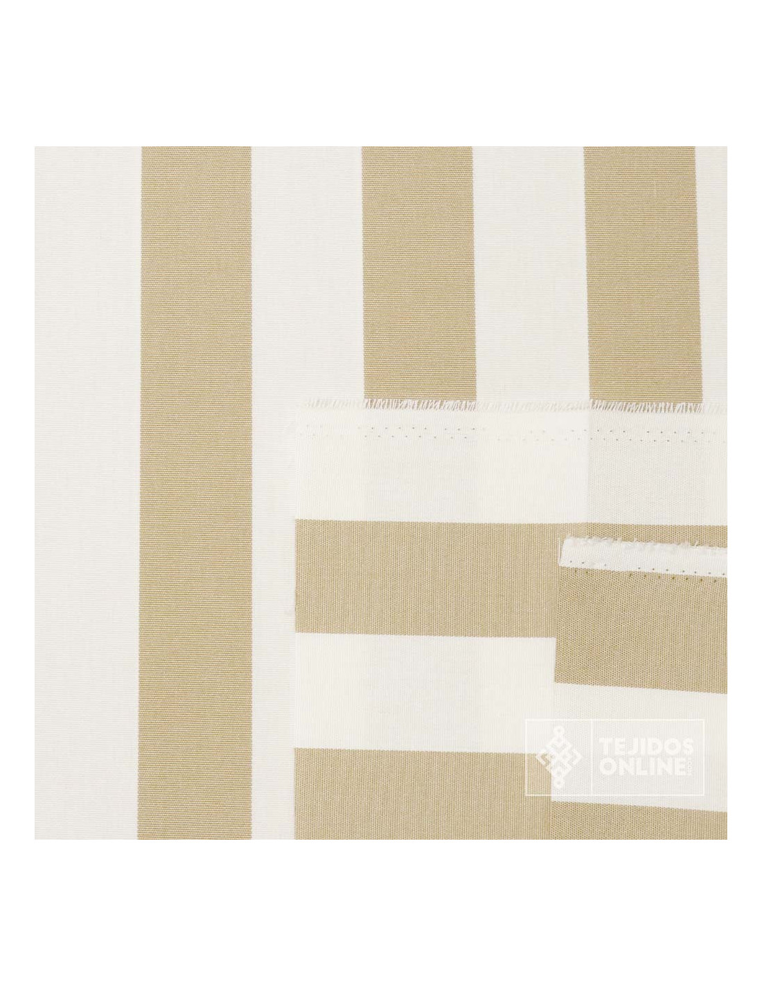 Lona de toldo de rayas en color blanco y camel, toldo con un ancho de 3.20 metros siendo un tejido de cierto grosor, con un tacto poroso, fabricado poliéster reciclado. Este toldo de rayas de colores se caracteriza por la gran variedad de usos que podemos realizar con él, desde tapizados hasta sombras para exteriores. Gracias a su tonalidad blanca y camel esta lona de toldo absorbe gran cantidad de luz para tener una sombra de gran calidad en tus espacios exteriores.