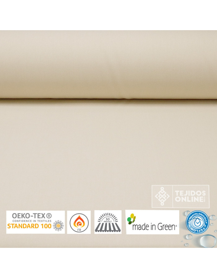 Es un Toldo de gran calidad al tacto, esta lona puedes verla y localizarla en cualquier terraza, balcón o escaparate de tienda "esos que vienen con los mecanismos de tijeras desplegable o instaladas en mecanismos de railes". Es una tela de toldo resistente al agua pero no impermeable pudiendo aguantar lluvias intensas siempre que se encuentra instalado bien recto, tenso y con pendiente. Tiene un color beige muy bonito con gran anchura y ligera de peso. Tela de toldo que se puede lavar y coser perfectamente.