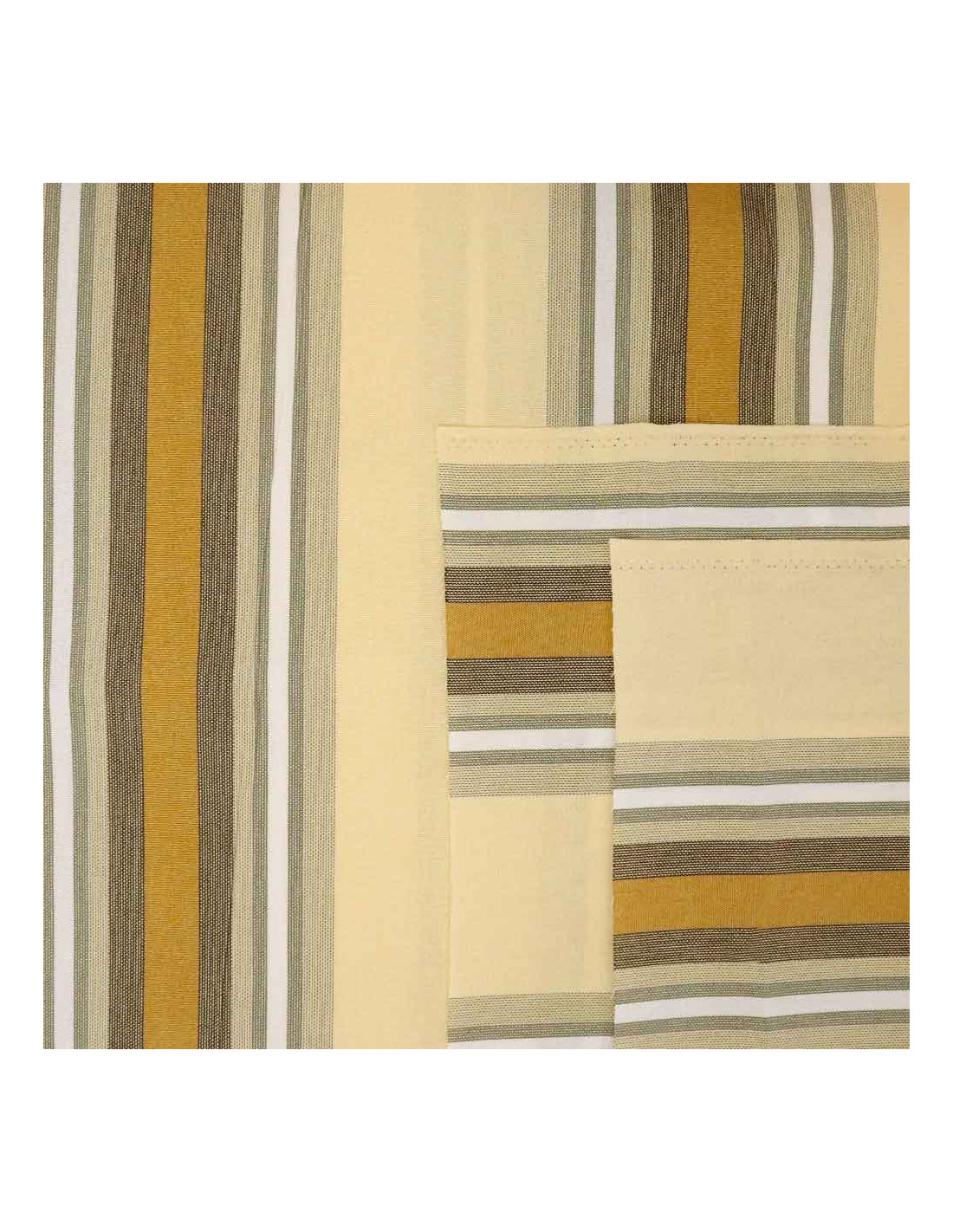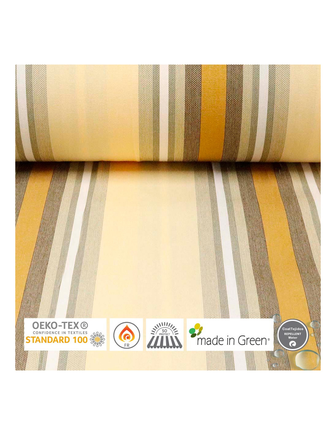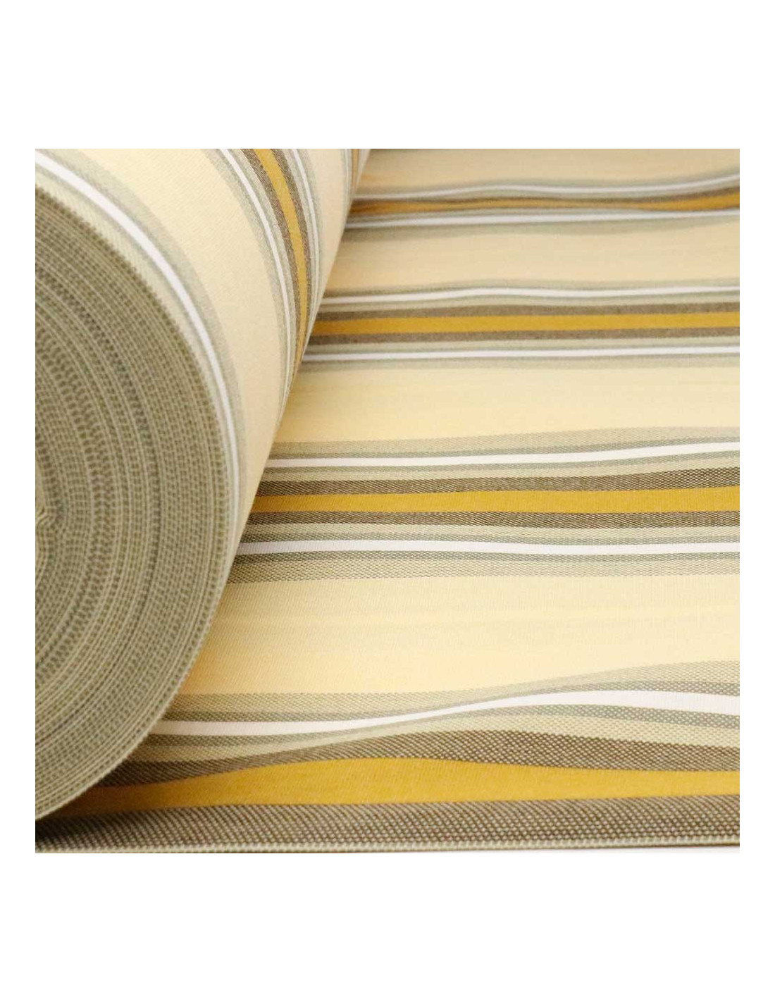 Conoce nuestra lona de toldo de rayas en color tierras donde predominan el color albero, beige blanco y camel, os cuento más sobre este precioso toldo. Es una lona de Toldo con un ancho de 3.20 metros siendo un tejido de cierto grosor, con un tacto poroso, fabricado poliéster reciclado. Este toldo de rayas se caracteriza por la gran variedad de usos que podemos realizar con él, desde tapizados hasta sombras para exteriores. Gracias a su tonalidades esta lona de toldo absorbe gran cantidad de luz para tener una sombra de gran calidad en tus espacios exteriores sin perder la claridad.