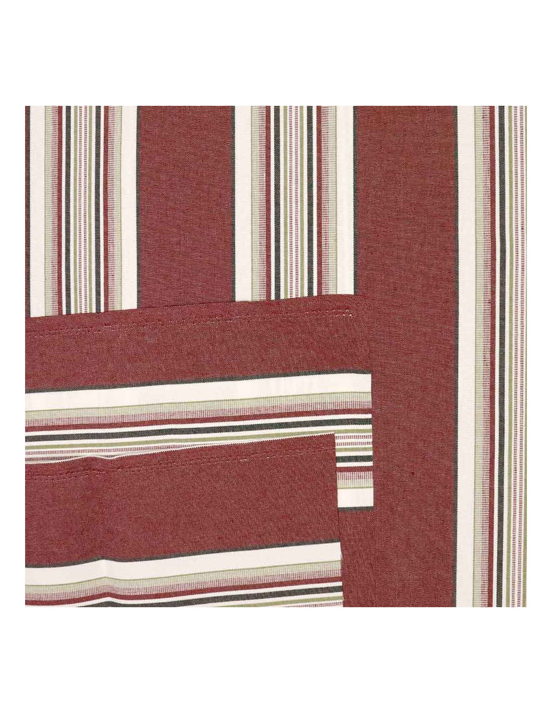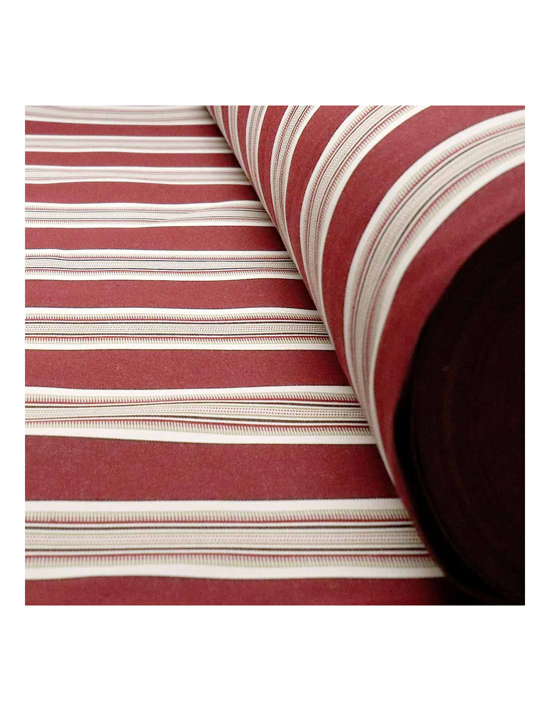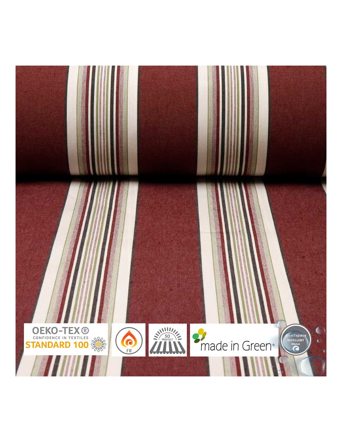 Conoce nuestra lona de toldo de rayas en color burdeos y pequeñas rayas de color verde caqui, blanca y negra. Toldo con un ancho de 3.20 metros siendo un tejido de cierto grosor, con un tacto poroso, fabricado poliéster reciclado. Este toldo de rayas se caracteriza por la gran variedad de usos que podemos realizar con él, desde tapizados hasta sombras para exteriores. Gracias a su tonalidades oscuras esta lona de toldo absorbe gran cantidad de luz para tener una sombra de gran calidad en tus espacios exteriores.