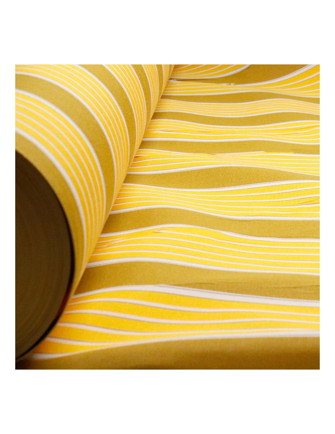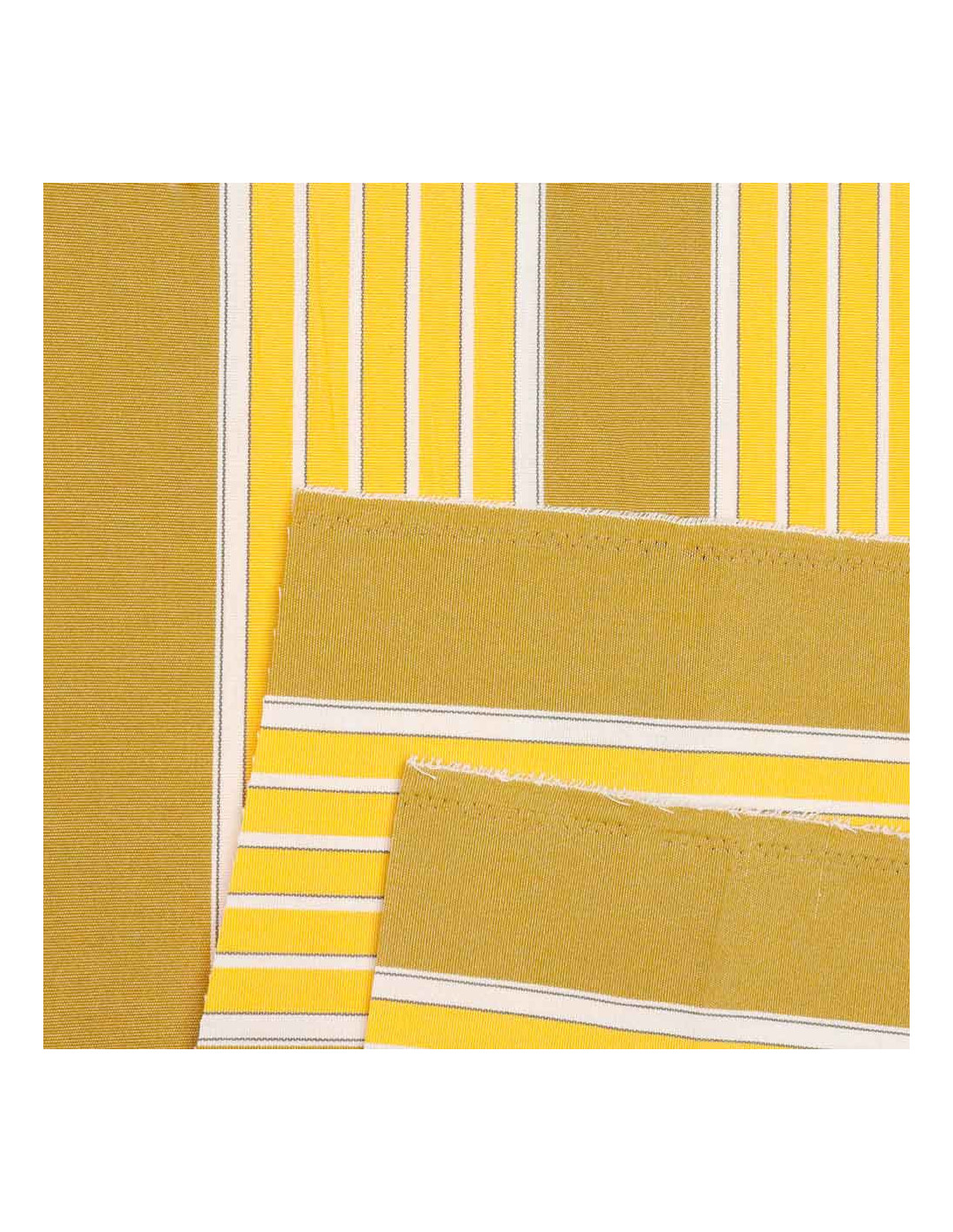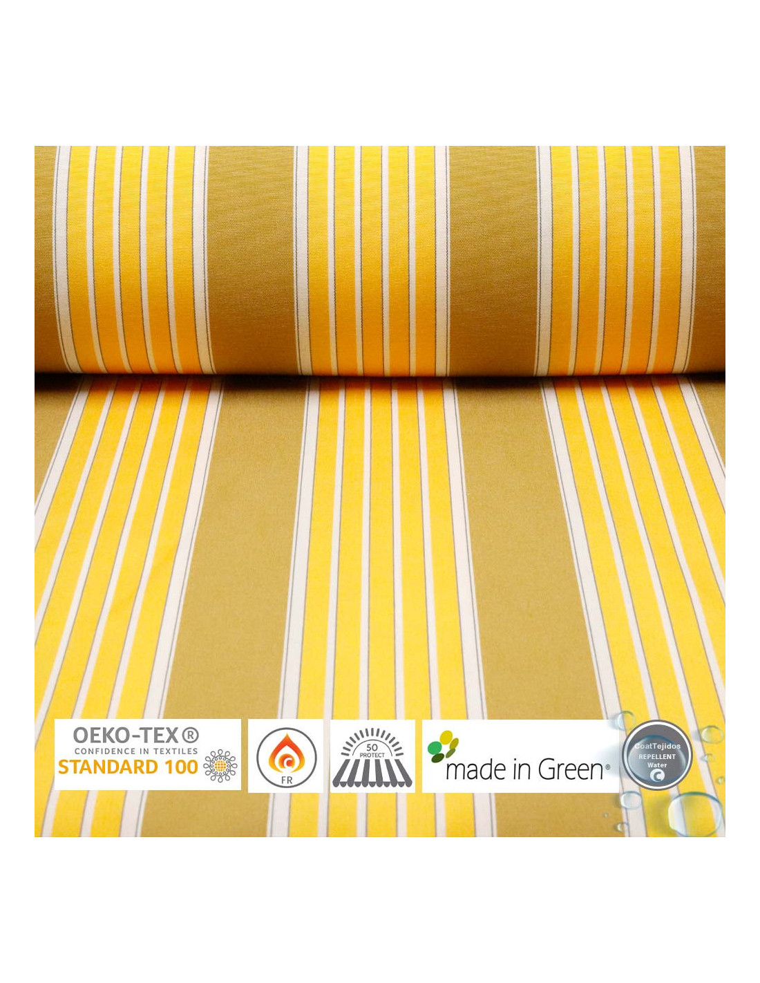 Conoce nuestra lona de toldo de rayas en color amarillo y mostaza con unas finas rayas de color blanco destacante. Toldo con un ancho de 3.20 metros siendo un tejido de cierto grosor, con un tacto poroso, fabricado poliéster reciclado. Este toldo de rayas se caracteriza por la gran variedad de usos que podemos realizar con él, desde tapizados hasta sombras para exteriores. Gracias a su tonalidades oscuras esta lona de toldo absorbe gran cantidad de luz para tener una sombra de gran calidad en tus espacios exteriores.