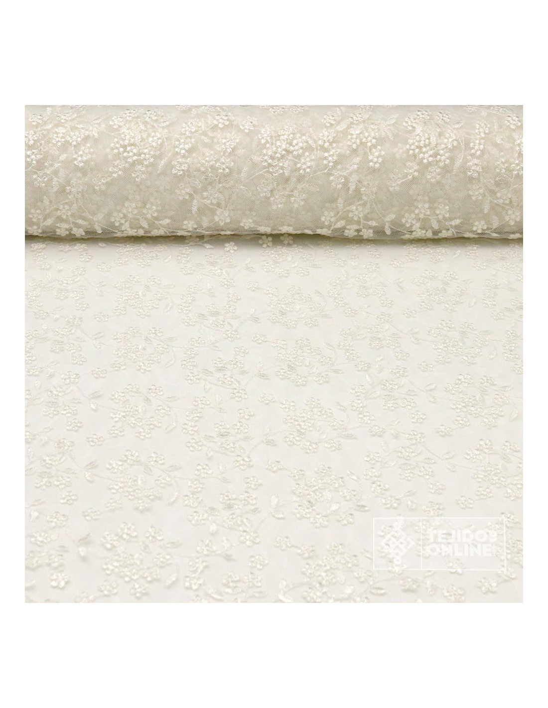 Este tul bordado en blanco roto tiene un diseño de pequeñas flores repartidas por todo el tejido, con detalles bien marcados que crean un efecto elegante pero muy fácil de combinar. Las flores tienen un tamaño aproximado de 1 cm y están bordadas sobre una base de tul que se adapta muy bien a diferentes usos.
