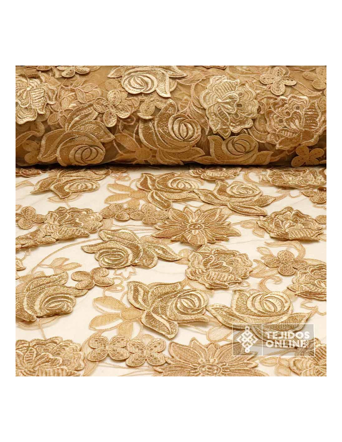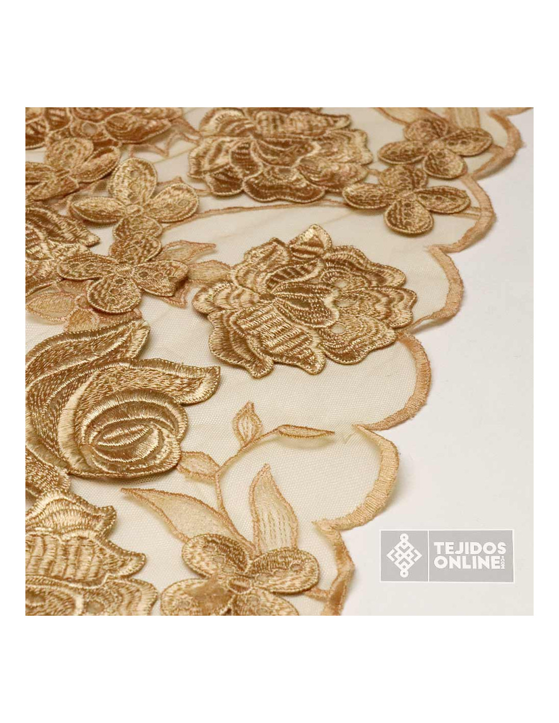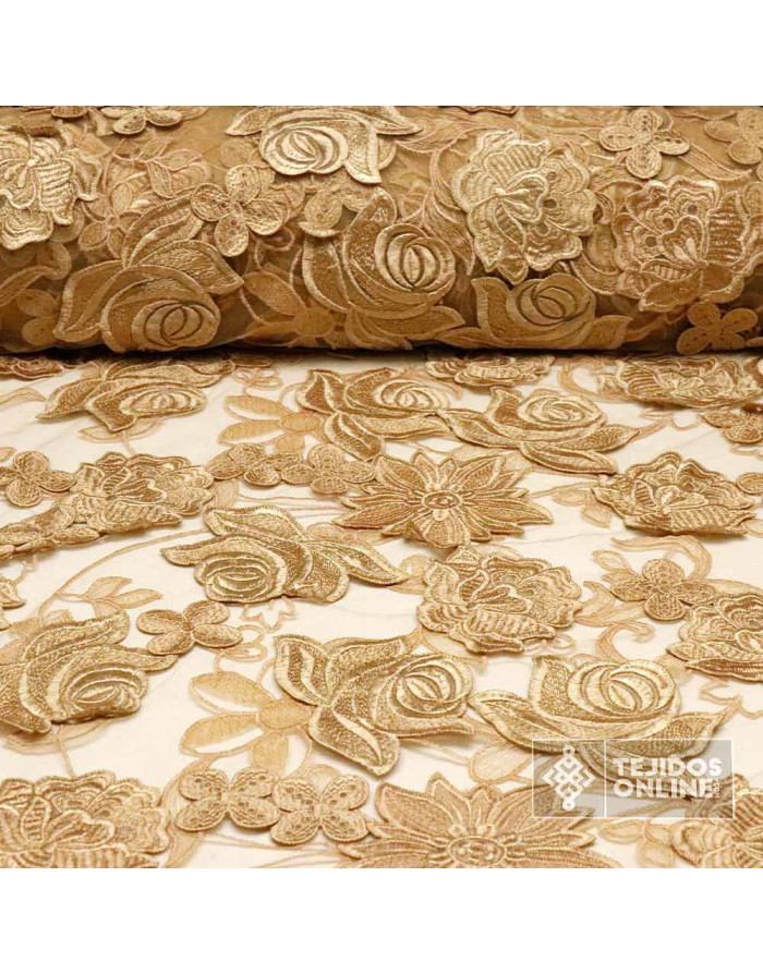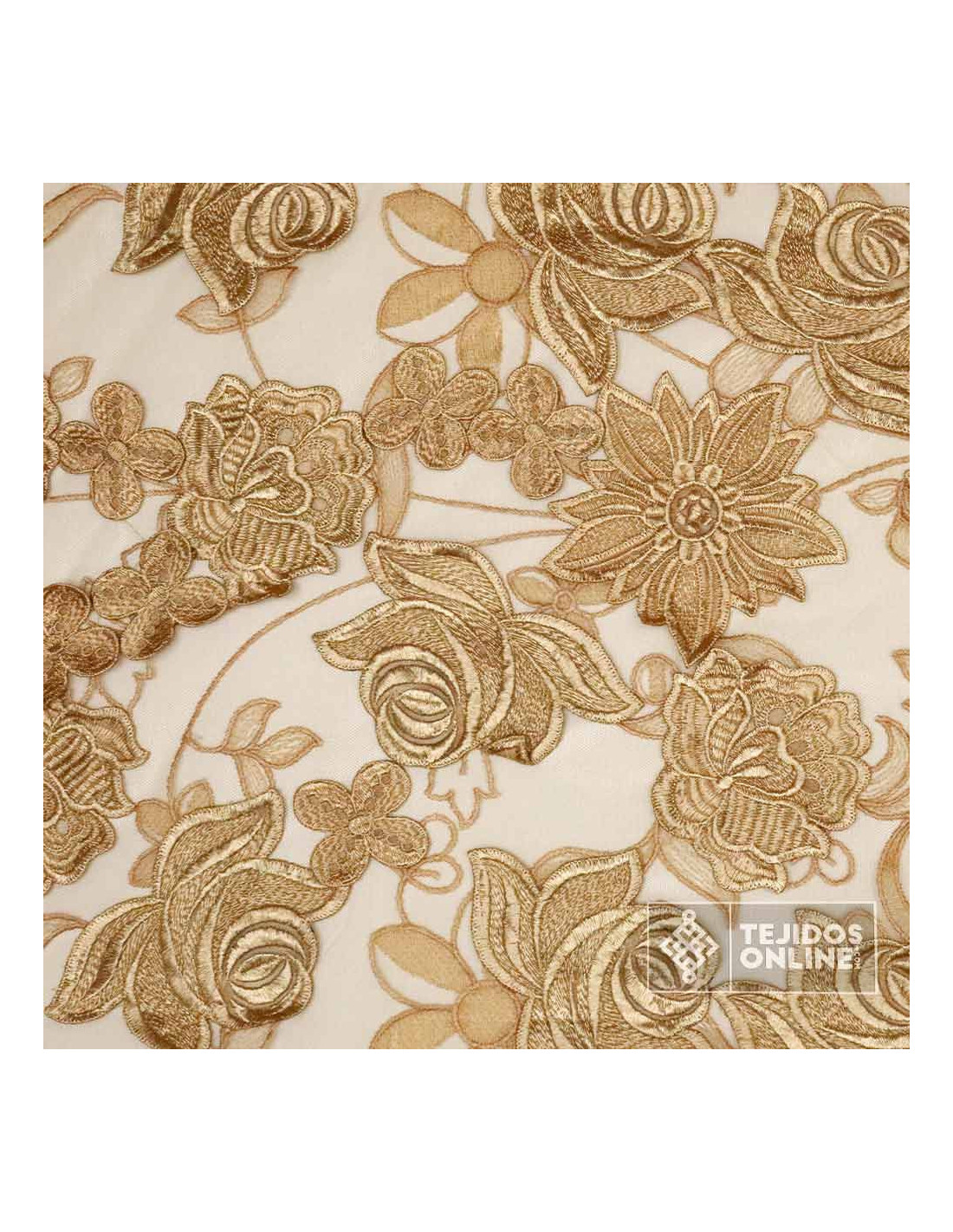 El Tul bordado Leticia es un tejido de flores de color camel bordadas de diferentes tipos y tamaños fijadas a una base de tul del mismo color. Es un tejido de tul boradado es un tejido con transpariencia y acabado en puntas en ambos extremos. Es una tela compuesta en 100% poliéster y con una ancho de 1.35 metros.