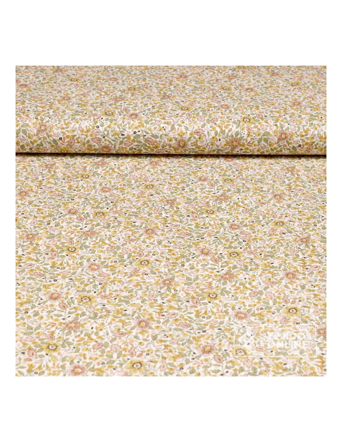 La Viella Flores Mostaza Liberty, es un tejido compuesto en 100% algodón con estamapdos de pequeñas flores destacando el color mostaza y con hojas verdes y rosa nude. Esta viella es un tejido de cierto cuerpo, con gran suavidad, poco peso y sin lycra siendo ideal para añadir un toque de originalidad a cualquier proyecto de moda infantil. Esta viella es un tejido ideal para confecciones infantiles siendo un tejido doble de ancho.