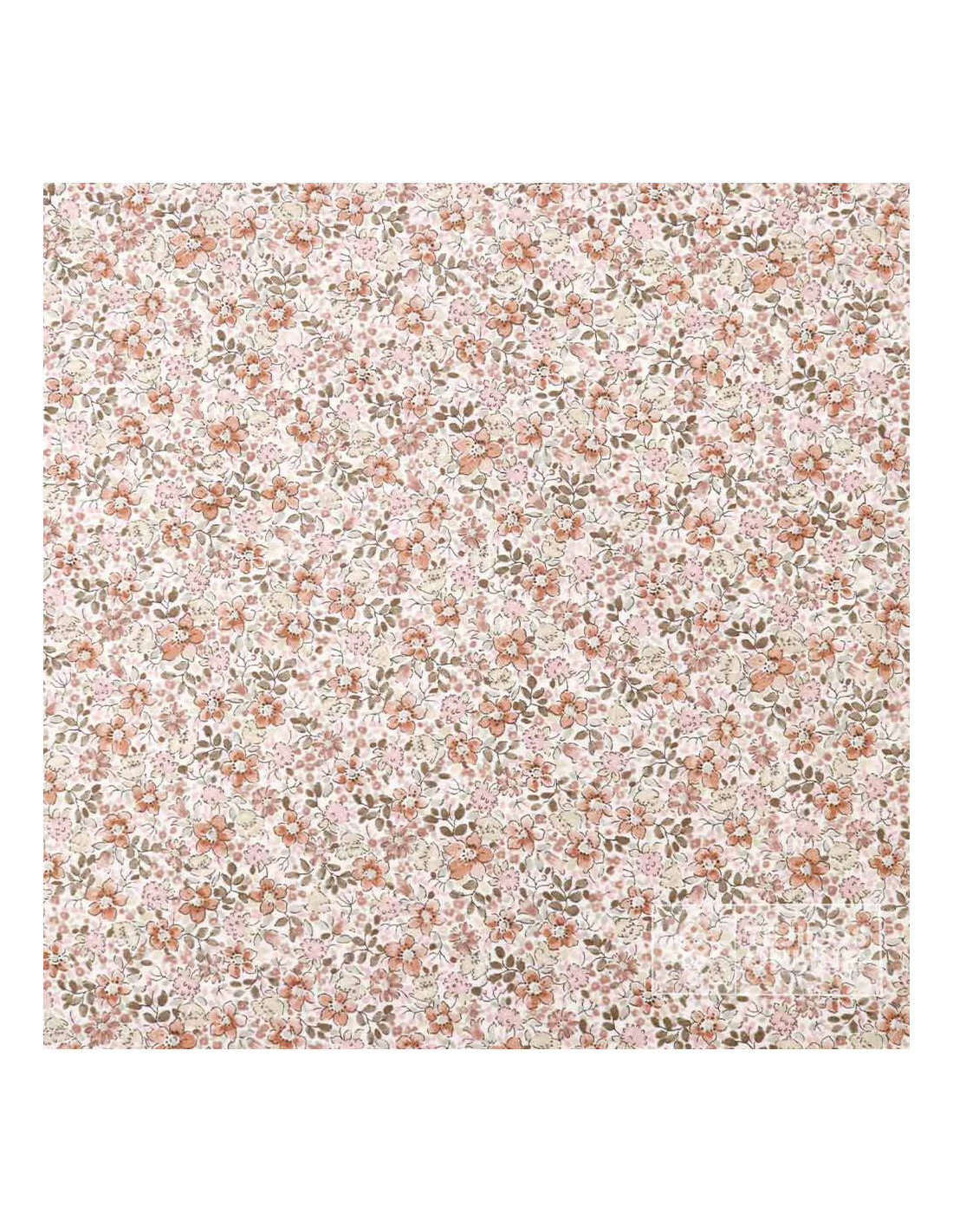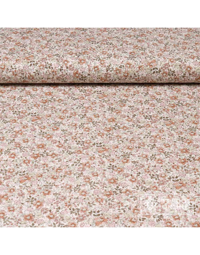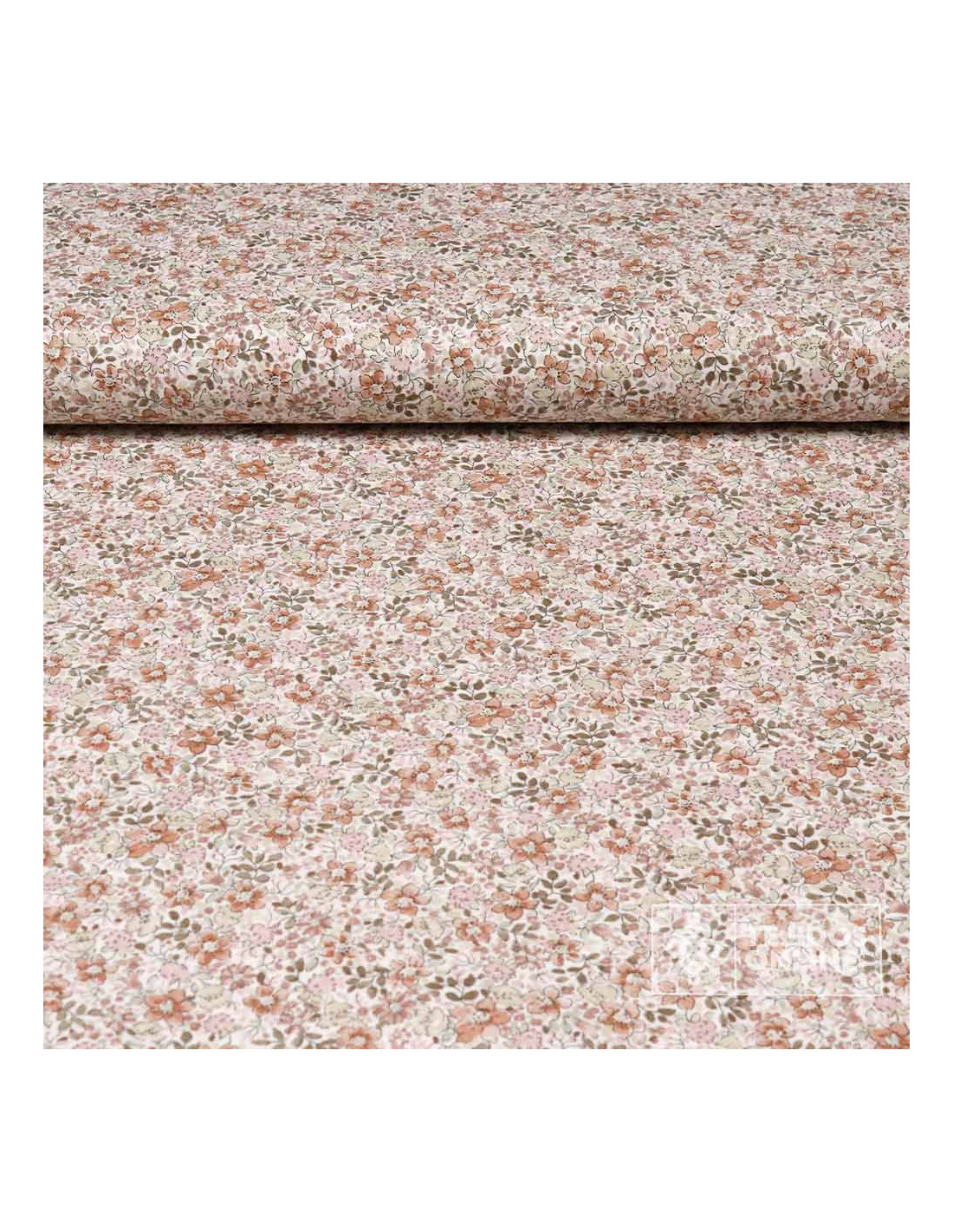 Esta viella 100% algodón luce un estampado floral liberty de flores pequeñas (flor mayor ≈ 1 cm) en una paleta muy combinable de topo, caldera y celeste sobre fondo claro. El motivo es denso y sin dirección, perfecto para cortar en cualquier sentido sin perder continuidad.