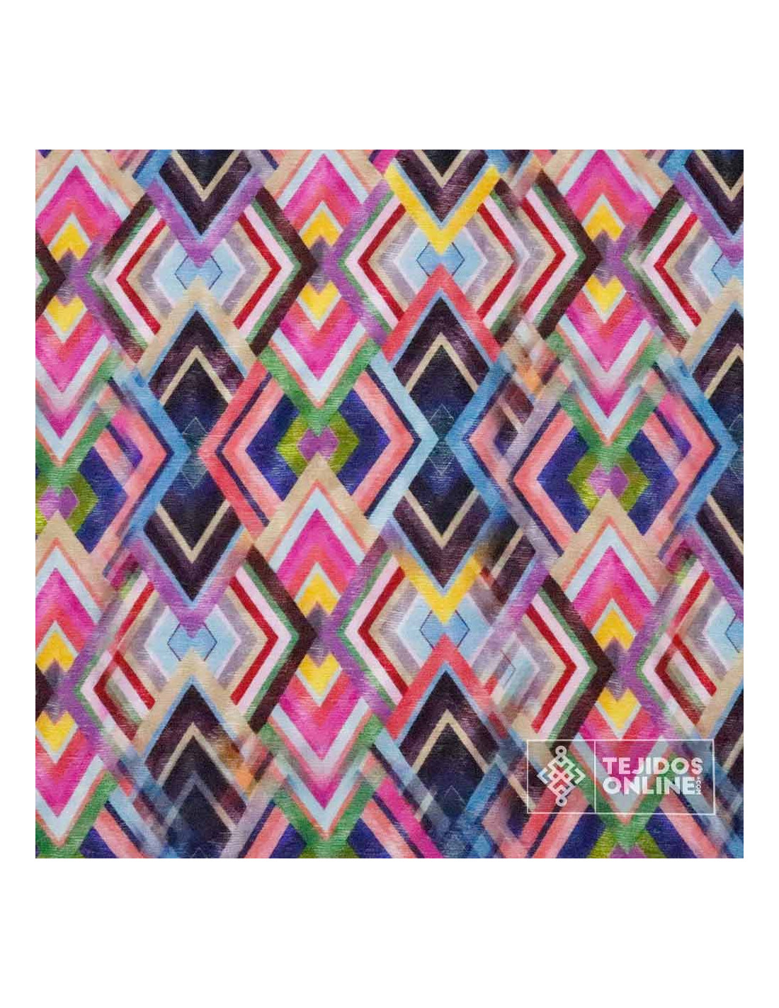 Es una tela de poco peso, cierta finura y además un estampado al estilo óptico o al estilo étnico gracias a sus rombos multicolores producen esa senasación. Su color es intenso, es un tejido agradable para el cuerpo e ideal para temperaturas cálidas. Su principal uso son las confecciones de moda primavera verano.