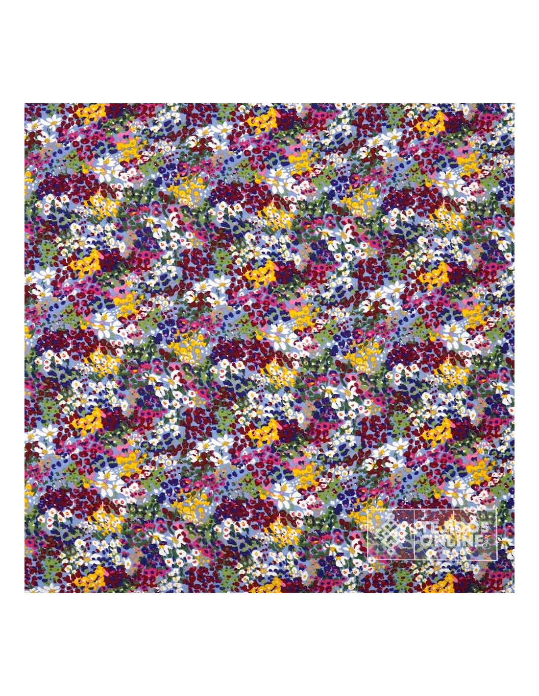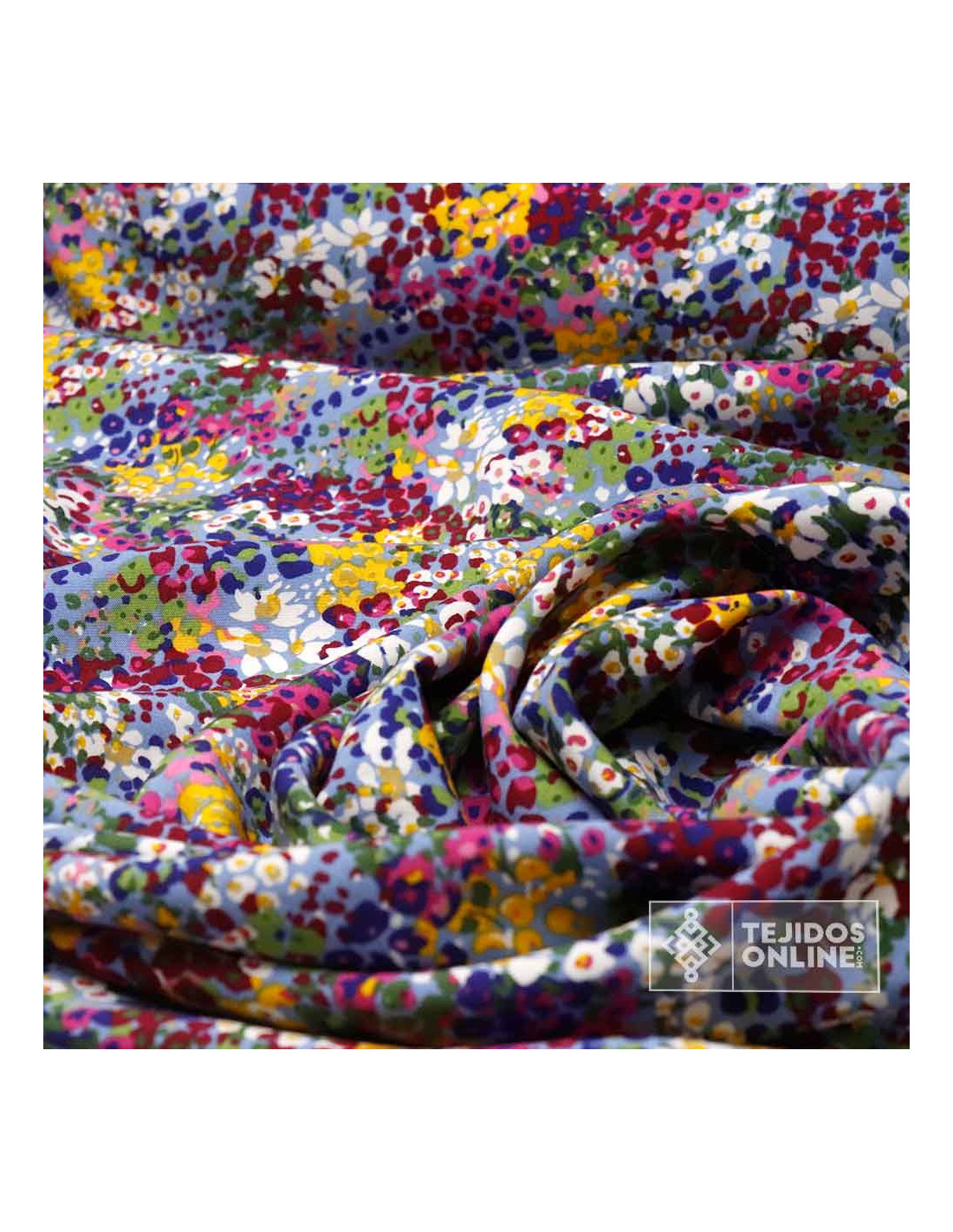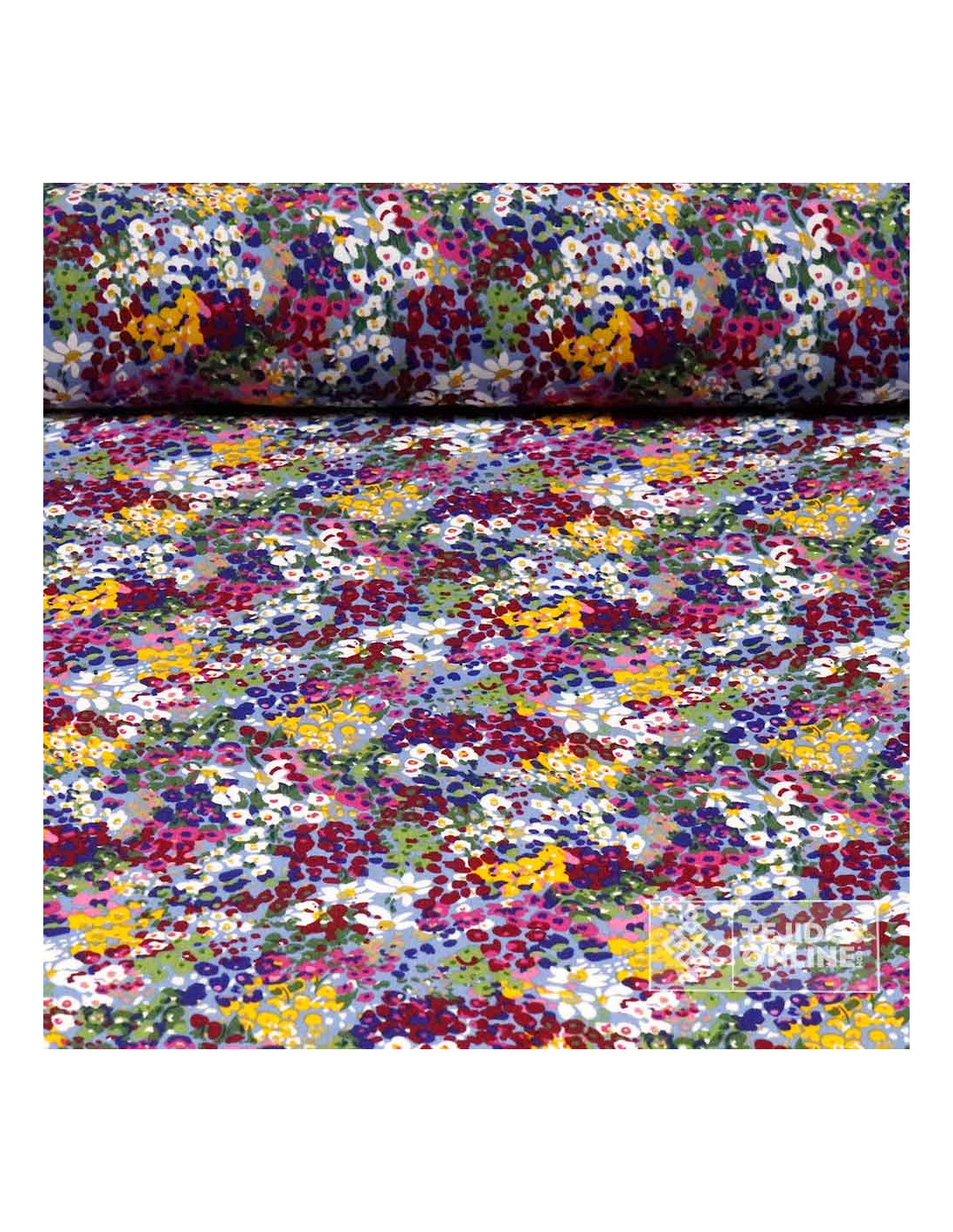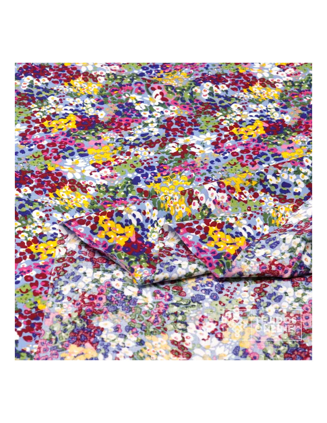 Esta tela 100% viscosa presenta un estampado floral moteado de diminutas flores (≈1 cm de diámetro) en tonos blancos, amarillos, malvas y fucsias sobre un fondo celeste. El patrón, muy denso y sin dirección aparente, aporta un efecto vivo y elegante.