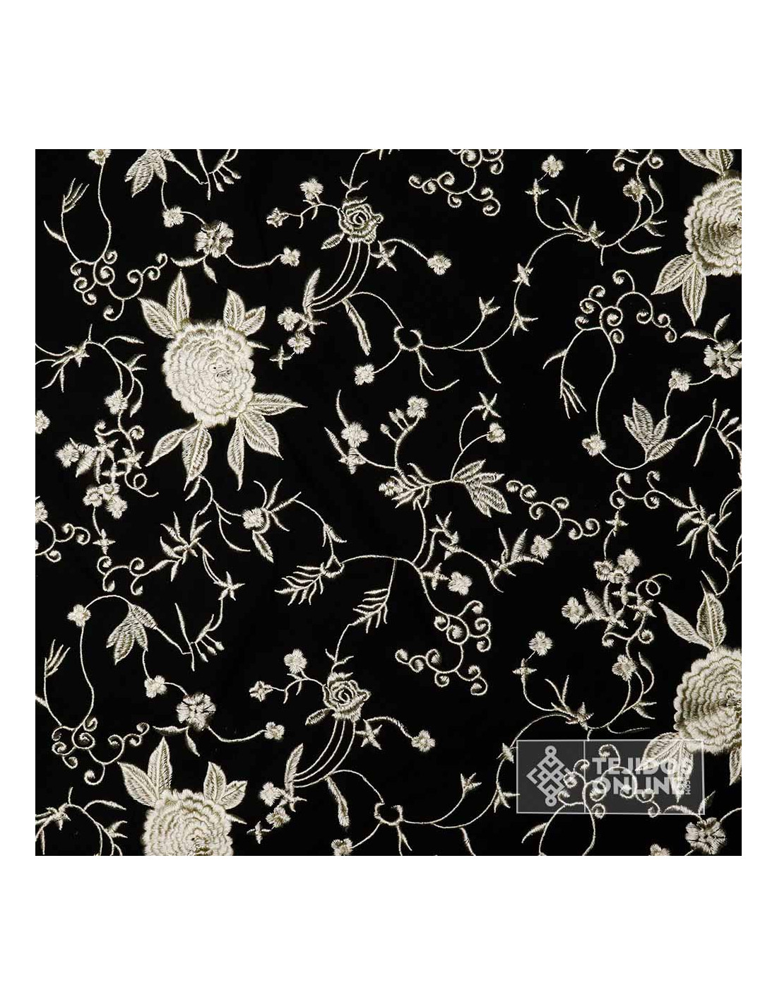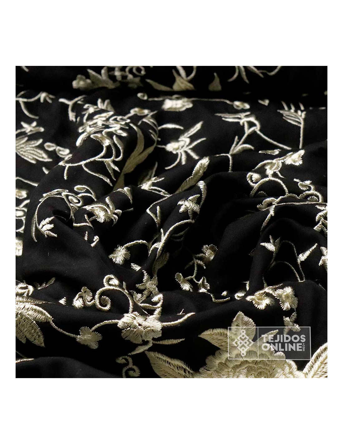 En el mundo de las telas para mantón de manila, pocas pueden presumir de la elegancia y calidad que ofrece esta maravillosa viscosa bordad ideal para mantón de manila, voy a contarte más sobre ella. Esta tela compuesta en 100% viscosa se caracteriza por su fondo en color negro y bordados en flor de un color oro viejo de diferentes tamaños y posiciones.