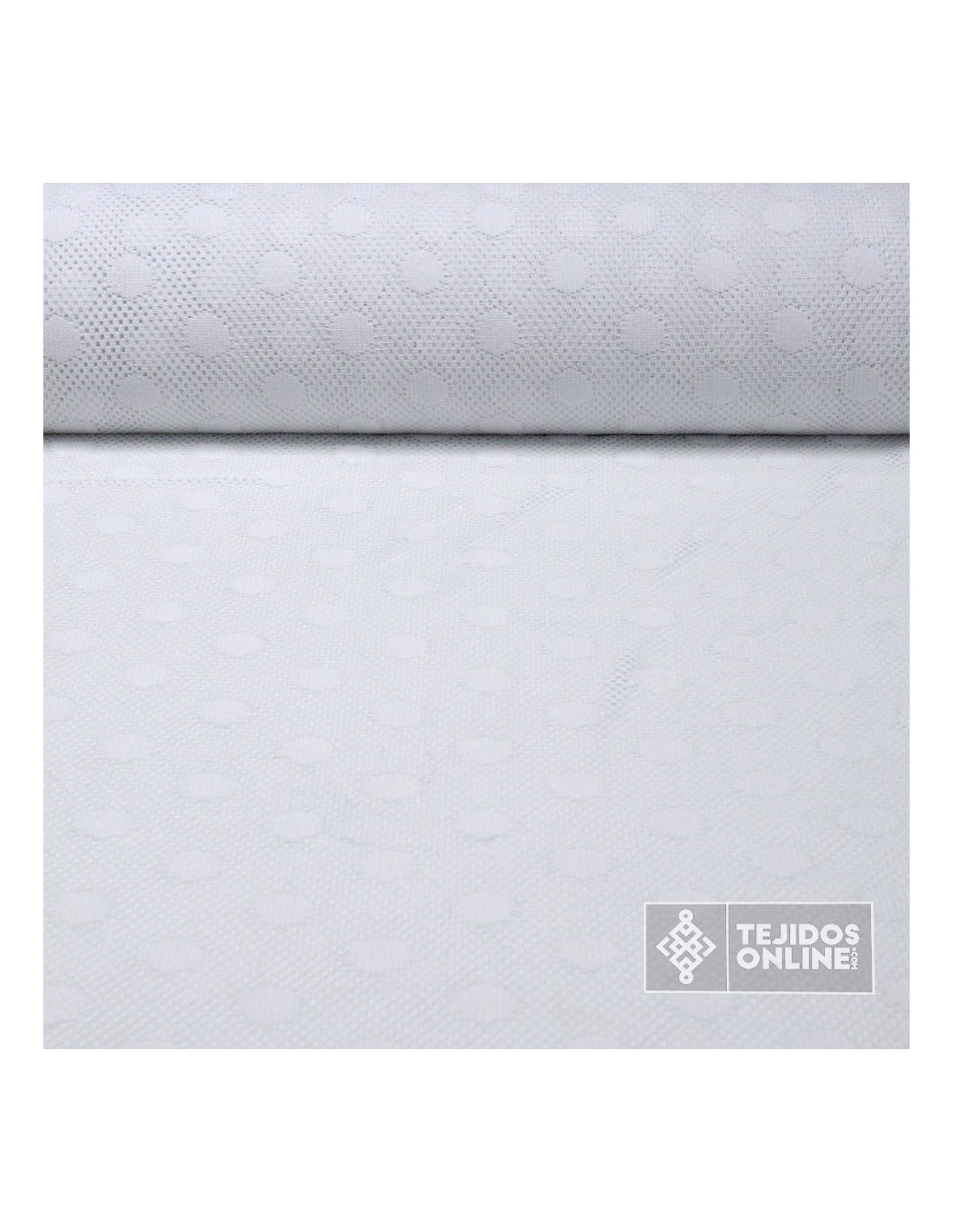 Descubre nuestra tela Visillo ideal para casetas de feria , este visillo es un tejido con una altura de 2.90 metros, compuesto en un 100% de poliéster. Su diseño con lunares y un fondo brocado en formas de cuadros te hace viajar directamente a un ambiente de feria sensacional. Es un visillo de poco peso, doble de ancho y con cierto cuerpo ideal para cortinas, de un color blanco intenso y muy característico gracias a sus lunares. .