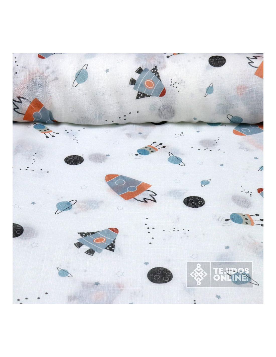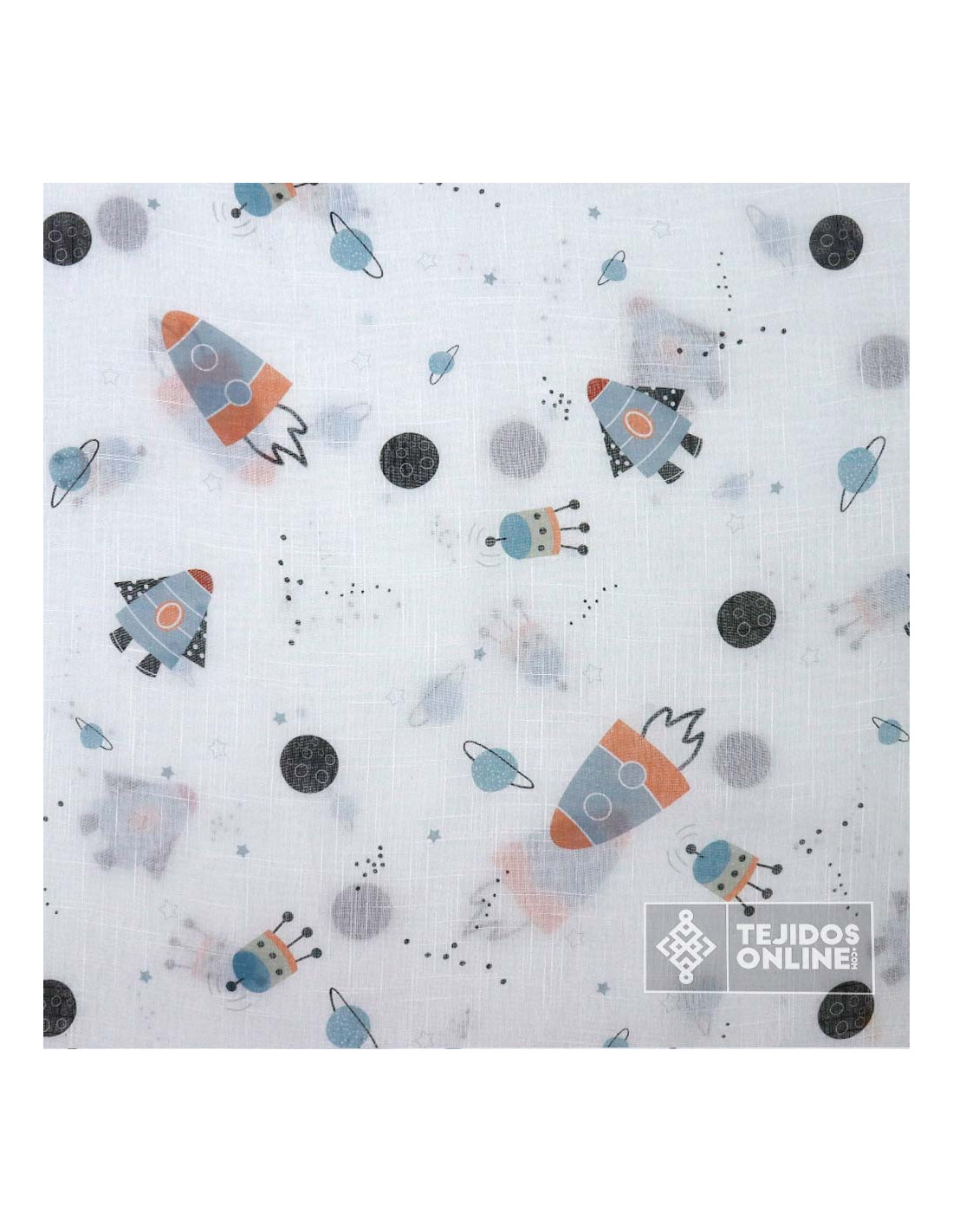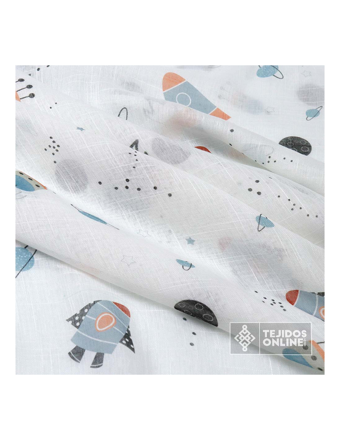 Descubre nuestra tela Visillo Cohetes Infantil, este visillo es un tejido con una altura de 3.00 metros, compuesto en un 100% de poliéster. Su diseño presenta un divertido espacio con cohetes, estrellas, planetas, estrellas y marcianos sobre un fondo color blanco. Como hemos dicho antes, es un tejido con alto de 3 metros aunque es un estampado de forma asimétrica así que podrás jugar con la dirección del dibujo.