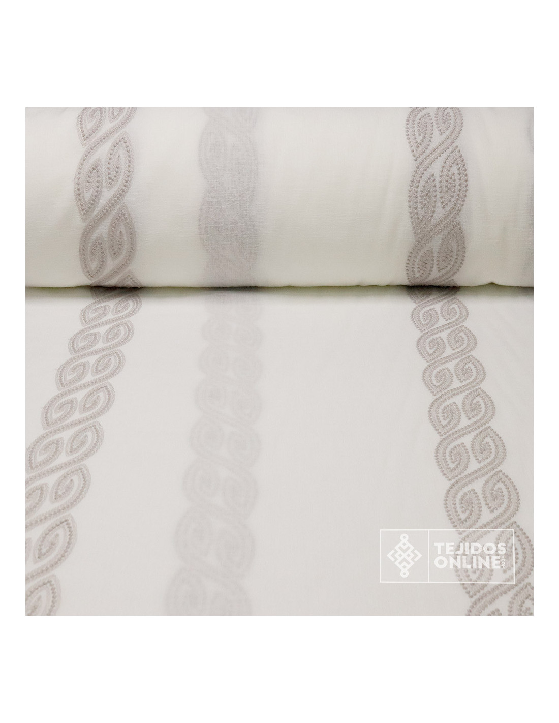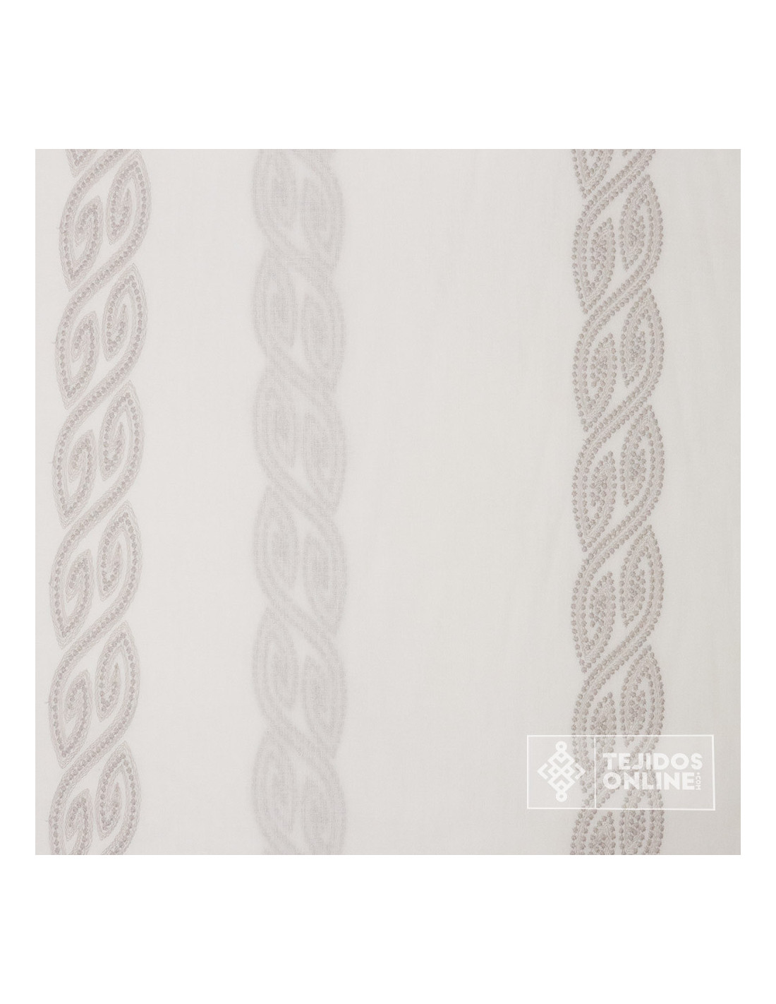 Descubre nuestra Visillo Blanco Roto Bordado Franja Camel y Gris con acabado en plomo en su bajo. Este visillo es un tejido con una altura de 2.90 metros, compuesto en un 100% de poliéster. Su diseño con bordados de un estilo de forja de color camel o gris lo hacen ideal para cualquier cortina de visillo para salón o dormitorio. Es un visillo de cierto peso, doble de ancho y con cierto cuerpo ideal para cortinas de todo tipo.