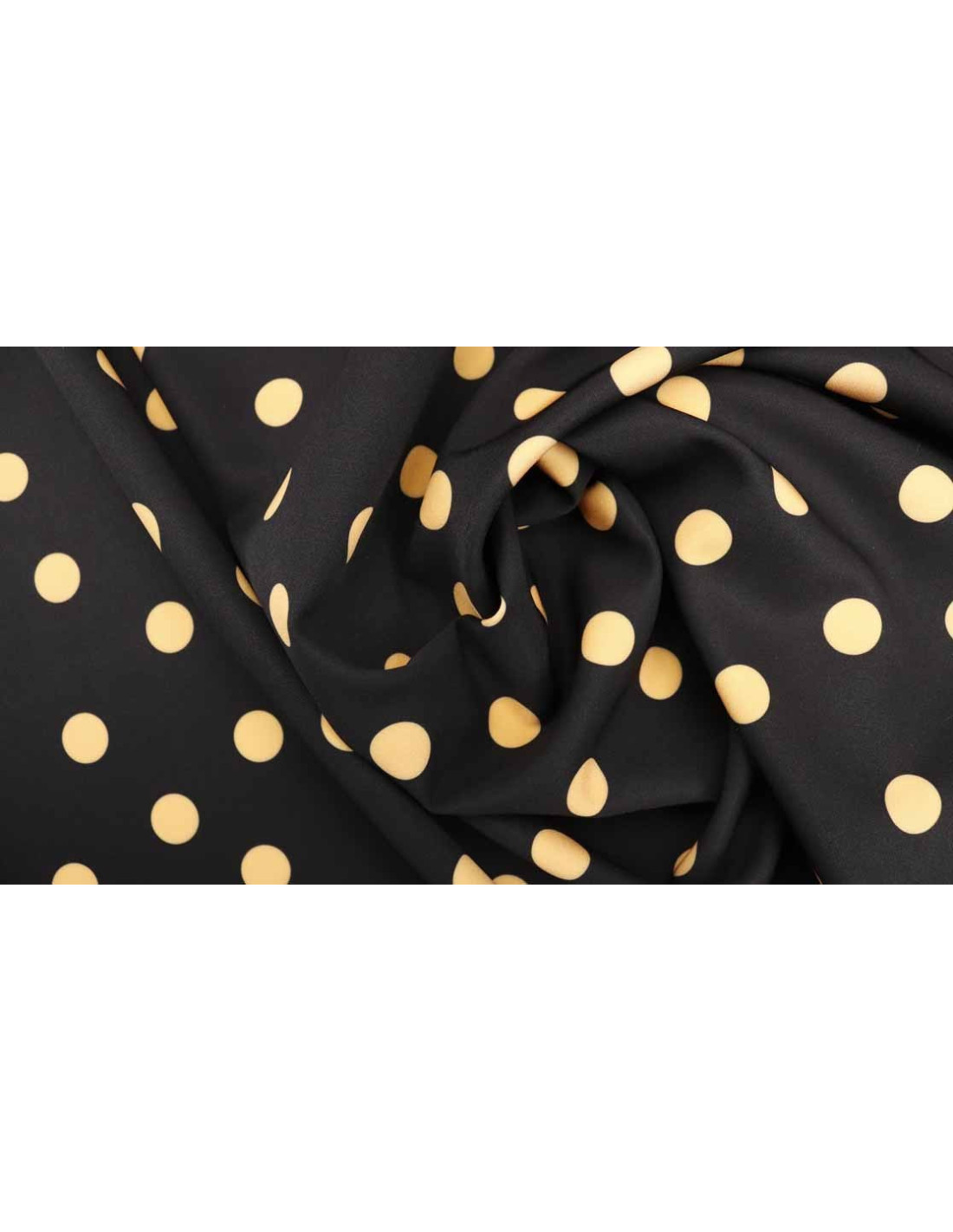 Crep Lycra Negro Lunar Mandarina, tejido con caída, cierto grosor y a la vez con lycra. Tejido con estampados de lunares de color mandarina de forma asimétricas sobre un fondo negro. Tela fácil de coser ya que no ofrece resistencia. Tejido utilizado para todo tipos de confecciones como; (blusas, faldas, trajes de chaqueta, pantalones, vestidos, trajes de flamenca, etc…).