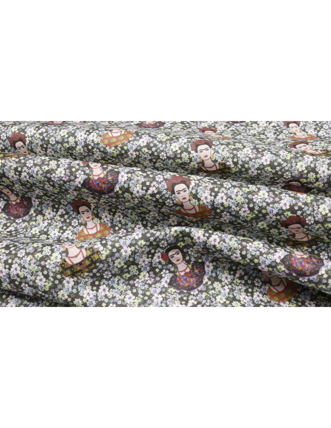 Algodón Frida Kahlo Extremeña, tejido con cierta finura y suavidad . Tejido con estampados de la conocida revolucionaria frida kahlo "Extremeña", sobre un fondo oscuro con flores pequeñas. Este tejido, es una tela fácil de coser ya que no ofrece resistencia. Es utilizado para todo tipos de confecciones como; (camisas, vestidos, manualidades, patchwork, etc…).