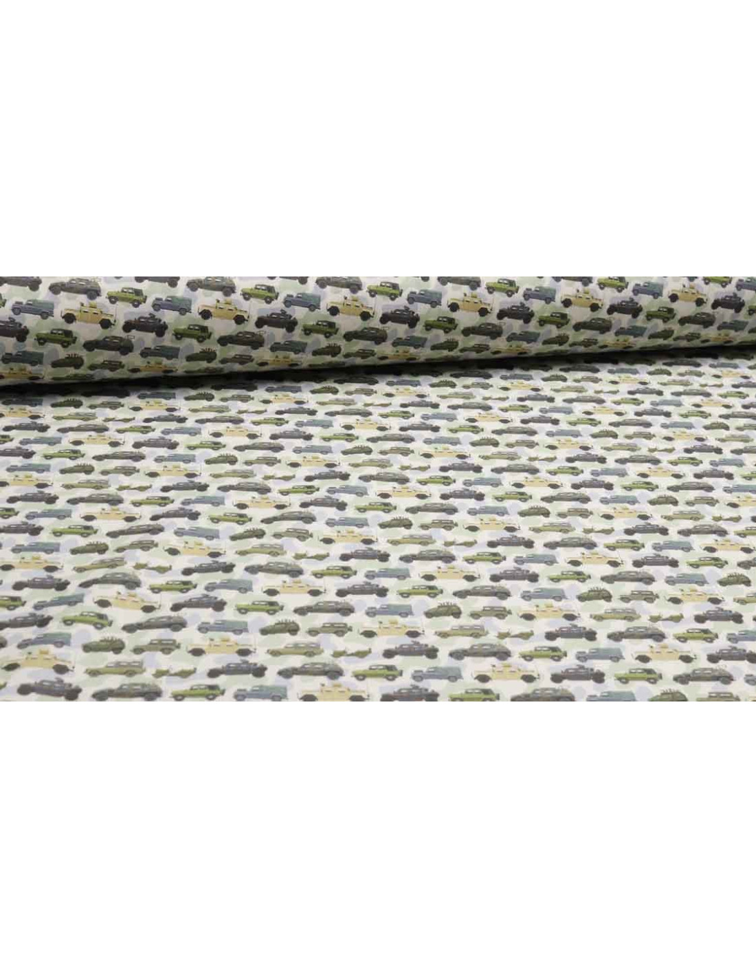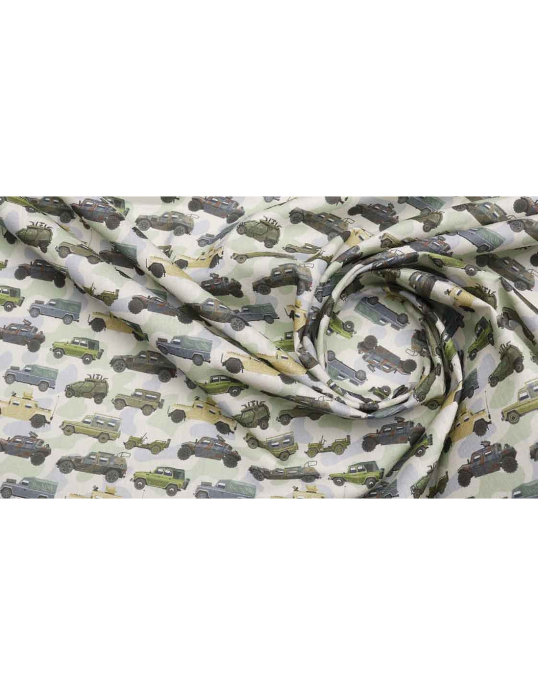 Algodón Coches Ejercito, tejido con cierta finura y suavidad . Tejido con estampados de coches militares, sobre un fondo gris claro y estampado militar claro. Este tejido, es una tela fácil de coser ya que no ofrece resistencia. Es utilizado para todo tipos de confecciones como; (camisas, vestidos, manualidades, patchwork, etc…). POSIBLES PEQUEÑAS TARAS