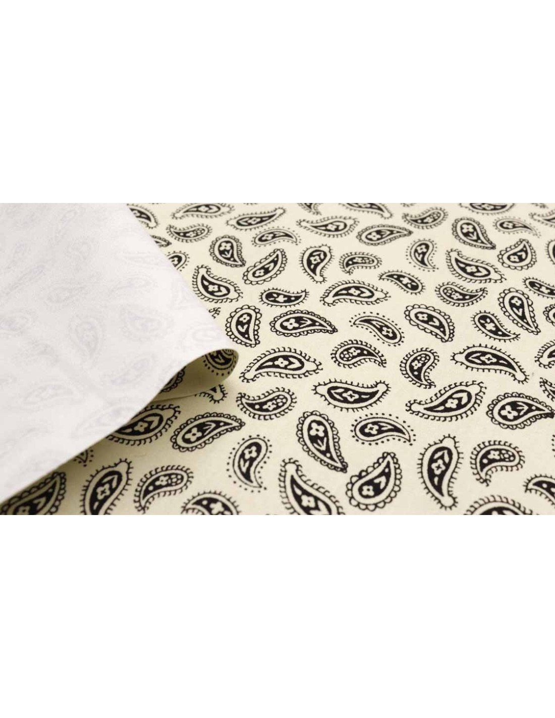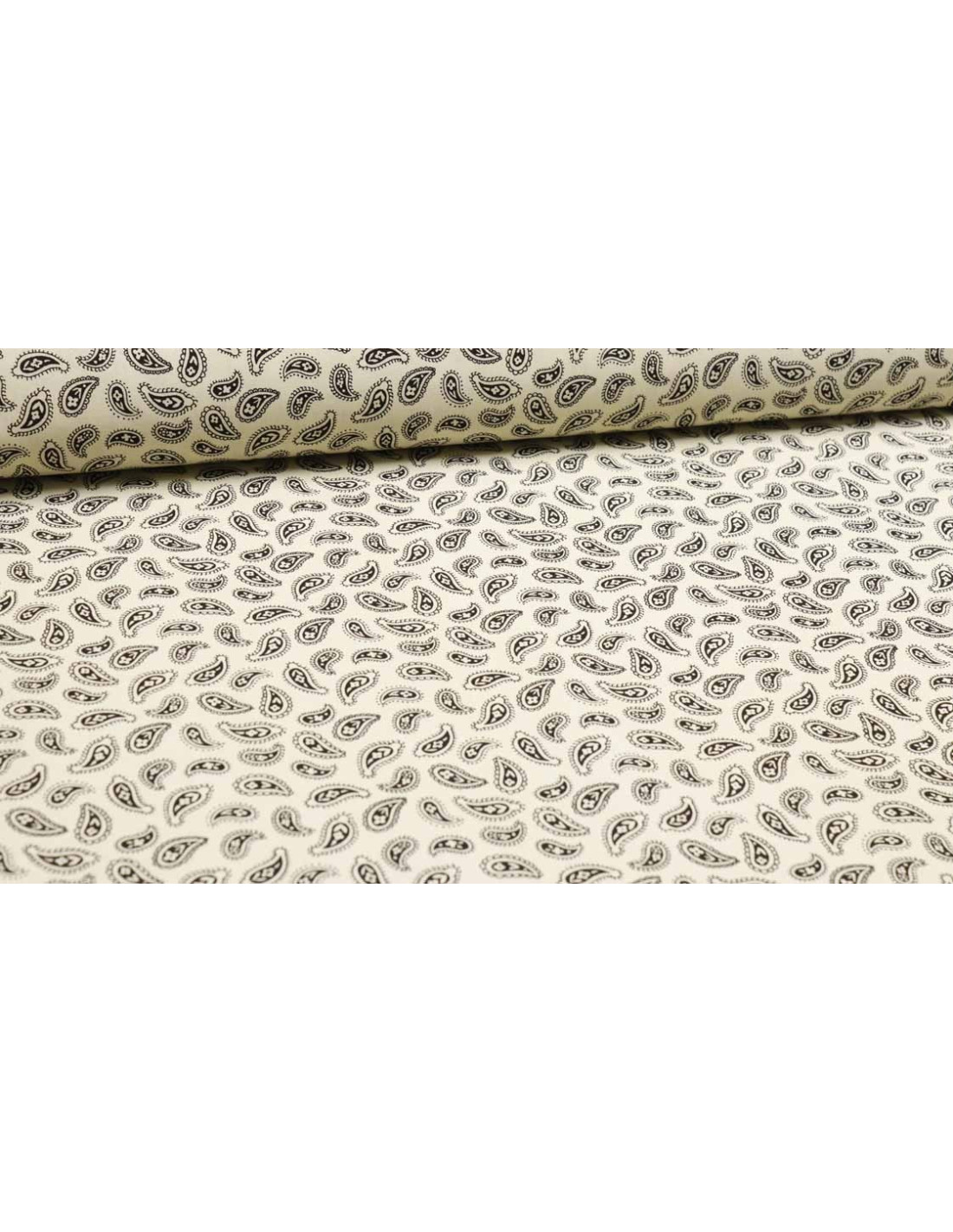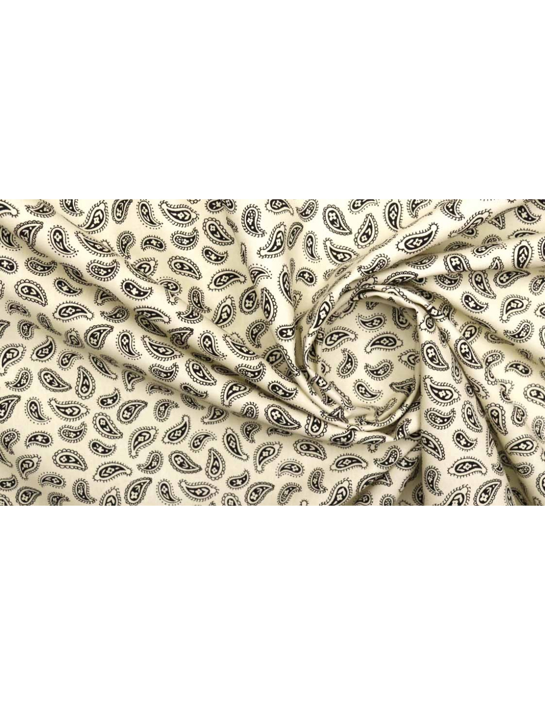Popelín Algodón Beige Cachemiras, tejido de gran suavidad, con cuerpo y de calidad. Tejido con estampaciones de bonitas cachemiras en color negro. Tejido fácil de coser ya que no ofrece resistencia, utilizado para todo tipos de confecciones como; (camisas, vestidos, manualidades, mascarillas, etc…).