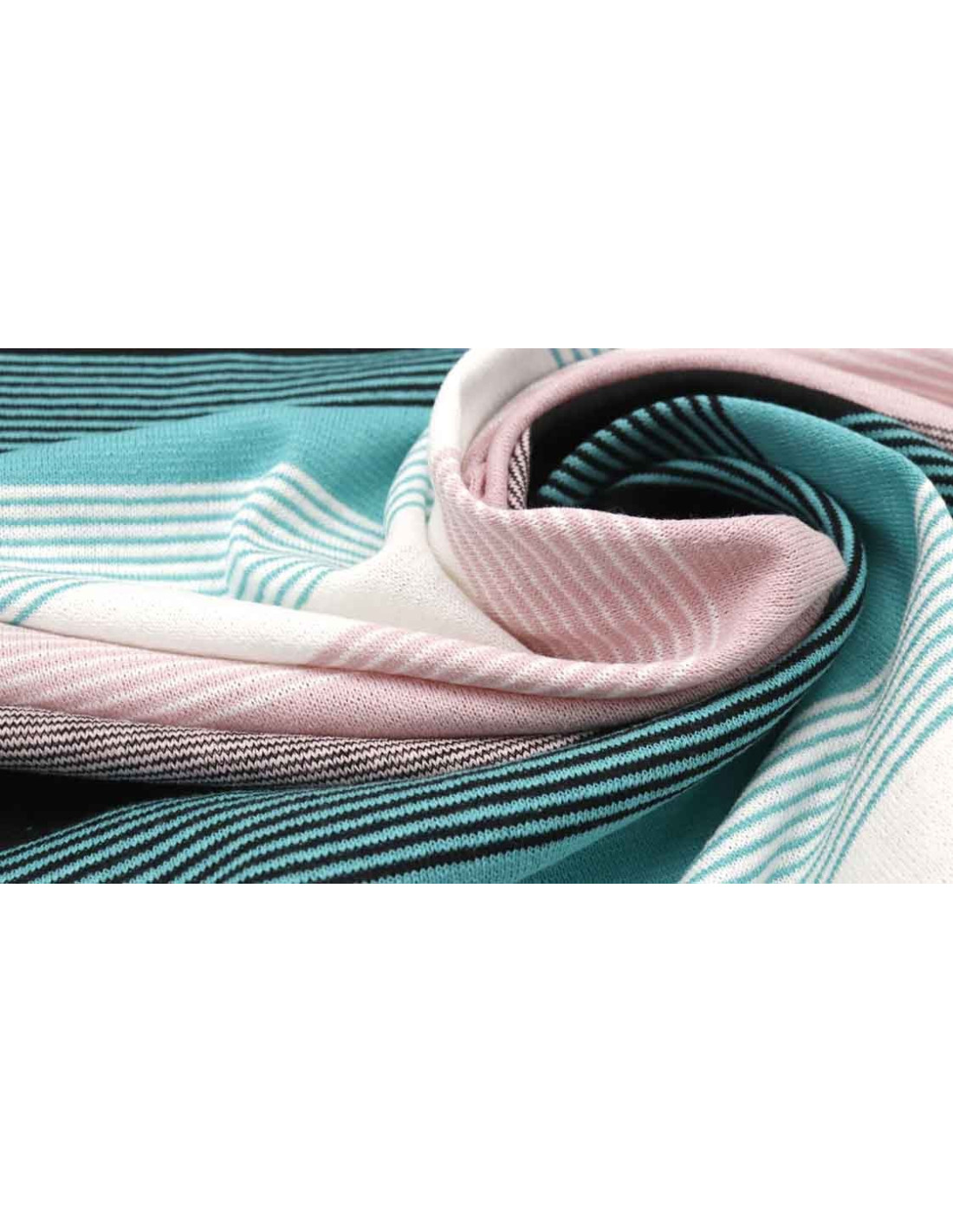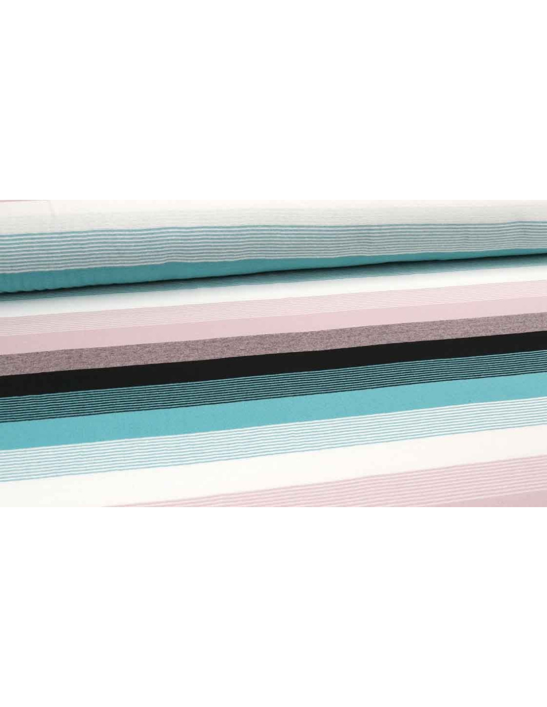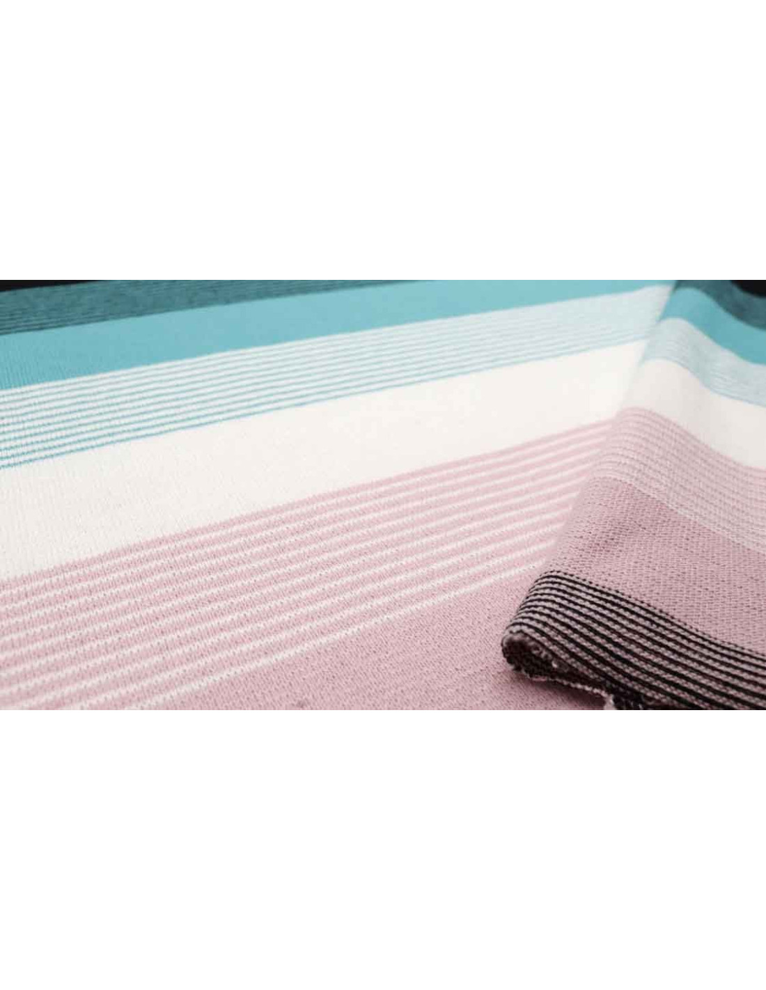 Punto Hilo Rayas Rosa Sandi, maravilloso punto en hilo, con gran suavidad, elasticidad y un estilo en tonalidades de rayas ideales predominando los tonos pasteles. Es un tejido con cierta finura en rayas de diferentes tamaños. En nuestras imágenes podréis apreciar el grosor de ella y su revés. Es un punto de gran utilidad y de infinidad de proyectos, sobre todo de moda; camisetas, vestidos, monos, pantalones, etc...