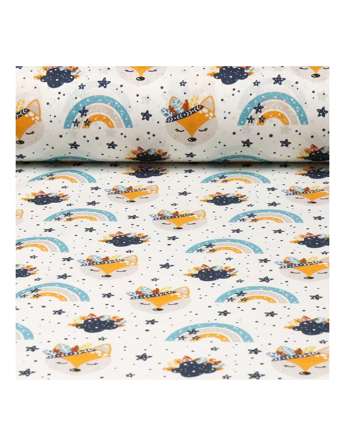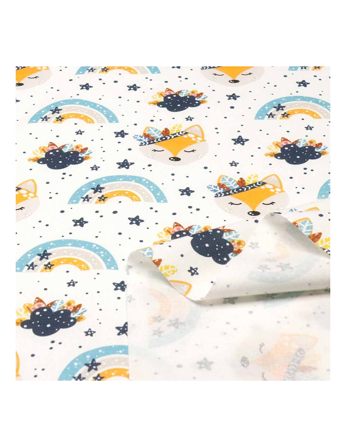 ¡Bienvenido/a a nuestro catálogo de telas! Si estás buscando una tela suave, 100% Algodón y con un diseño encantador, ¡nuestra tela de fondo blanco roto con estampados de zorros y arcoíris es la elección perfecta para ti! Aquí te presentamos sus características principales: