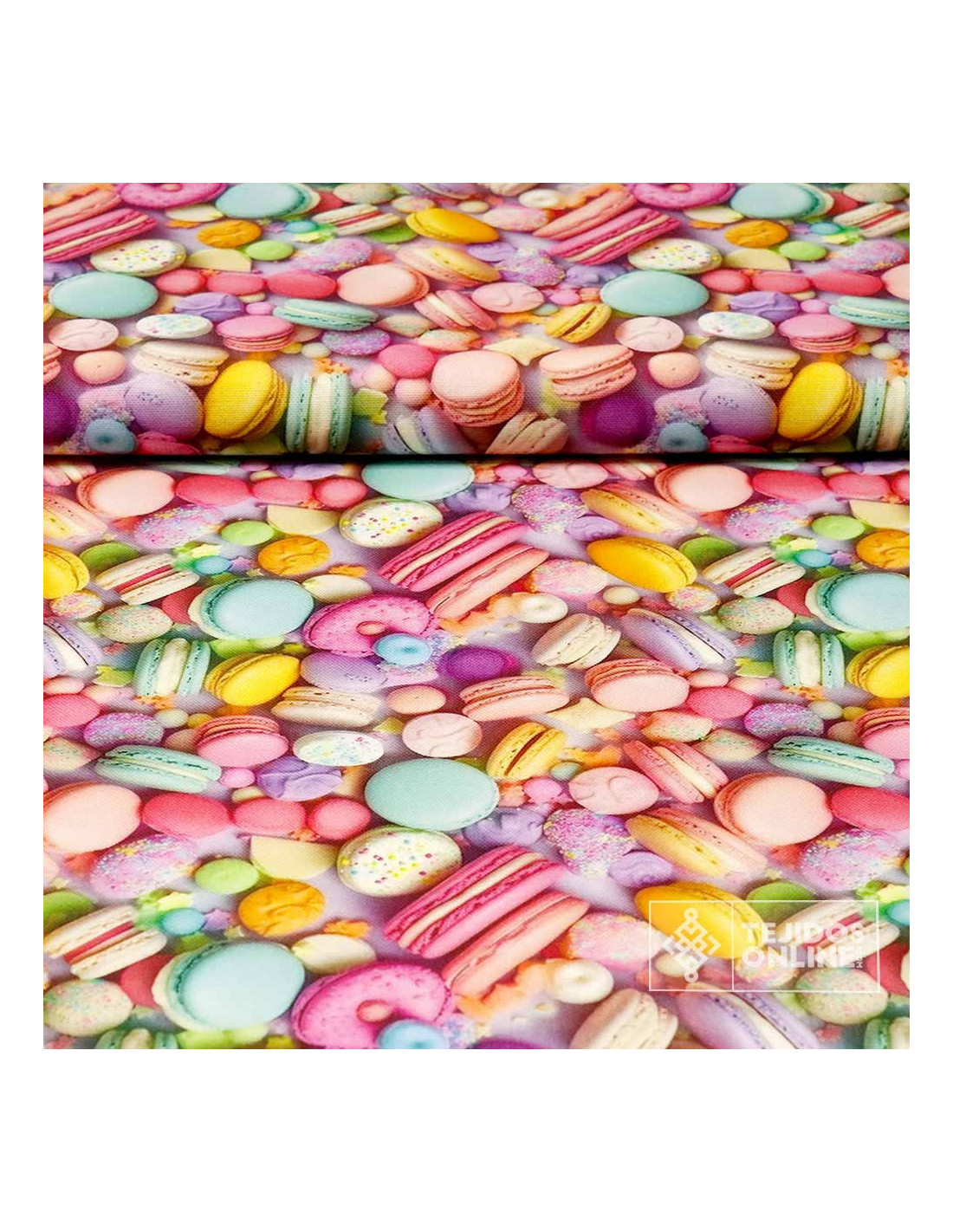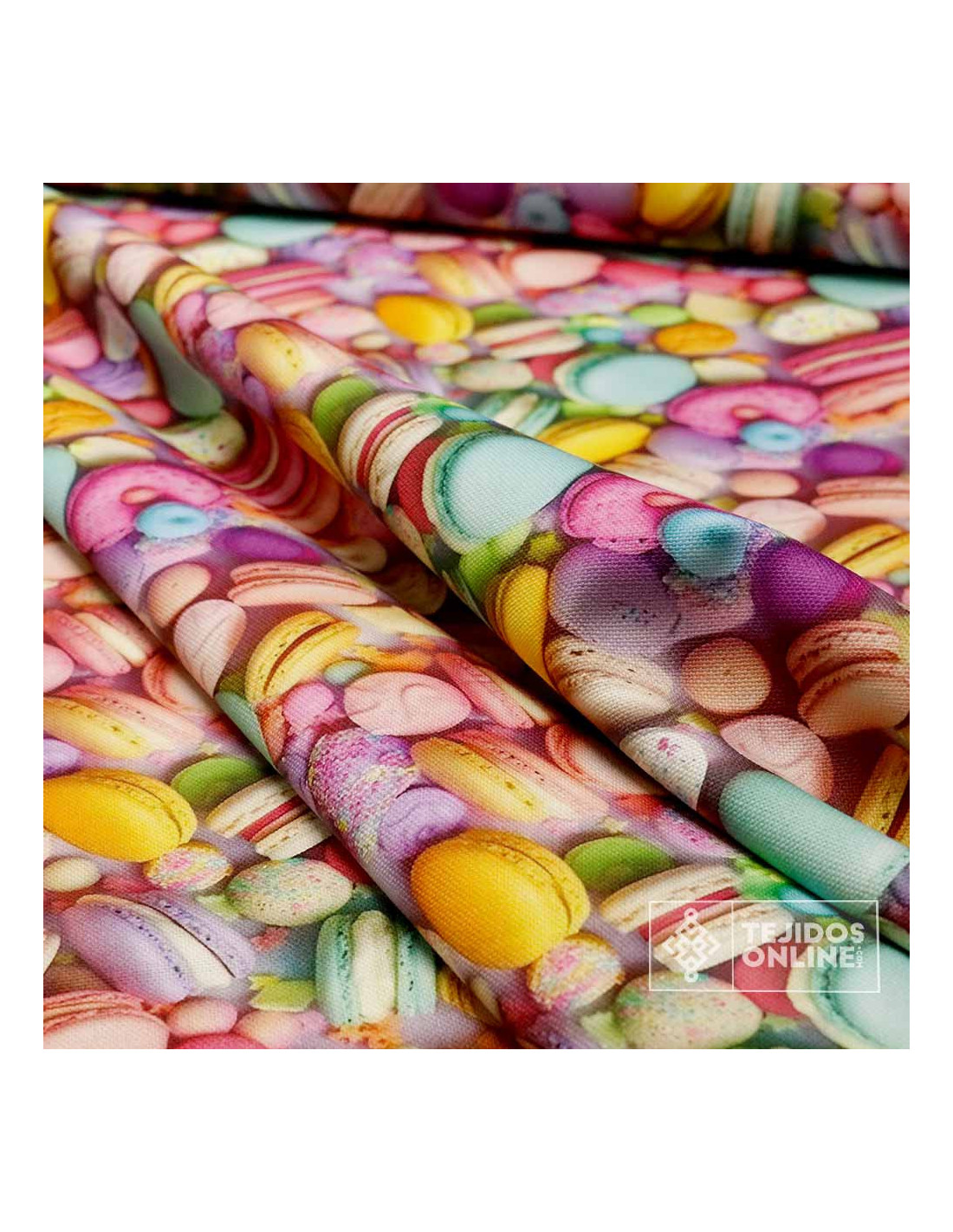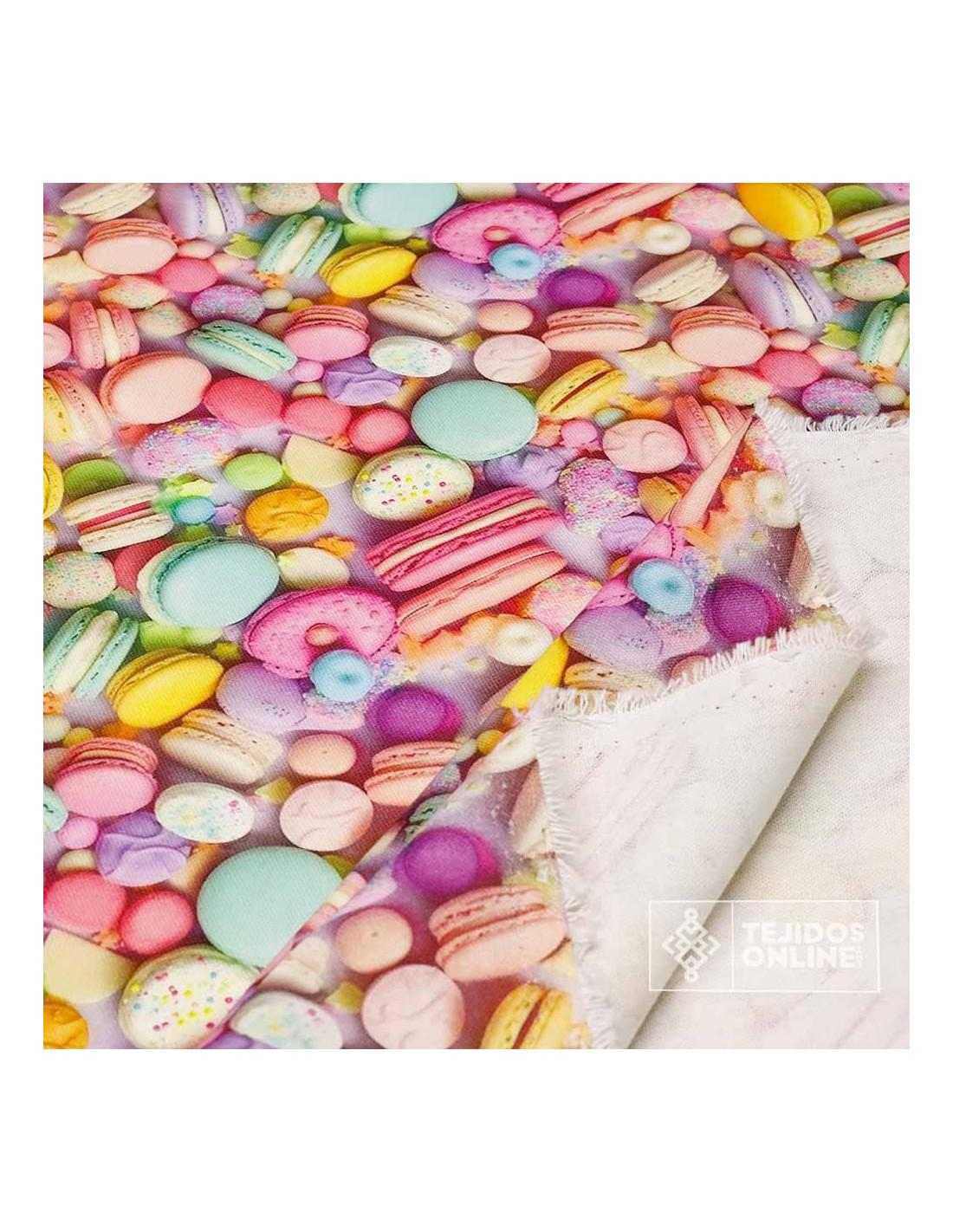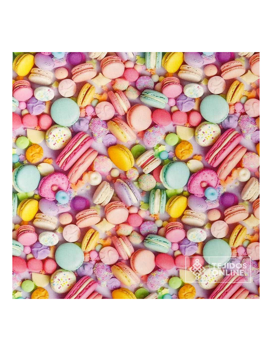 Colorida tela asargada de algodón y poliéster con un divertido estampado digital de macarons, chuches, donuts y caramelos en tonos pastel. Este diseño encantador es ideal para quienes buscan un tejido con personalidad, alegre y lleno de color. Con 1,48 metros de ancho, es un tejido doble de ancho, muy práctico para proyectos amplios. Tiene un peso aproximado de 160 gr/m² y un tacto suave, sin elasticidad. El dibujo mayor mide aproximadamente 4 cm, lo que permite que cada detalle resalte con nitidez.